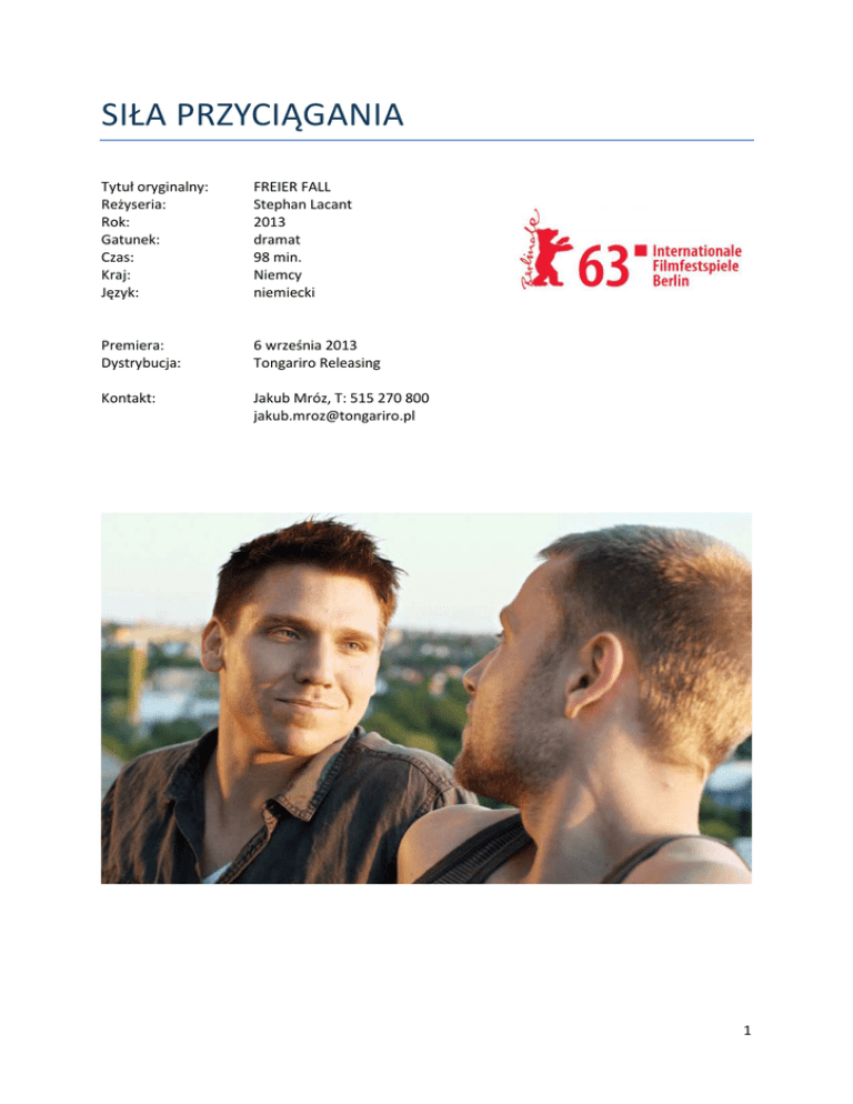 SIŁA PRZYCIĄGANIA Tytuł oryginalny: Reżyseria: Rok: Gatunek: Czas: Kraj: Język: FREIER FALL Stephan Lacant 2013 dramat 98 min. Niemcy niemiecki Premiera: Dystrybucja: 6 września 2013 Tongariro Releasing Kontakt: Jakub Mróz, T: 515 270 800 [email protected] 1 STRESZCZENIE Życie Marca wydaje się dobrze poukładane. Obiecująca kariera w policji, kochająca narzeczona, własne mieszkanie. Wkrótce ma zostać ojcem. Jednak pewnego dnia w szkole policyjnej pojawia się nowy kadet – Kay Engel. Podczas wspólnych treningów Marc zaczyna doświadczać nieznanej wcześniej swobody i wolności, a także tego, czym jest uczucie wobec innego mężczyzny. Marc staje się rozdarty między rodziną a nowymi emocjami. Coraz wyraźniej czuje, że życie wymyka mu się spod kontroli. Kiedy jego świat się wali, Marc uświadamia sobie, że nie jest w stanie wszystkich uszczęśliwić. „Siła przyciągania” to przykład świeżego, mocnego, nowego kina niemieckiego. Doskonali aktorzy Hanno Koffler („Letnia burza”), Max Riemelt (Nagroda dla Najlepszego Aktora w Karlowych Warach za film „Fabryka zła”) oraz Katharina Schuettler („The Promise”) stworzyli emocjonującą opowieść dobitnie pokazującą, co się dzieje, kiedy życie się rozpada i nie jest się w stanie dać szczęścia osobom, które się kocha. 2 OD REŻYSERA Współautor scenariusza Karsten Dahlem opowiedział mi kiedyś o przypadkach znęcania się nad homoseksualnymi kolegami, które zauważył podczas szkolenia policyjnego. Postanowiliśmy wtedy opowiedzieć o tym problemie w filmie. Pomimo widocznych na zewnątrz reform, policja w dalszym ciągu tkwi w konserwatywnej, zdominowanej przez mężczyzn strukturze. Cieszę się, że dzięki materiałom, które zebraliśmy, udało nam się poprowadzić fabułę filmu inaczej, niż to mogło być oczekiwane. W środku ciężkości nie umieściliśmy miłości nędzy dwoma mężczyznami dziejącej się w środowisku, w którym bycie gejem jest całkowitym tabu. Położyliśmy raczej nacisk na rozdarcie Marca między pragnieniami i wartościami, których nie był w stanie pogodzić. Z jednej strony szczęście rodzinne, ojcostwo i związek z Bettiną, z drugiej rodząca się miłość do Kaya. Oczywiście ten film porusza temat homoseksualizmu, natomiast ja chciałem przede wszystkim mówić o archetypicznym konflikcie między miłością i nienawiścią, odrzuceniem i odkrywaniem siebie. Chciałem spróbować zrozumieć moich bohaterów, z ich nadziejami i lękami. 3 Obsada Hanno Koffler: Max Riemelt: Katharina Schüttler: Oliver Bröcker: Stephanie Schönfeld: Britta Hammelstein: Shenja Lacher: Maren Kroymann: Luis Lamprecht: Vilmar Bieri: Attila Borlan: Horst Krebs: Samuel Schnepf: Marc Borgmann Kay Engel Bettina Bischoff Frank Richter Claudia Richter Britt Rebmann Gregor Limpinski Inge Borgmann Wolfgang Borgmann Lothar Bischoff Werner Brandt Bernd Eiden Benno Borgmann Ekipa Reżyseria: Scenariusz: Zdjęcia: Dźwięk: Scenografia: Kostiumy: Make-up: Montaż: Muzyka: Sounddesign: Kierownictwo produkcji: Produkcja: Stephan Lacant Stephan Lacant, Karsten Dahlem Sten Mende Christoph Schilling Petra Bock-Hofbauer Bettina Marx Dana Bieler, Nicole Durovic Monika Schindler Dürbeck & Dohmen Jörg Klaussner Konstantinos Kapsalos Daniel Reich, Christoph Holthof 4 CYTATY Z RECENZJI „Hanno Koffler i Max Riemelt to nowa wymarzona para niemieckiego kina.” (RBB Radio Eins) „SIŁA PRZYCIĄGANIA to niemiecka odpowiedź na TAJEMNICĘ BROKEBACK MOUNTAIN!” (3sat) „Utrata hamulców, atrakcyjność nowych przeżyć, miłość i wszystkie tego konsekwencje. Lacant sprawnie tka tę skomplikowaną sieć emocji, której niespodziewane zwieńczenie jest najpiękniejsze. A kiedy Max Riemelt i Hanno Koffler namiętnie się całują, można im uwierzyć.” („Die Tageszeitung”) „Uczuciowy mętlik w homofobicznym, małomiasteczkowym światku, świetnie opowiedziany i zagrany aż po sam nieuchronny finał historii.” (Der Tagesspiegel) „SIŁA PRZYCIĄGANIA robi wrażenie doskonale uchwyconą zmysłowością, mistrzowską swobodą dialogów i poruszającymi kreacjami nawet drugoplanowych aktorów.” (Frankfurter Allgemeine Zeitung) „Film pozostawiający trwałe wrażenie. Bohaterowie zdają się ciągle biec, jakby to było jedynym sensem ich życia. Lacant za pomocą subtelnych środków pokazuje nam niespodziewany wybuch uczucia, rozstanie, pożądanie i rozpacz. Dzięki scenariuszowi, montażowi Moniki Schindler, świetnym ujęciom męskich pocałunków, a przede wszystkim głównym aktorom Hanno Kofflerowi i Maxowi Riemeltowi, skrywany temat homofobii i antygejowskiej przemocy w policji zostaje podniesiony w wyjątkowo udany sposób.” (Player) 5 STEPHAN LACANT – REŻYSER Urodził się w 1972 roku w Essen. Po maturze studiował wiedzę o teatrze, filmie i telewizji w Bochum oraz Kolonii. Następnie przeniósł się do Stanów Zjednoczonych, gdzie podczas kilkuletniego pobytu w Nowym Jorku ukończył kurs reżyserii w Konserwatorium Aktorskim im. Stelli Adler oraz studia w Nowojorskiej Akademii Filmowej. Swój warsztat doskonalił następnie podczas seminarium scenopisarstwa im. Franka Daniela, seminariów reżyserskich Judith Weston i programu dla scenarzystów w Międzynarodowej Szkole Filmowej w Kolonii. Wziął także udział w Kampusie Talentów w ramach Berlinale. W swojej karierze scenarzysty i reżysera stworzył kilka filmów krótkometrażowych i dokumentalnych, prezentowanych na międzynarodowych festiwalach. „Siła przyciągania”, wyprodukowana w ramach serii „Debiut po trzydziestce” przez niemieckiego regionalnego nadawcę publicznego SWR oraz firmę kurhaus production, jest jego pełnometrażowym debiutem. Stephan Lacant mieszka i pracuje w Berlinie. Obecnie zajmuje się reżyserią filmu fabularnego „Fremde Tochter” produkcji SWR/kurhaus production, którego jest także współscenarzystą razem z Karstenem Dahlemem. FILMOGRAFIA (scenariusz i re