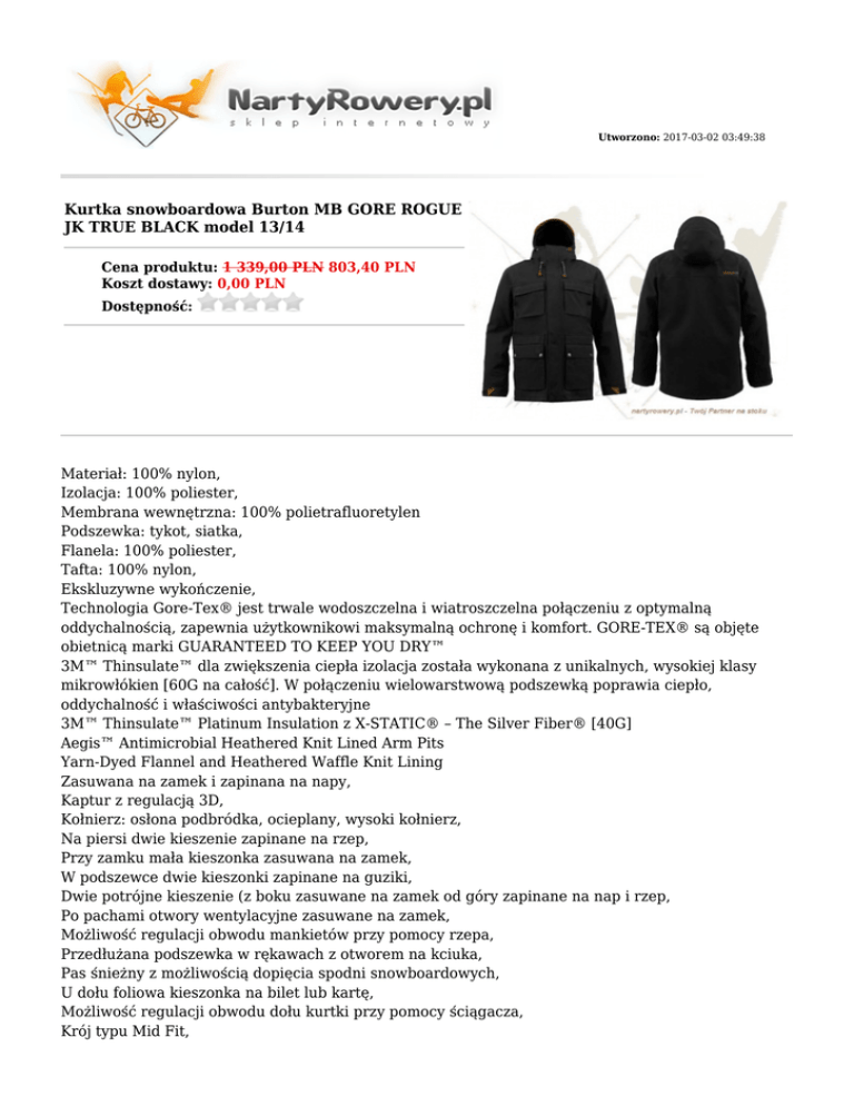 Utworzono: 2017-03-02 03:49:38 Kurtka snowboardowa Burton MB GORE ROGUE JK TRUE BLACK model 13/14 Cena produktu: 1 339,00 PLN 803,40 PLN Koszt dostawy: 0,00 PLN Dostępność: Materiał: 100% nylon, Izolacja: 100% poliester, Membrana wewnętrzna: 100% polietrafluoretylen Podszewka: tykot, siatka, Flanela: 100% poliester, Tafta: 100% nylon, Ekskluzywne wykończenie, Technologia Gore-Tex® jest trwale wodoszczelna i wiatroszczelna połączeniu z optymalną oddychalnością, zapewnia użytkownikowi maksymalną ochronę i komfort. GORE-TEX® są objęte obietnicą marki GUARANTEED TO KEEP YOU DRY™ 3M™ Thinsulate™ dla zwiększenia ciepła izolacja została wykonana z unikalnych, wysokiej klasy mikrowłókien [60G na całość]. W połączeniu wielowarstwową podszewką poprawia ciepło, oddychalność i właściwości antybakteryjne 3M™ Thinsulate™ Platinum Insulation z X-STATIC® – The Silver Fiber® [40G] Aegis™ Antimicrobial Heathered Knit Lined Arm Pits Yarn-Dyed Flannel and Heathered Waffle Knit Lining Zasuwana na zamek i zapinana na napy, Kaptur z regulacją 3D, Kołnierz: osłona podbródka, ocieplany, wysoki kołnierz, Na piersi dwie kieszenie zapinane na rzep, Przy zamku mała kieszonka zasuwana na zamek, W podszewce dwie kieszonki zapinane na guziki, Dwie potrójne kieszenie (z boku zasuwane na zamek od góry zapinane na nap i rzep, Po pachami otwory wentylacyjne zasuwane na zamek, Możliwość regulacji obwodu mankietów przy pomocy rzepa, Przedłużana podszewka w rękawach z otworem na kciuka, Pas śnieżny z możliwością dopięcia spodni snowboardowych, U dołu foliowa kieszonka na bilet lub kartę, Możliwość regulacji obwodu dołu kurtki przy pomocy ściągacza, Krój typu Mid Fit, Płeć Męska Producent Burton Rozmiary XS, S, M Wodoodporność Kolory Kolekcja Adres: http://nartyrowery.pl/ powyżej 15000 mm Czarny zima 2013/14 Telefon: 34 365 66 09 Email: [email protected] Gadu-Gadu: Skype: