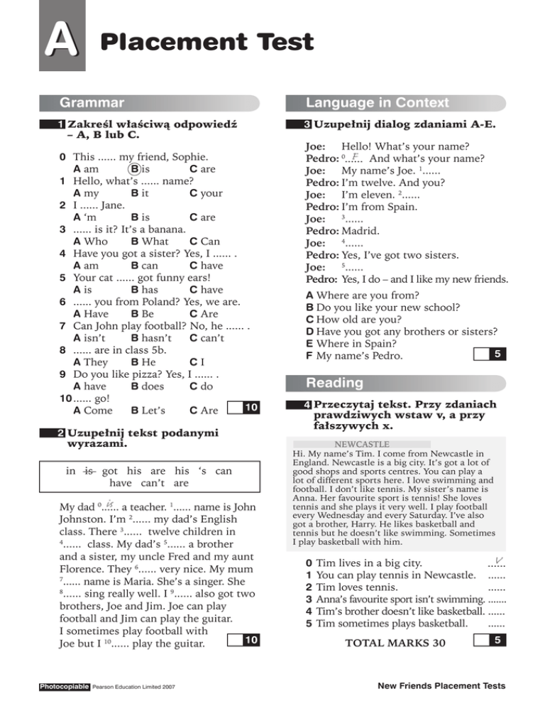 A Placement Test Grammar Language in Context 1 Zakreśl właściwą odpowiedź – A, B lub C. 3 Uzupełnij dialog zdaniami A-E. 0 This ...... my friend, Sophie. A am B is C are 1 Hello, what’s ...... name? A my B it C your 2 I ...... Jane. A ‘m B is C are 3 ...... is it? It’s a banana. A Who B What C Can 4 Have you got a sister? Yes, I ...... . A am B can C have 5 Your cat ...... got funny ears! A is B has C have 6 ...... you from Poland? Yes, we are. A Have B Be C Are 7 Can John play football? No, he ...... . A isn’t B hasn’t C can’t 8 ...... are in class 5b. A They B He CI 9 Do you like pizza? Yes, I ...... . A have B does C do 10...... go! 10 A Come B Let’s C Are 2 Uzupełnij tekst podanymi wyrazami. in is got his are his ‘s can have can’t are is a teacher. 1...... name is John My dad 0...... Johnston. I’m 2...... my dad’s English class. There 3...... twelve children in 4 ...... class. My dad’s 5...... a brother and a sister, my uncle Fred and my aunt Florence. They 6...... very nice. My mum 7 ...... name is Maria. She’s a singer. She 8 ...... sing really well. I 9...... also got two brothers, Joe and Jim. Joe can play football and Jim can play the guitar. I sometimes play football with 10 Joe but I 10...... play the guitar. Photocopiable Pearson Education Limited 2007 Joe: Hello! What’s your name? Pedro:0...... F And what’s your name? Joe: My name’s Joe. 1...... Pedro:I’m twelve. And you? Joe: I’m eleven. 2...... Pedro:I’m from Spain. Joe: 3...... Pedro:Madrid. Joe: 4...... Pedro:Yes, I’ve got two sisters. Joe: 5...... Pedro:Yes, I do – and I like my new friends. AWhere are you from? BDo you like your new school? CHow old are you? DHave you got any brothers or sisters? EWhere in Spain? 5 FMy name’s Pedro. Reading 4 Przeczytaj tekst. Przy zdaniach prawdziwych wstaw v, a przy fałszywych x. Newcastle Hi. My name’s Tim. I come from Newcastle in England. Newcastle is a big city. It’s got a lot of good shops and sports centres. You can play a lot of different sports here. I love swimming and football. I don’t like tennis. My sister’s name is Anna. Her favourite sport is tennis! She loves tennis and she plays it very well. I play football every Wednesday and every Saturday. I’ve also got a brother, Harry. He likes basketball and tennis but he doesn’t like swimming. Sometimes I play basketball with him. 0Tim lives in a big city. V ...... 1You can play tennis in Newcastle. ...... 2Tim loves tennis. ...... 3Anna’s favourite sport isn’t swimming........ 4Tim’s brother doesn’t like basketball....... 5Tim sometimes plays basketball. ...... Total marks 30 5 New Friends Placement Tests B Placement Test Grammar Language in Context 1 Zakreśl właściwą odpowiedź – A, B lub C. 3 Uzupełnij dialog zdaniami A-E. 0 Your dog ...... got beautiful eyes! A is B has C have 1 ...... is it? It’s an apple. A Who B What C Can 2 ...... are new. A They B He CI 3 This ...... my sister, Anne. A am B is C are 4 Have you got a brother? Yes, I ...... . A am B can C have 5 Do you like chips? Yes, I ...... . A have B does C do 6 ...... you from Spain? Yes, we are. A Have B Be C Are 7 I ...... Jane. A ‘m B is C are 8 ...... play! A Are B Let’s C Come 9 Can John play tennis? No, he ...... . A isn’t B hasn’t C can’t 10Hello, what’s ...... name? 10 A my B it C your 2 Uzupełnij tekst podanymi wyrazami. in is my got her plays name can every great there is a teacher. 1...... name My aunt 0...... is Jenny Graeme. I’m 2...... my aunt’s French class. 3...... are twelve children in her class. My aunt is 4...... mum’s sister. She is very nice. My mum’s 5...... is Maria. She’s a singer. I have 6...... two sisters, Nina and Lola. Nina is a 7...... dancer. Lola 8...... the drums and sings. I 9...... sing too. We are in a pop group! We sing and play 10...... 10 Saturday. Joe: Hello! What’s your name? Pedro:0...... F And what’s your name? Joe: My name’s Joe. 1...... Pedro:I’m twelve. And you? Joe: I’m eleven. 2...... Pedro:I’m from England. Joe: 3...... Pedro:Oxford. Joe: 4...... Pedro:No, it isn’t. But it’s very nice. Joe: 5...... Pedro:Yes, I do – and I like my new friends. AWhere are you from? BDo you like your new school? CHow old are you? DWhere in England? EIs it big? FMy name’s Jason. 5 Reading 4 Przeczytaj tekst. Przy zdaniach prawdziwych wstaw v, a przy fałszywych x. Liverpool Hi. My name’s Tina. I am from Liverpool in England. Liverpool is a big city. It’s got a lot of good shops and sports centres. You can play a lot of sports here. I play tennis every Friday and football every Monday. I don’t like swimming. My brother’s name is Alan. His favourite sport is tennis! He plays tennis every day! I’ve also got a sister, Harriet. She likes basketball and tennis but she doesn’t like swimming. Sometimes I play basketball with her. V 0Liverpool is big. ...... 1Liverpool hasn’t got a lot of shops....... 2There are sports centres in Liverpool....... 3Tina plays tennis every Wednesday....... 4Tina’s brother likes tennis. ...... 5Harriet doesn’t like basketball. ...... 5 Total marks 30 New Friends Placement Tests Pearson Education Limited 2007 Photocopiable •Testy kwalifikujące do odpowiedniego poziomu nauczania (Placement Tests). Testy kwalifikujące do odpowiedniego poziomu nauczania pomagają ocenić, czy uczniowie opanowali język angielski na tyle, aby rozpocząć kurs New Friends 2, czy też powinni przejść najpierw przez poziom New Friends 1. Aby pewnie przejść z poprzednich kursów do kursu New Friends 2, uczniowie muszą uzyskać minimum 26 punktów w teście kwalifikującym. Jeśli wynik zawiera się między 18 a 25 punktami, można zdecydować się na przejście do New Friends 2, pamiętając, że uczniowie będą musieli bardzo dokładnie przerobić materiał zawarty w lekcjach wstępnych (Starting Point) i że będą potrzebowali dodatkowych ćwiczeń z gramatyki i słownictwa wprowadzane