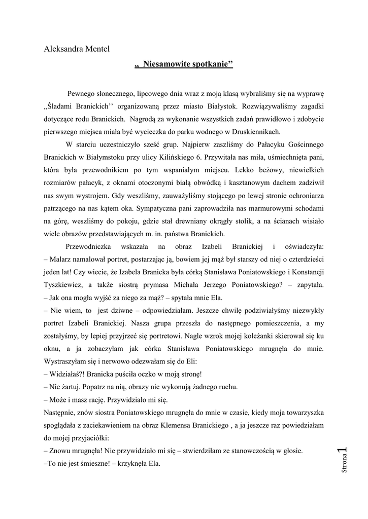 Aleksandra Mentel ,, Niesamowite spotkanie’’ Pewnego słonecznego, lipcowego dnia wraz z moją klasą wybraliśmy się na wyprawę ,,Śladami Branickich’’ organizowaną przez miasto Białystok. Rozwiązywaliśmy zagadki dotyczące rodu Branickich. Nagrodą za wykonanie wszystkich zadań prawidłowo i zdobycie pierwszego miejsca miała być wycieczka do parku wodnego w Druskiennikach. W starciu uczestniczyło sześć grup. Najpierw zaszliśmy do Pałacyku Gościnnego Branickich w Białymstoku przy ulicy Kilińskiego 6. Przywitała nas miła, uśmiechnięta pani, która była przewodnikiem po tym wspaniałym miejscu. Lekko beżowy, niewielkich rozmiarów pałacyk, z oknami otoczonymi białą obwódką i kasztanowym dachem zadziwił nas swym wystrojem. Gdy weszliśmy, zauważyliśmy stojącego po lewej stronie ochroniarza patrzącego na nas kątem oka. Sympatyczna pani zaprowadziła nas marmurowymi schodami na górę, weszliśmy do pokoju, gdzie stał drewniany okrągły stolik, a na ścianach wisiało wiele obrazów przedstawiających m. in. państwa Branickich. Przewodniczka wskazała na obraz Izabeli Branickiej i oświadczyła: – Malarz namalował portret, postarzając ją, bowiem jej mąż był starszy od niej o czterdzieści jeden lat! Czy wiecie, że Izabela Branicka była córką Stanisława Poniatowskiego i Konstancji Tyszkiewicz, a także siostrą prymasa Michała Jerzego Poniatowskiego? – zapytała. – Jak ona mogła wyjść za niego za mąż? – spytała mnie Ela. – Nie wiem, to jest dziwne – odpowiedziałam. Jeszcze chwilę podziwiałyśmy niezwykły portret Izabeli Branickiej. Nasza grupa przeszła do następnego pomieszczenia, a my zostałyśmy, by lepiej przyjrzeć się portretowi. Nagle wzrok mojej koleżanki skierował się ku oknu, a ja zobaczyłam jak córka Stanisława Poniatowskiego mrugnęła do mnie. Wystraszyłam się i nerwowo odezwałam się do Eli: – Widziałaś?! Branicka puściła oczko w moją stronę! – Nie żartuj. Popatrz na nią, obrazy nie wykonują żadnego ruchu. – Może i masz rację. Przywidziało mi się. Następnie, znów siostra Poniatowskiego mrugnęła do mnie w czasie, kiedy moja towarzyszka spoglądała z zaciekawieniem na obraz Klemensa Branickiego , a ja jeszcze raz powiedziałam –To nie jest śmieszne! – krzyknęła Ela. Strona – Znowu mrugnęła! Nie przywidziało mi się – stwierdziłam ze stanowczością w głosie. 1 do mojej przyjaciółki: Wtedy obydwie spojrzałyśmy na portret Izabeli, a ona jakby żywa wyskoczyła z dzieła sztuki. Miała siwe włosy zaplecione w prześliczny warkocz z zieloną wstążeczką. Twarz trójkątna, blada, nos duży, orli. Oczy małe niebieskie, pełne spokoju. Miała chudziutkie, delikatne ręce, zgrabną sylwetkę. Ubrana była w cudowną suknię z wielkimi falbanami ozdobioną różyczkami w kolorze biało-zielonym. Wtedy delikatnym, przyjaznym głosem oświadczyła nam: – Nie bójcie się i nie odchodźcie! Tak długo siedziałam w tym obrazie, ale dziś jest wyjątkowy dzień – 1 lipca, moje urodziny! Ela i ja popatrzyłyśmy na siebie zdumione i zmieszane, lecz postanowiłyśmy wysłuchać opowieści damy z obrazu. – Mam pomysł! Słyszałam, że rozwiązujecie zagadki o moim rodzie, a nagroda motywuje was do pracy. Ja pomogę wam, a wy mi. Zgoda? – rzekła. – Jak my możemy ci pomóc? – zapytałam. – Wiem, że wiele się zmieniło od tylu wieków. Spostrzegam to po ubiorze i zachowaniu ludzi. Chcę zobaczyć godne zwiedzenia, według was, miejsca w Białymstoku – powiedziała Branicka. – Wie pani, że mamy niewiele godzin, by zwiedzić ciekawe miejsca? Czy zdążymy przed pierwszą drużyną?! – zaniepokoiła się Ela. – Zdążycie! Macie moje słowo! Nie oszukam was i nie zawiodę! – obiecała. – Dobrze. – zgodziłyśmy się. Postanowiłyśmy pokazać Izabeli rynek, bo to najbardziej znane miejsce w Białymstoku. Widziałam, jak Branicka, zaciekawiona, rozgląda się wokół siebie. Bardzo mnie zdziwiło, że ludzie nie patrzyli się na nas. Czułyśmy się jak niewidzialne, przezroczyste. – Czym są te dziwne pojazdy: zielone, długie oraz te mniejsze różnokolorowe ? – zapytała Izabela. – Te duże zielone są autobusami, płacimy za bilet niewielką kwotę i jedziemy prawie wszędzie. Zatrzymują się przy przystankach, by ludzie dążący do danego celu mogli wysiąść w odpowiednim miejscu. Te mniejsze – to samochody osobowe, przeznaczone tylko do jazdy dla kilku osób – wyjaśniałyśmy. – Pewnie w waszych zadaniach jest napisane coś o moim małżeństwie z Klemensem – niespodziewanie stwierdziła Izabela – Opowiem wam krótką historyjkę na ten temat. Branicki – Ale cudowny kościół, mogę zobaczyć go w środku? – spytała Branicka, patrząc na katedrę. – Pewnie. Chodźmy. – zgodziłam się. Strona – Wpisz to jako odpowiedzi do zadań numer 2 i 4 – szepnęła do mnie Ela. 2 zawarł ze mną związek małżeński w 1748 roku. Byłam jego trzecią żoną. obejrzeniu Po – Czym są te kościoła, dziwne udałyśmy przedmioty z się do obrazami? – Pałacu zaciekawiła Branickich. się Izabela – Telefony komórkowe, dzięki nim kontaktujemy się na odległość z bliskimi i znajomymi. Możemy robić nimi zdjęcia, słuchać muzyki i robić wiele innych rzeczy – odpowiedziała Ela. – O! A zrobimy wspólną fotografię? – poprosiła Branicka. – Jasne! – Zaśmiałam się. Pamiątkowe zdjęcie było bardzo śmieszne, najpierw Branicka myślała, że to lustro, lecz po wytłumaczeniu, zrozumiała zasadę, na której opiera się fotografia. – A cóż to za dziwny obraz, który się porusza? Z jakąś reklamą Facebook. – zapytała Izabela – Telebim – odpowiedziałam – na nim są prezentacje różnych produktów. Facebook to portal społecznościowy, większość ludzi go ma. Wrzucamy tam zdjęcia, opisy, różne ciekawe informacje o nas – wyjaśniałyśmy. – Szkoda, że ja go nie 
