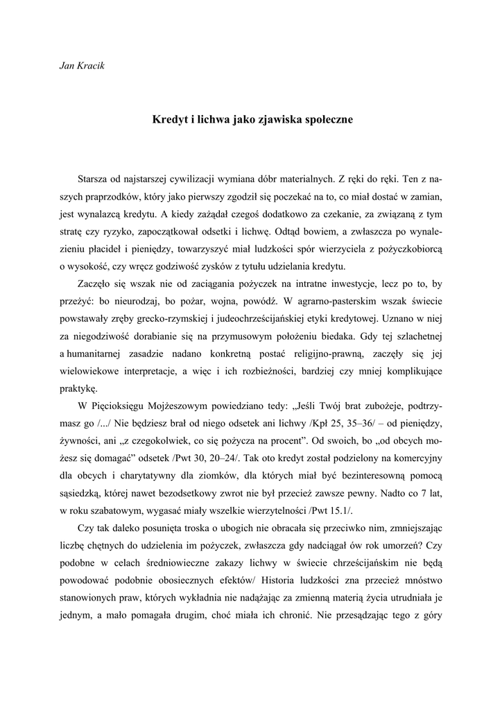 Jan Kracik Kredyt i lichwa jako zjawiska społeczne Starsza od najstarszej cywilizacji wymiana dóbr materialnych. Z ręki do ręki. Ten z naszych praprzodków, który jako pierwszy zgodził się poczekać na to, co miał dostać w zamian, jest wynalazcą kredytu. A kiedy zażądał czegoś dodatkowo za czekanie, za związaną z tym stratę czy ryzyko, zapoczątkował odsetki i lichwę. Odtąd bowiem, a zwłaszcza po wynalezieniu płacideł i pieniędzy, towarzyszyć miał ludzkości spór wierzyciela z pożyczkobiorcą o wysokość, czy wręcz godziwość zysków z tytułu udzielania kredytu. Zaczęło się wszak nie od zaciągania pożyczek na intratne inwestycje, lecz po to, by przeżyć: bo nieurodzaj, bo pożar, wojna, powódź. W agrarno-pasterskim wszak świecie powstawały zręby grecko-rzymskiej i judeochrześcijańskiej etyki kredytowej. Uznano w niej za niegodziwość dorabianie się na przymusowym położeniu biedaka. Gdy tej szlachetnej a humanitarnej zasadzie nadano konkretną postać religijno-prawną, zaczęły się jej wielowiekowe interpretacje, a więc i ich rozbieżności, bardziej czy mniej komplikujące praktykę. W Pięcioksięgu Mojżeszowym powiedziano tedy: „Jeśli Twój brat zubożeje, podtrzymasz go /.../ Nie będziesz brał od niego odsetek ani lichwy /Kpł 25, 35–36/ – od pieniędzy, żywności, ani „z czegokolwiek, co się pożycza na procent”. Od swoich, bo „od obcych możesz się domagać” odsetek /Pwt 30, 20–24/. Tak oto kredyt został podzielony na komercyjny dla obcych i charytatywny dla ziomków, dla których miał być bezinteresowną pomocą sąsiedzką, której nawet bezodsetkowy zwrot nie był przecież zawsze pewny. Nadto co 7 lat, w roku szabatowym, wygasać miały wszelkie wierzytelności /Pwt 15.1/. Czy tak daleko posunięta troska o ubogich nie obracała się przeciwko nim, zmniejszając liczbę chętnych do udzielenia im pożyczek, zwłaszcza gdy nadciągał ów rok umorzeń? Czy podobne w celach średniowieczne zakazy lichwy w świecie chrześcijańskim nie będą powodować podobnie obosiecznych efektów/ Historia ludzkości zna przecież mnóstwo stanowionych praw, których wykładnia nie nadążając za zmienną materią życia utrudniała je jednym, a mało pomagała drugim, choć miała ich chronić. Nie przesądzając tego z góry 2 w odniesieniu do lichwy, zacznijmy od epoki, w której jawiła się ona ludziom w jej najostrzejszej jaskrawości. Wydając swe córy za mąż diabeł – według Jakuba z Vitry – symonię wyswatał prałatom, obłudę mnichom, a lichwę mieszczanom. Na ten ostatni mariaż przez długie wieki sypały się z ambon gromy najcięższe. Kaznodzieje XIII w. Przeklinając lichwiarzy dowodzili, jak wielcy to wrogowie Pana Boga, człowieka i natury. Wszak nawet bluźniercy, mordercy i rozpustnicy nie grzeszą bez przerwy, choćby wskutek zmęczenia. Lichwiarz zaś nawet gdy śpi, pomnaża swe niegodziwe zyski. Bez pracy, którą Bóg nakazał. Sprzedając swe czekanie na pieniądze, czyli czas, choć ten należy do wszystkich. Żąda więcej niż pożyczył, popełniając grzech przeciwny naturze, bowiem bezpłodny pieniądz nie rodzi pieniędzy. Wierni dowiadują się z egzemplów o wyrafinowanych mękach piekielnych lichwiarzy, których ciał nawet ziemia nie chce przyjąć, wyrzucając nieboszczyków. W „Piekle” Dantego cierpią oni w towarzystwie sodomitów, a za życia wymienia się ich z ambon pospołu ze złodziejami i prostytutkami. Jakub z Vitry prezentuje cały bestiariusz lichwiarzy, przyrównanych do pająków, lisów i wilków. Z perspektywy dłuższego trwania dzisiejszy historyk przyznaje lichwiarzowi, mimo popełnionych przezeń niesprawiedliwości, „status prekursora nowego systemu gospodarczego”, kapitalizmu /J. Le Goff/. Za swoich jednak czasów lichwiarz był piętnowany ostrzej, niż niejeden rodzaj średniowiecznych grzeszników grubszego kalibru. Ekonomiczny rozkwit urbanizującej się Europy nadał w XII w. Nową rangę obrotowi pieniężnemu, łącznie z kredytem inwestycyjnym, jego ryzykiem i możliwymi profitami, w jakich chcieli uczestniczyć również pożyczkodawcy. W Kościele tym więc mocniej gromiono lichwiarzy. Powoływano się na Stary i Nowy Testament /por. Łk 6,35/ oraz na Ojców Kościoła. Powtarzali oni ongiś /Klemens z Aleksandrii, Bazyli, Grzegorz z Nysy, Jan Chryzostom, Ambroży, Hieronim, Augustyn i inni/, że bogaty winien pożyczać ubogiemu bezinteresownie, a lichwa sprzeczna jest z religią. Uprawiających lichwę duchownych I sobór nicejski /325/ polecił usuwać spośród kleru. Lokalne synody powtarzały wydany przez Karola Wielkiego w 789 r. zakaz pożyczania na procent przez kapłanów i świeckich. Apelami do sumienia i urzędowymi zakazami wolnego rynku nie udał się uregulować. Pogregoriańskie papiestwo podjęło próbę przekształcenia świata w prawdziwie chrześcijański i sięgnęło także w kredytowych sprawach po zdecydowane środki prawne. Zadłużonych krzyżowców wzięto w obronę przed wierzycielami. Trudniących się lichwą II sobór laterański /1139/ uznał za pozbawionych czci i odmówił im prawa do chrześcijańskiego pogrzebu. Gracjan /około 1140/ zdefiniował lichwę jako żądanie więcej niż się pożyczyło, nie precy- 3 zując jednak oceny konkretnych technik kredytowych. Papież Aleksander III w 1180 r. potępił zastaw jako rękojmię pożyczki, a od końca XII w. lichwiarzy ścigały sądy biskupie. Do uzyskania pożądanych efektów tych działań ciągle było daleko. III sobór laterański /1179/ stwierdziwszy, iż „prawie wszędzie przestępstwo lichwy zakorzeniło się” i uchodzi za dozwolone, postanowił, by lichwiarzy nie dopuszczać do komunii i nie przyjmować od nich ofiar. Wprowadzony przez IV sobór laterański /1215/ obowiązek corocznej spowiedzi przynaglił teologów do analizowania rozmaitych rodzajów aktywności kredytowej i oceny obowiązku zwrotu zysków przez lichwiarza, 
