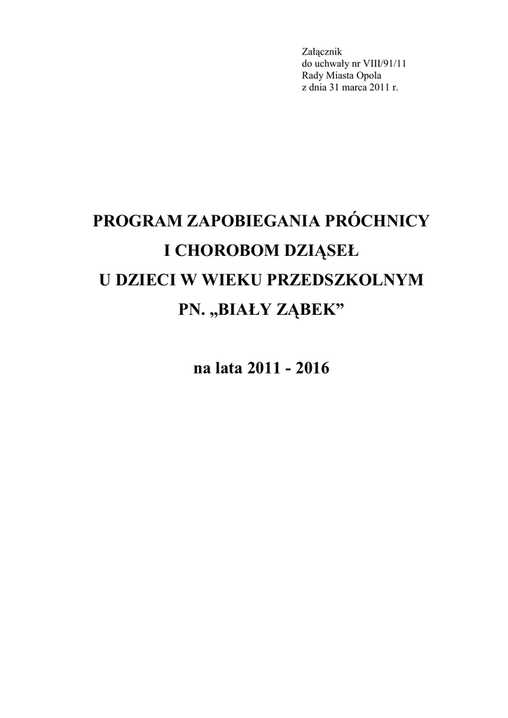 Załącznik do uchwały nr VIII/91/11 Rady Miasta Opola z dnia 31 marca 2011 r. PROGRAM ZAPOBIEGANIA PRÓCHNICY I CHOROBOM DZIĄSEŁ U DZIECI W WIEKU PRZEDSZKOLNYM PN. „BIAŁY ZĄBEK” na lata 2011 - 2016 1. Opis problemu zdrowotnego a. Problem zdrowotny Próchnica zębów należy do najbardziej rozpowszechnionych chorób w populacji dzieci i młodzieży. W krajach wysoko rozwiniętych od blisko 30 lat obserwuje się spadek częstotliwości występowania próchnicy u dzieci i młodzieży wskutek intensywnie prowadzonej edukacji całego społeczeństwa. W Polsce, jako jedynym z nielicznych krajów świata, a zwłaszcza Europy nie udało się dotąd znacząco obniżyć zapadalności na próchnicę, szczególnie wśród dzieci w wieku przedszkolnym. U dzieci przedwczesna utrata uzębienia mlecznego powoduje wzrost ryzyka nieprawidłowego rozwoju kości szczęki i powstanie różnego rodzaju wad zgryzu. Zęby z próchnicą uznawane są za istotne źródło infekcji dla całego organizmu. Ubytki próchnicowe stanowią poważne zagrożenie dla zdrowia ze względu na znaczne obciążenia bakteryjne. Zły stan zdrowia jamy ustnej osób dorosłych jest konsekwencją zaniedbań w dzieciństwie. Leczenie próchnicy jest bardzo kosztowne. Według danych Światowej Organizacji Zdrowia próchnica zajmuje czwarte miejsce na liście chorób najkosztowniejszych w leczeniu. Zęby zaatakowane przez próchnicę u dzieci w wieku szkolnym są na ogół usuwane w wieku średnim. Toczące się w tkankach zęba procesy chorobowe prowadzą do penetracji drobnoustrojów w głąb zęba i do okolicznych tkanek. Towarzyszą temu objawy zapalenia w postaci bólu, obrzęku tkanek, ropotoku, wzrostu ciepłoty ciała i wreszcie może dochodzić do rozprzestrzenienia infekcji w całym organizmie. Pierwszy szczyt nasilenia próchnicy zębów przypada na wiek 4–8 lat i dotyczy uzębienia mlecznego oraz pierwszych zębów trzonowych. Zęby mleczne są szczególnie narażone na działanie bakterii próchnicotwórczych. Czynnikami sprzyjającymi jest słabsza mineralizacja tkanek zęba oraz duża liczba bruzd i szczelin na powierzchni żującej zębów trzonowych. Każde, nawet najmniejsze ognisko próchnicy powinno być jak najszybciej leczone. Poprawna higiena zębów jest podstawą zachowania dobrego stanu uzębienia. Dzięki dokładnemu, regularnemu i poprawnemu czyszczeniu zębów, przyswojonemu już w dzieciństwie, można uniknąć większości chorób zębów i dziąseł. b. Epidemiologia Ogólnopolskie badania epidemiologiczne stanu zdrowia jamy ustnej ludności w Polsce prowadzone regularnie od 1987 r. wskazują na to, że próchnica zębów i choroby przyzębia stanowią nadal poważny problem zdrowotny naszego społeczeństwa. Z przeprowadzonych badań wynika, że stan uzębienia przedszkolaków jest katastrofalny. Dzieci przedszkolne bywają rzadko pacjentami gabinetów stomatologicznych. 2/21 Pokutuje bowiem w naszym kraju przekonanie, że zęby mleczne nie są ważne. A tymczasem aż 91,6 % 6-latków powinno mięć leczone zęby mleczne. Podstawową przyczyną próchnicy jest brak umiejętności dbania o zęby, brak nawyków wyniesionych z domu. Według badań przeprowadzonych w ramach rządowego programu „Monitoring jamy ustnej” wynika, iż 58 % 3-latków ma próchnicę. Program ten jest prowadzony co roku w różnych grupach wiekowych i co roku przynosi fatalne wyniki oraz pokazuje, jak daleko jest Polska w tyle za innymi krajami europejskimi. Według prof. Barbary Adamowicz– Kleparskiej – konsultanta krajowego ds. stomatologii dziecięcej - zaledwie 4 % polskich 18-latków nie ma próchnicy, a takie wskaźniki kraje lepiej rozwinięte miały 40 lat temu. Sytuację dotyczącą stanu zębów dzieci w Polsce na tle innych państw europejskich obrazują poniższe wykresy: Na podstawie skriningu przeprowadzonego w 2009 r. w ramach finansowanego przez miasto Opole Programu edukacyjnego dla dzieci w wieku przedszkolnym „Biały ząbek” wśród dzieci z roczników 2003–2004, uczęszczających do przedszkoli na terenie miasta Opola wynika, że częstotliwość występowania próchnicy wśród badanej populacji wynosiła średnio 69,5 %, z zastrzeżeniem, iż znacznie wyższy procent ubytków próchnicowych zaobserwowano u dzieci 6-letnich (około 75,5 %). c. Populacja podlegająca jednostce samorządu terytorialnego i populacja kwalifikująca się do włączenia do Programu Liczba mieszkańców miasta Opola na dzień 30 sierpnia 2010 r. to 122.324 osoby. Populacja kwalifikująca się do włączenia do Programu to dzieci w wieku przedszkolnym w przedziale wiekowym od 3 do 6 lat. Na terenie miasta Opola zameldowanych jest (według stanu na dzień 30 sierpnia 2010 r.) w ww. przedziale wiekowym 4.135 dzieci. Do przedszkoli uczęszcza z tego 3.659 dzieci, co stanowi 88,5 % ogólnej liczby dzieci w wieku przedszkolnym zamieszkujących miasto Opole. 3/21 d. Obecne postępowanie w omawianym problemie zdrowotnym ze szczególnym uwzględnieniem gwarantowanych świadczeń opieki zdrowotnej finansowanych ze środków publicznych Negatywne skutki niekorzystnych uwarunkowań społecznych, ekonomicznych i organizacyjnych w polskim systemie ochrony zdrowia są zauważalne w pierwszej kolejności m.in. w takich podsystemach, jak opieka stomatologiczna (likwidacja gabinetów stomatologicznych w placówkach oświatowych, bardzo ubogie programy profilaktyczne, ograniczana z roku na rok liczba i zakres usług stomatologicznych świadczonych w ramach ustawy o świadczeniach opieki zdrowotnej finansowanych ze środków publicznych). W związku z powyższym, dostępność do zabiegów profilaktyczno-leczniczych dzieci w wieku przedszkolnym drastycznie zmalała. Leczenie, jeśli w ogóle jest podejmowane, to najczęściej z powodu bólu powodowanego próchnicą. Publiczny sektor opieki stomatologicznej nie prowadzi dla dzieci zauważalnych programów profilaktycznych. Dzieci nie są objęte planową opieką stomatologiczną,