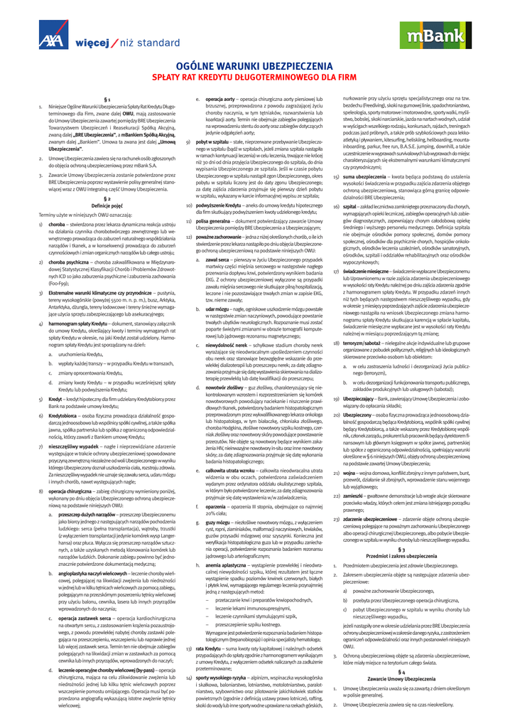 OGÓLNE WARUNKI UBEZPIECZENIA SPŁATY RAT KREDYTU DŁUGOTERMINOWEGO DLA FIRM 1. §1 NiniejszeOgólneWarunkiUbezpieczeniaSpłatyRatKredytuDługoterminowego dla Firm, zwane dalej OWU, mają zastosowanie do Umowy Ubezpieczenia zawartej pomiędzy BRE Ubezpieczenia Towarzystwem Ubezpieczeń i Reasekuracji Spółką Akcyjną, zwaną dalej „BRE Ubezpieczenia”, a mBankiem Spółką Akcyjną, zwanym dalej „Bankiem”. Umowa ta zwana jest dalej „Umową Ubezpieczenia”. 2. UmowęUbezpieczeniazawierasięnarachunekosóbzgłoszonych do objęcia ochroną ubezpieczeniową przez mBankS.A. 3. Zawarcie Umowy Ubezpieczenia zostanie potwierdzone przez BRE Ubezpieczenia poprzez wystawienie polisy generalnej stanowiącej wraz z OWU integralną część Umowy Ubezpieczenia. §2 Definicje pojęć Terminy użyte w niniejszych OWU oznaczają: 1) 2) 3) 4) choroba – stwierdzona przez lekarza dynamiczna reakcja ustroju na działania czynnika chorobotwórczego zewnętrznego lub wewnętrznego prowadząca do zaburzeń naturalnego współdziałania narządów i tkanek, a w konsekwencji prowadząca do zaburzeń czynnościowych izmian organicznych narządów lub całego ustroju; choroba psychiczna – choroba zakwalifikowana w Międzynarodowej Statystycznej Klasyfikacji Chorób i Problemów Zdrowotnych ICD 10 jako zaburzenia psychiczne i zaburzenia zachowania (F00-F99); Ekstremalne warunki klimatyczne czy przyrodnicze – pustynia, tereny wysokogórskie (powyżej 5500 m. n. p. m.), busz, Arktyka, Antarktyka, dżungla, tereny lodowcowe i tereny śnieżne wymagające użycia sprzętu zabezpieczającego lub asekuracyjnego; harmonogram spłaty Kredytu – dokument, stanowiący załącznik do umowy Kredytu, określający kwoty i terminy wymaganych rat spłaty Kredytu w okresie, na jaki Kredyt został udzielony. Harmonogram spłaty Kredytu jest sporządzany na dzień: a. b. wypłaty każdej transzy – w przypadku Kredytu w transzach, c. zmiany oprocentowania Kredytu, d. zmiany kwoty Kredytu – w przypadku wcześniejszej spłaty Kredytu lub podwyższenia Kredytu; Kredyt – kredyt hipoteczny dla firm udzielany Kredytobiorcy przez Bank na podstawie umowy kredytu; 6) Kredytobiorca – osoba fizyczna prowadząca działalność gospodarcząjednoosobowolubwspólnicyspółkicywilnej,atakżespółka jawna, spółka partnerska lub spółka z ograniczoną odpowiedzialnością, którzy zawarli z Bankiem umowę Kredytu; 7) nieszczęśliwy wypadek – nagłe i nieprzewidziane zdarzenie występujące w trakcie ochrony ubezpieczeniowej spowodowane przyczynązewnętrznąniezależneodwoliUbezpieczonegowwyniku którego Ubezpieczony doznał uszkodzenia ciała, rozstroju zdrowia. Zanieszczęśliwywypadeknieuznajesięzawałuserca,udarumózgu i innych chorób, nawet występujących nagle; operacja chirurgiczna – zabieg chirurgiczny wymieniony poniżej, wykonany po dniu objęcia Ubezpieczonego ochroną ubezpieczeniową na podstawie niniejszych OWU: a. b. c. d. 9) 10) podwyższenie Kredytu – aneks do umowy kredytu hipotecznego dla firm skutkujący podwyższeniem kwoty udzielonego kredytu; 11) polisa generalna – dokument potwierdzający zawarcie Umowy Ubezpieczenia pomiędzy BRE Ubezpieczenia a Ubezpieczającym; 12) poważnezachorowanie–jednazniżejokreślonychchorób,oileich stwierdzenieprzezlekarzanastąpiłopodniuobjęciaUbezpieczonego ochroną ubezpieczeniową na podstawie niniejszych OWU: a. przeszczep dużych narządów – przeszczep Ubezpieczonemu jako biorcy jednego z następujących narządów pochodzenia ludzkiego: serca (pełna transplantacja), wątroby, trzustki (z wyłączeniem transplantacji jedynie komórekwysp Langerhansa) oraz płuca. Wyłącza się przeszczep narządów sztucznych, a także uzyskanych metodą klonowania komórek lub narządów ludzkich. Dokonanie zabiegu powinno być jednoznacznie potwierdzone dokumentacją medyczną; angioplastykanaczyńwieńcowych –leczeniechorobywieńcowej, polegającej na likwidacji zwężenia lub niedrożności wjednejlubwkilkutętnicachwieńcowychzapomocązabiegu, polegającym na przezskórnym poszerzeniu tętnicy wieńcowej przy użyciu balonu, cewnika, lasera lub innych przyrządów wprowadzonych do naczynia; operacja zastawek serca – operacja kardiochirurgiczna na otwartym sercu, z zastosowaniem krążenia pozaustrojowego, z powodu przewlekłej nabytej choroby zastawki polegająca na przeszczepieniu, wszczepieniu lub naprawie jednej lub więcej zastawek serca. Termin ten nie obejmuje zabiegów polegających na likwidacji zmian w zastawkach za pomocą cewnika lub innych przyrządów, wprowadzonych do naczyń; leczenieoperacyjnechorobywieńcowej(by-pass)–operacja chirurgiczna, mająca na celu zlikwidowanie zwężenia lub niedrożności jednej lub kilku tętnic wieńcowych poprzez wszczepienie pomostu omijającego. Operacja musi być poprzedzona angiografią wykazującą istotne zwężenie tętnicy wieńcowej; zawał serca – pierwszy w życiu Ubezpieczonego przypadek martwicy części mięśnia sercowego w następstwie nagłego przerwania dopływu krwi, potwierdzony wynikiem badania EKG. Z ochrony ubezpieczeniowej wyłączone są przypadki zawału mięśnia sercowego nie skutkujące pilną hospitalizacją, leczone i nie pozostawiające trwałych zmian w zapisie EKG, tzw. nieme zawały; b. udarmózgu – nagłe, ogniskowe uszkodzenie mózgu powstałe w następstwie zmian naczyniowych, powodujące powstanie trwałych ubytków neurologicznych. Rozpoznanie musi zostać poparte świeżymi zmianami w obrazie tomografii komputerowej lub jądrowego rezonansu magnetycznego; c. niewydolność nerek – schyłkowe stadium choroby nerek wyrażające się nieodwracalnym upośledzeniem czynności obu nerek oraz stanowiące bezwzględne wskazanie do przewlekłej dializoterapii lub przeszczepu nerek; za datę zdiagnozowaniaprzyjmujesiędatęwystawieniaskierowanianadializoterapię przewlekłą lub datę kwalifikacji do przeszczepu; d. e. nowotwór złośliwy – guz złośliwy, chara