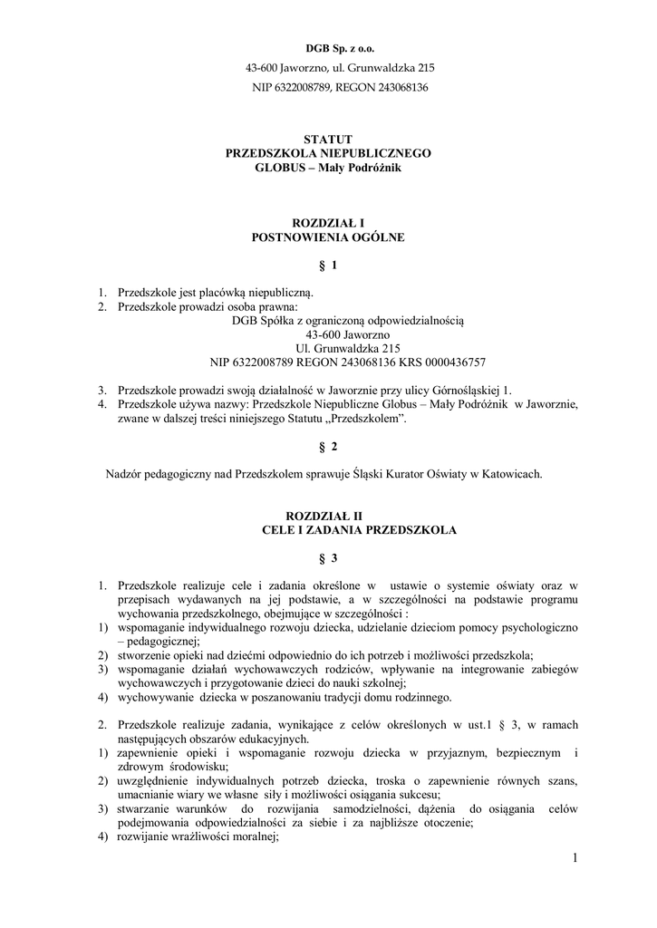 DGB Sp. z o.o. 43-600 Jaworzno, ul. Grunwaldzka 215 NIP 6322008789, REGON 243068136 STATUT PRZEDSZKOLA NIEPUBLICZNEGO GLOBUS – Mały Podróżnik ROZDZIAŁ I POSTNOWIENIA OGÓLNE § 1 1. Przedszkole jest placówką niepubliczną. 2. Przedszkole prowadzi osoba prawna: DGB Spółka z ograniczoną odpowiedzialnością 43-600 Jaworzno Ul. Grunwaldzka 215 NIP 6322008789 REGON 243068136 KRS 0000436757 3. Przedszkole prowadzi swoją działalność w Jaworznie przy ulicy Górnośląskiej 1. 4. Przedszkole używa nazwy: Przedszkole Niepubliczne Globus – Mały Podróżnik w Jaworznie, zwane w dalszej treści niniejszego Statutu „Przedszkolem”. § 2 Nadzór pedagogiczny nad Przedszkolem sprawuje Śląski Kurator Oświaty w Katowicach. ROZDZIAŁ II CELE I ZADANIA PRZEDSZKOLA § 3 1. Przedszkole realizuje cele i zadania określone w ustawie o systemie oświaty oraz w przepisach wydawanych na jej podstawie, a w szczególności na podstawie programu wychowania przedszkolnego, obejmujące w szczególności : 1) wspomaganie indywidualnego rozwoju dziecka, udzielanie dzieciom pomocy psychologiczno – pedagogicznej; 2) stworzenie opieki nad dziećmi odpowiednio do ich potrzeb i możliwości przedszkola; 3) wspomaganie działań wychowawczych rodziców, wpływanie na integrowanie zabiegów wychowawczych i przygotowanie dzieci do nauki szkolnej; 4) wychowywanie dziecka w poszanowaniu tradycji domu rodzinnego. 2. Przedszkole realizuje zadania, wynikające z celów określonych w ust.1 § 3, w ramach następujących obszarów edukacyjnych. 1) zapewnienie opieki i wspomaganie rozwoju dziecka w przyjaznym, bezpiecznym i zdrowym środowisku; 2) uwzględnienie indywidualnych potrzeb dziecka, troska o zapewnienie równych szans, umacnianie wiary we własne siły i możliwości osiągania sukcesu; 3) stwarzanie warunków do rozwijania samodzielności, dążenia do osiągania celów podejmowania odpowiedzialności za siebie i za najbliższe otoczenie; 4) rozwijanie wrażliwości moralnej; 1 DGB Sp. z o.o. 43-600 Jaworzno, ul. Grunwaldzka 215 NIP 6322008789, REGON 243068136 5) kształtowanie umiejętności obserwacji, ułatwienie rozumienia zjawisk zachodzących w dostępnym doświadczeniu dziecka otoczeniu przyrodniczym, społecznym, kulturowym i technicznym; 6) rozbudzanie ciekawości poznawczej, zachęcanie do aktywności badawczej i wyrażania własnych myśli i przeżyć; 7) rozwijanie wrażliwości estetycznej, tworzenie warunków do rozwoju wyobraźni, fantazji oraz ekspresji plastycznej, muzycznej i ruchowej; 8) zapewnienie warunków do harmonijnego rozwoju fizycznego, bezpiecznego postępowania i zachowań pro zdrowotnych. §4 1. Dyrektor Przedszkola oraz wszyscy pracownicy Przedszkola są zobowiązani do zapewnienia dzieciom bezpiecznych i higienicznych warunków zabawy i nauki w czasie ich pobytu w Przedszkolu, jak również podczas zajęć organizowanych poza jego terenem (1 opiekun dorosły na 10 dzieci poza terenem Przedszkola). 2. Nauczyciel odpowiada za zdrowie i bezpieczeństwo dzieci w czasie pobytu dziecka w Przedszkolu. W przypadku zaistnienia konieczności oddalenia się nauczyciela od nadzorowanej grupy, chwilowo pozostawia ją pod opieką innej upoważnionej, zatrudnionej w placówce, osoby. 3. Tygodniowy i dzienny rozkład zajęć dzieci, w którym dominującą formą jest zabawa, ustalony jest z zachowaniem higieny umysłowej przez równomierne rozłożenie zajęć dnia i tygodnia, i uwzględnieniem dostosowania ich do potrzeb wiekowych i rozwojowych dzieci. §5 Dyrektor Przedszkola powierza każdą grupę dzieci opiece jednego lub dwóch nauczycieli, w zależności od czasu pracy grupy lub przyjętych dodatkowych zadań, w tym zadań specjalnych (integracja). R O Z D Z I A Ł III ORGANY PRZEDSZKOLA I ZAKRES ICH ZADAŃ §6 1. Organami Przedszkola są: 1) Dyrektor Przedszkola; 2) Rada Pedagogiczna §7 1. Dyrektor kieruje całokształtem pracy Przedszkola we wszystkich sprawach związanych z jego działalnością, w szczególności sprawach wychowawczych, dydaktycznych i opiekuńczych, w sprawach organizacyjnych i reprezentuje Przedszkole na zewnątrz na podstawie Pełnomocnictwa określającego zakres umocowań Dyrektora. 2 DGB Sp. z o.o. 43-600 Jaworzno, ul. Grunwaldzka 215 NIP 6322008789, REGON 243068136 2. Do podstawowych obowiązków Dyrektora należy kierowanie i nadzorowanie pracy podległego mu zespołu pracowników ( nauczycieli, pracowników obsługi i administracji), w szczególności: 1) opracowywanie dokumentów programowo – organizacyjnych Przedszkola 2) planowanie nadzoru pedagogicznego, z uwzględnieniem lokalnych potrzeb, sposobu jego realizacji, dokumentowania oraz wykorzystywania wyników; 3) opracowywanie zakresu obowiązków (czynności) pracowników Przedszkola; 4) wnioskowanie o zatrudnianie lub zwalnianie pracowników Przedszkola; 5) organizowanie szkoleń; 6) informowanie Zarządu o podejmowanych innowacjach i eksperymentach pedagogicznych oraz wnioskowanie o zwiększenie budżetu w przypadku, gdy czynności powyższe powodują skutki finansowe. 7) realizację zadań przez podległe komórki organizacyjne zgodnie z Systemem HACCP. 8) nadzór nad przestrzeganiem dyscypliny pracy oraz przepisów bezpieczeństwa i higieny pracy, przeciw pożarowych i ochrony środowiska. 9) sprawowanie kontroli funkcjonalnej. 10) racjonalne gospodarowanie powierzonym mieniem. §8 1. Rada Pedagogiczna jest kolegialnym organem przedszkola w zakresie jej statutowych zadań dotyczących kształcenia, wychowania i opieki. 2. W skład Rady Pedagogicznej wchodzi dyrektor oraz wszyscy nauczyciele zatrudnieni w przedszkolu. 3. W zebraniach Rady Pedagogicznej lub w określonych punktach porządku zebrań mogą uczestniczyć z głosem doradczym osoby zaproszone przez przewodniczącego, za zgodą lub na wniosek Rady Pedagogicznej przedstawiciele stowarzyszeń i innych organizacji. 4. W zebraniach Rady Pedagogicznej może uczestniczyć członek Zarządu organu prowadzącego przedszkole z głos