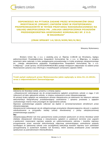 ODPOWIEDZI NA PYTANIA ZADANE PRZEZ WYKONAWCÓW ORAZ MODYFIKACJE (ZMIANY) ZAPISÓW SIWZ W POSTĘPOWANIU PRZEPROWADZONYM W TRYBIE PRZETARGU NIEOGRANICZONEGO NA USŁUGĘ UBEZPIECZENIA PN. „USŁUGA UBEZPIECZENIA POJAZDÓW PRZEDSIĘBIORSTWA GOSPODARKI KOMUNALNEJ SP. Z O.O. W BIŁGORAJU” (ZNAK SPRAWY 14/2015/KOM/NO/K/BU) Wszyscy Wykonawcy Brokers Union Sp. z o.o. z siedzibą przy ul. Ślężnej 112B/U8 we Wrocławiu, będący pełnomocnikiem Przedsiębiorstwa Gospodarki Komunalnej Sp. z o.o. w Biłgoraju, w związku pytaniami jakie wpłynęły w toku postępowania prowadzonego w trybie przetargu nieograniczonego pn. „Usługa ubezpieczenia pojazdów Przedsiębiorstwa Gospodarki Komunalnej Sp. z o.o. w Biłgoraju” (znak sprawy 14/2015/KOM/NO/K/BU) podaje niniejszym odpowiedzi na zadane przez Wykonawców pytania oraz informuje o modyfikacjach (zmianach) zapisów SIWZ: Treść pytań zadanych przez Wykonawców jakie wpłynęły w dniu 01.12.2015r. wraz z odpowiedziami Zamawiającego Pytanie nr 1: Założenia do likwidacji szkód, prosimy o zmianę zapisu: „Ubezpieczyciel zobowiązuje się do przeprowadzenia oględzin przedmiotu szkody w ciągu 3 dni roboczych od daty zgłoszenia szkody, w miejscu wskazanym przez Ubezpieczającego. W sytuacji braku oględzin we wskazanym okresie Ubezpieczony po dokonaniu we własnym zakresie dokumentacji fotograficznej przedstawiającej uszkodzenia i spisaniu protokołu z oględzin uszkodzonego mienia może przystąpić do naprawiania szkody. Naprawa uszkodzonego pojazdu odbywać się będzie w serwisie/warsztacie określonym przez Ubezpieczającego. Ubezpieczyciel zobowiązuje się do obligatoryjnego przesyłania Ubezpieczającemu decyzji o wypłacie odszkodowania w przypadku każdej szkody likwidowanej z polisy ubezpieczeniowej przedmiotowego pojazdu.” Na: Ubezpieczający/Broker lub inna upoważniona osoba przekaże opiekunom ze strony likwidacji szkód Zakładu Ubezpieczeń informację o niewykonaniu oględzin w ustalonym terminie oraz uzgodni z opiekunem rozpoczęcie naprawy pojazdu po udokumentowaniu zakresu i kosztów naprawy przygotowaną przez warsztat dokumentacją zdjęciową potwierdzającą uszkodzenia pojazdu wynikające ze zgłoszonej szkody oraz szczegółową kalkulacją kosztów naprawy tych uszkodzeń (przygotowaną w systemach Audatex lub Eurotax), które zostaną przekazane przez warsztat opiekunowi za pośrednictwem Klienta/Brokera. Strona 1 z 3 2) Opiekun niezwłocznie, nie później jednak niż w ciągu 1 dnia roboczego od momentu otrzymania dokumentacji przekaże zwrotnie Brokerowi informację o możliwości rozpoczęcia naprawy lub jej wstrzymaniu w związku z prawdopodobieństwem kwalifikacji szkody jako całkowitej. 3) W sytuacji, gdy w ciągu 1 dnia roboczego opiekun nie przekaże żadnej informacji Brokerowi, Broker może zlecić warsztatowi naprawczemu rozpoczęcie naprawy w oparciu o przygotowaną kalkulację kosztów naprawy, a Ubezpieczyciel wypłaci odszkodowanie zgodnie z postanowieniami pkt. d) niniejszego ustępu. 4) W przypadku potwierdzenia odpowiedzialności Ubezpieczyciela za zaistniałe zdarzenie i zakres uszkodzeń z niego wynikających wypłata odszkodowania nastąpi przy uwzględnieniu ewentualnych potrąceń wynikających z wariantu ubezpieczenia oraz postanowień niniejszej Umowy lub OWU AC/KR. Odpowiedź na pytanie nr 1: Zamawiający informuje, że nie wyraża zgody na zmianę zapisu: „Ubezpieczyciel zobowiązuje się do przeprowadzenia oględzin przedmiotu szkody w ciągu 3 dni roboczych od daty zgłoszenia szkody, w miejscu wskazanym przez Ubezpieczającego. W sytuacji braku oględzin we wskazanym okresie Ubezpieczony po dokonaniu we własnym zakresie dokumentacji fotograficznej przedstawiającej uszkodzenia i spisaniu protokołu z oględzin uszkodzonego mienia może przystąpić do naprawiania szkody. Naprawa uszkodzonego pojazdu odbywać się będzie w serwisie/warsztacie określonym przez Ubezpieczającego. Ubezpieczyciel zobowiązuje się do obligatoryjnego przesyłania Ubezpieczającemu decyzji o wypłacie odszkodowania w przypadku każdej szkody likwidowanej z polisy ubezpieczeniowej przedmiotowego pojazdu.” Na: Ubezpieczający/Broker lub inna upoważniona osoba przekaże opiekunom ze strony likwidacji szkód Zakładu Ubezpieczeń informację o niewykonaniu oględzin w ustalonym terminie oraz uzgodni z opiekunem rozpoczęcie naprawy pojazdu po udokumentowaniu zakresu i kosztów naprawy przygotowaną przez warsztat dokumentacją zdjęciową potwierdzającą uszkodzenia pojazdu wynikające ze zgłoszonej szkody oraz szczegółową kalkulacją kosztów naprawy tych uszkodzeń (przygotowaną w systemach Audatex lub Eurotax), które zostaną przekazane przez warsztat opiekunowi za pośrednictwem Klienta/Brokera. 2) Opiekun niezwłocznie, nie później jednak niż w ciągu 1 dnia roboczego od momentu otrzymania dokumentacji przekaże zwrotnie Brokerowi informację o możliwości rozpoczęcia naprawy lub jej wstrzymaniu w związku z prawdopodobieństwem kwalifikacji szkody jako całkowitej. 3) W sytuacji, gdy w ciągu 1 dnia roboczego opiekun nie przekaże żadnej informacji Brokerowi, Broker może zlecić warsztatowi naprawczemu rozpoczęcie naprawy w oparciu o przygotowaną kalkulację kosztów naprawy, a Ubezpieczyciel wypłaci odszkodowanie zgodnie z postanowieniami pkt d) niniejszego ustępu. 4) W przypadku potwierdzenia odpowiedzialności Ubezpieczyciela za zaistniałe zdarzenie i zakres uszkodzeń z niego wynikających wypłata odszkodowania nastąpi przy uwzględnieniu ewentualnych potrąceń wynikających z wariantu ubezpieczenia oraz postanowień niniejszej Umowy lub OWU AC/KR. Zapisy SIWZ w tym zakresie pozostają bez zmian. Pytanie nr 2: Zakres ubezpieczenia (All risk), prosimy o zmianę zapisu: „Zakres ubezpieczenia (All risk): powinien obejmować szkody polegające na uszkodzeniu, zniszczeniu lub utracie: - pojazdu; - części pojazdu; - wyposażenia pojazdu; - bagażu; Strona 2 z 3 ws