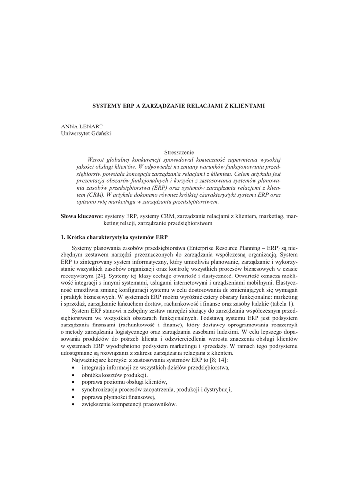 SYSTEMY ERP A ZARZDZANIE RELACJAMI Z KLIENTAMI ANNA LENART Uniwersytet Gdaski Streszczenie Wzrost globalnej konkurencji spowodował koniecznoĞü zapewnienia wysokiej jakoĞci obsługi klientów. W odpowiedzi na zmiany warunków funkcjonowania przedsiĊbiorstw powstała koncepcja zarządzania relacjami z klientem. Celem artykułu jest prezentacja obszarów funkcjonalnych i korzyĞci z zastosowania systemów planowania zasobów przedsiĊbiorstwa (ERP) oraz systemów zarządzania relacjami z klientem (CRM). W artykule dokonano równieĪ krótkiej charakterystyki systemu ERP oraz opisano rolĊ marketingu w zarządzaniu przedsiĊbiorstwem. Słowa kluczowe: systemy ERP, systemy CRM, zarzdzanie relacjami z klientem, marketing, marketing relacji, zarzdzanie przedsibiorstwem 1. Krótka charakterystyka systemów ERP Systemy planowania zasobów przedsibiorstwa (Enterprise Resource Planning – ERP) s niezbdnym zestawem narzdzi przeznaczonych do zarzdzania współczesn organizacj. System ERP to zintegrowany system informatyczny, który umoliwia planowanie, zarzdzanie i wykorzystanie wszystkich zasobów organizacji oraz kontrol wszystkich procesów biznesowych w czasie rzeczywistym [24]. Systemy tej klasy cechuje otwarto i elastyczno. Otwarto oznacza moliwo integracji z innymi systemami, usługami internetowymi i urzdzeniami mobilnymi. Elastyczno umoliwia zmian konfiguracji systemu w celu dostosowania do zmieniajcych si wymaga i praktyk biznesowych. W systemach ERP mona wyróni cztery obszary funkcjonalne: marketing i sprzeda, zarzdzanie łacuchem dostaw, rachunkowo i finanse oraz zasoby ludzkie (tabela 1). System ERP stanowi niezbdny zestaw narzdzi słucy do zarzdzania współczesnym przedsibiorstwem we wszystkich obszarach funkcjonalnych. Podstaw systemu ERP jest podsystem zarzdzania finansami (rachunkowo i finanse), który dostawcy oprogramowania rozszerzyli o metody zarzdzania logistycznego oraz zarzdzania zasobami ludzkimi. W celu lepszego dopasowania produktów do potrzeb klienta i odzwierciedlenia wzrostu znaczenia obsługi klientów w systemach ERP wyodrbniono podsystem marketingu i sprzeday. W ramach tego podsystemu udostpniane s rozwizania z zakresu zarzdzania relacjami z klientem. Najwaniejsze korzyci z zastosowania systemów ERP to [8; 14]: • integracja informacji ze wszystkich działów przedsibiorstwa, • obnika kosztów produkcji, • poprawa poziomu obsługi klientów, • synchronizacja procesów zaopatrzenia, produkcji i dystrybucji, • poprawa płynnoci finansowej, • zwikszenie kompetencji pracowników. 48 Anna Lenart Systemy ERP a zarządzanie relacjami z klientami Tabela.1. Obszary funkcjonalne systemu ERP Obszar funkcjonalny Marketing i sprzeda Zarzdzanie łacuchem dostaw Rachunkowo i finanse Zarzdzanie zasobami ludzkimi Funkcje biznesowe Marketing produktu Obsługa zlece klientów Wsparcie klienta Zarzdzanie relacjami z klientem Prognozowanie sprzeday Zaopatrzenie Zarzdzanie materiałami Transport Produkcja Utrzymanie zakładu Rachunkowo finansowa Alokacja i kontrola kosztów Planowanie i budetowanie Zarzdzanie przepływami pieninymi Rekrutacja Zarzdzanie personelem Płace Szkolenia ródło: Opracowanie własne na podstawie: [18] Model ERP zaproponowała amerykaska firma analityczno-doradcza Gartner Group w 1990 roku, ale nie został on opublikowany jako standard. Oznacza to, e rozwizania pochodzce od rónych producentów mog udostpnia uytkownikowi zrónicowany zakres funkcji i modułów. W drugiej połowie lat 90. XX wieku systemy ERP stały si niewystarczajce do uzyskania przewagi konkurencyjnej, ale jednoczenie posiadanie takiego systemu stało si jednym z warunków przetrwania przedsibiorstwa. Popularno zyskały inne rozwizania informatyczne: • systemy zarzdzania relacjami z klientem (Customer Relationship Management – CRM), • systemy zarzdzania łacuchem dostaw (Supply Chain Management – SCM). Wikszo systemów ERP udostpnia podstawowe rozwizania z zakresu transakcyjnych CRM i wewntrznych SCM. Istnieje równie moliwo integracji zaawansowanych systemów klasy CRM i SCM z systemami ERP [14]. W 2000 roku firma Gartner Group zaproponowała now koncepcj systemów planowania relacji przedsibiorstwa z otoczeniem, stanowicych rozszerzenie systemów ERP o współprac z klientami, dostawcami i partnerami handlowymi oraz rozwizania z zakresu handlu elektronicznego. Jest to naturalne rozszerzenie systemów ERP o wykorzystanie technologii internetowych i rozwiza mobilnych. Mimo powstawania wielu innych rozwiza wspomagajcych zarzdzanie systemy ERP nadal stanowi strategiczny element biznesu. Inne rozwizania mog by selektywnie dobierane przez klientów niezalenie od rdzenia, czyli systemu ERP [10]. Szerzej na temat systemów ERP i kierunków ich rozwoju pisz m.in.: [2; 8; 11; 14; 18; 22]. POLSKIE STOWARZYSZENIE ZARZĄDZANIA WIEDZĄ Seria: Studia i Materiały, nr 16, 2008 49 2. Rola marketingu w zarzdzaniu przedsi biorstwem W warunkach gospodarki rynkowej i nasilajcej si konkurencji wzrosło znaczenie marketingu jako koncepcji zarzdzania przedsibiorstwem. Współczesny marketing to koncepcja zarzdzania zorientowana za rozpoznawanie i zaspokajanie potrzeb wszystkich uczestników rynku, ale przede wszystkim klientów [17]. Marketing przyczynia si do kreowania wartoci oczekiwanych przez klientów w zamian za zysk [7]. Strategie marketingowe powinny przyczynia si do „zdobycia i utrzymania przewagi konkurencyjnej na rynku” [17]. Struktura marketingu obejmuje trzy elementy [7]: system wartoci, system bada marketingowych i instrumenty marketingu (marketing-mix). „System wartoci okrela stosunek przedsibiorstwa do klientów, pracowników i partnerów” [7]. Badania marketingowe to celowe i systematyczne gromadzenie informacji na potrzeby podejmowania decyzji marketingowych. Badania marketingowe dotycz potrzeb klientów i stopnia ich zaspokojenia, efektywnoci stosowanych narzdzi marketingowych i oceny pozycji przedsibiorstwa na tle konkurencji [7]. Instrumenty marketingumix (pro