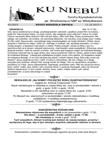 Parafia Rzymskokatolicka pw. Wniebowzięcia NMP we Władysławowie 41/2015 XXVIII NIEDZIELA ZWYKŁA 11.10.2015 r. EWANGELIA (Mk 10,17-30) Gdy Jezus wybierał się w drogę, przybiegł pewien człowiek i upadłszy przed Nim na kolana, pytał Go: Nauczycielu dobry, co mam czynić, aby osiągnąć życie wieczne? Jezus mu rzekł: Czemu nazywasz Mnie dobrym? Nikt nie jest dobry, tylko sam Bóg. Znasz przykazania: Nie zabijaj, nie cudzołóż, nie kradnij, nie zeznawaj fałszywie, nie oszukuj, czcij swego ojca i matkę. On Mu rzekł: Nauczycielu, wszystkiego tego przestrzegałem od mojej młodości. Wtedy Jezus spojrzał z miłością na niego i rzekł mu: Jednego ci brakuje. Idź, sprzedaj wszystko, co masz, i rozdaj ubogim, a będziesz miał skarb w niebie. Potem przyjdź i chodź za Mną. Lecz on spochmurniał na te słowa i odszedł zasmucony, miał bowiem wiele posiadłości. Wówczas Jezus spojrzał wokoło i rzekł do swoich uczniów: Jak trudno jest bogatym wejść do królestwa Bożego. Uczniowie zdumieli się na Jego słowa, lecz Jezus powtórnie rzekł im: Dzieci, jakże trudno wejść do królestwa Bożego . Łatwiej jest wielbłądowi przejść przez ucho igielne, niż bogatemu wejść do królestwa Bożego. A oni tym bardziej się dziwili i mówili między sobą: Któż więc może się zbawić? Jezus spojrzał na nich i rzekł: U ludzi to niemożliwe, ale nie u Boga; bo u Boga wszystko jest możliwe. Wtedy Piotr zaczął mówić do Niego: Oto my opuściliśmy wszystko i poszliśmy za Tobą. Jezus odpowiedział: Zaprawdę, powiadam wam: Nikt nie opuszcza domu, braci, sióstr, matki, ojca, dzieci i pól z powodu Mnie i z powodu Ewangelii, żeby nie otrzymał stokroć więcej teraz, w tym czasie, domów, braci, sióstr, matek, dzieci i pól, wśród prześladowań, a życia wiecznego w czasie przyszłym. REKOLEKCJE „NA DOBRY POCZĄTEK ROKU DUSZPASTERSKIEGO” wygłosi ks. Andrzej Trojanowski TChr. Nauki rekolekcyjne w niedzielę w czasie Mszy św. oraz w poniedziałek i wtorek o godz. o godz. 9.00 i o godz. 18.00. Spowiedź w dni rekolekcji rano w czasie Mszy św. o godz. 9.00, wieczorem od godz.17.00. Po Mszach św. wieczornych w poniedziałek i wtorek nabożeństwa z modlitwą uwielbienia i z modlitwa wstawienniczą. O godz. 17.00 wystawienie Najświętszego sakramentu NABOŻEŃSTWA RÓŻAŃCOWE Nabożeństwa różańcowe dla wszystkich w dni powszednie o godz. 17.30; Dla dzieci – w poniedziałek , środę i piątek o godz. 17.00; Dla młodzieży w środę o godz. 19.00. Tych wszystkich, którym trudniej jest dotrzeć do naszej świątyni, prosimy i zachęcamy do tego, aby w tym miesiącu wspólnie odmawiali różaniec w domach. Solenizantom i jubilatom nadchodzącego tygodnia życzymy wielu łask Bożych. PAPIESKI FESTYN RODZIINNY U MATKI BOŻEJ WNIEBOWZIĘTEJ Przed tygodniem wielu z nas uczestniczyło w Festynie Parafialnym. Dziękujemy wszystkim, którzy zechcieli skorzystać z naszego zaproszenia i uczestniczyć we wspólnym świętowaniu. Na pewno czas spędzony razem z rodziną, ze znajomymi na wspólnej rozmowie i zabawie nie był czasem zmarnowanym, wręcz przeciwnie - bardzo potrzebnym do budowania wspólnoty i jedności naszej parafii. Podziękowania kierujemy pod adresem osób i firm które ufundowały nagrody główne. Bardzo gorąco chcemy podziękować wszystkim organizatorom festynu, wszystkim odpowiedzialnym za poszczególne działy. W sposób szczególny dziękujemy: Radzie Parafialnej, Władzom Miasta, Młodzieżowemu Parafialnemu Klubowi Sportowemu „Rybak” ,Zakładom Mięsnym Rodziny Państwa Holender, Dyrekcji Ośrodka Wypoczynkowego „Fenix” w Jastrzębiej Górze, Właścicielom Cukierni „Konkol”, Ochotniczej Straży Pożarnej we Władysławowie, Kole Gospodyń Miejskich, Dyrekcji Szkoły nr 1, Właścicielom ABC Przedszkole, Stowarzyszeniu „Zrozumieć świat”, Ruchowi „Wiara i Światło”, Firmie ABRUKO, lektorom, Parafialnemu Zespołowi Caritas, Młodzieżowemu Zespołowi Caritas, Duszpasterstwu Młodzieżowemu, Rodzicom lektorów i ministrantów, młodzieży, , Młodzieżowej Orkiestrze Dętej z Władysławowa, scholii młodzieżowej, scholii dziecięcej, zespołowi „Medium” Szczególne podziękowania dla osób, które przygotowały ciasto, oraz tych wszystkich którzy składali przedmioty z przeznaczeniem na fanty i aukcje. Dziękuję wszystkim którzy w jakikolwiek sposób przyczynili się do zorganizowania naszego Papieskiego Festynu u Matki Bożej Wniebowziętej. DZIEŃ PAPIESKI Dziś Obchodzimy Dzień Papieski pod hasłem: „Jan Paweł II – Patron Rodziny”. Dzień ten w naszej ojczyźnie połączony jest ze zbiórką na ulicach miast na rzecz Fundacji „Dzieło Nowego Tysiąclecia”, której celem jest fundowanie stypendiów dla najzdolniejszych spośród młodych. MALOWANIE KOŚCIOŁA Od najbliższej środy rozpoczynamy malowanie kościoła. Malowanie potrwa około 3 tygodni. Msze św. od poniedziałku do soboty rano, odbywać się będą w auli św. Wojciecha w domu parafialnym. W sobotę wieczorem oraz w niedziele w kościele. NABOŻEŃSTWO FATIMSKIE Nabożeństwo Fatimskie ma charakter ekspiacyjny i obejmują głównie wspólne odmawianie różańca. Jest to odpowiedź na dwa wezwania Maryi: do modlitwy oraz do czynienia pokuty za grzeszników. Najbliższe nabożeństwo rozpocznie się w poniedziałek 12 października. godz. 17.30 - I część różańca godz. 21.00 - Nieszpory Maryjne i procesja światła. wtorek 13 października godz. 10.00 - II część różańca, godz. 15.00 - III część różańca, godz. 17.30 - IV część różańca godz. 18.00 - Procesja światła i Msza święta. DIAKONIA WIELBIENIA W każdy czwartek o godz. 19.00 w domu parafialnym odbywa się próba scholii wielbiącej Boga podczas Mszy św. wielbienia. Wszystkich umiejących grać i śpiewać zapraszamy na próbę. Spotkania w domu parafialnym. CHÓR PARAFIALNY Chór parafialny rozpoczął swoje próby. Wszystkich chętnych zarówno