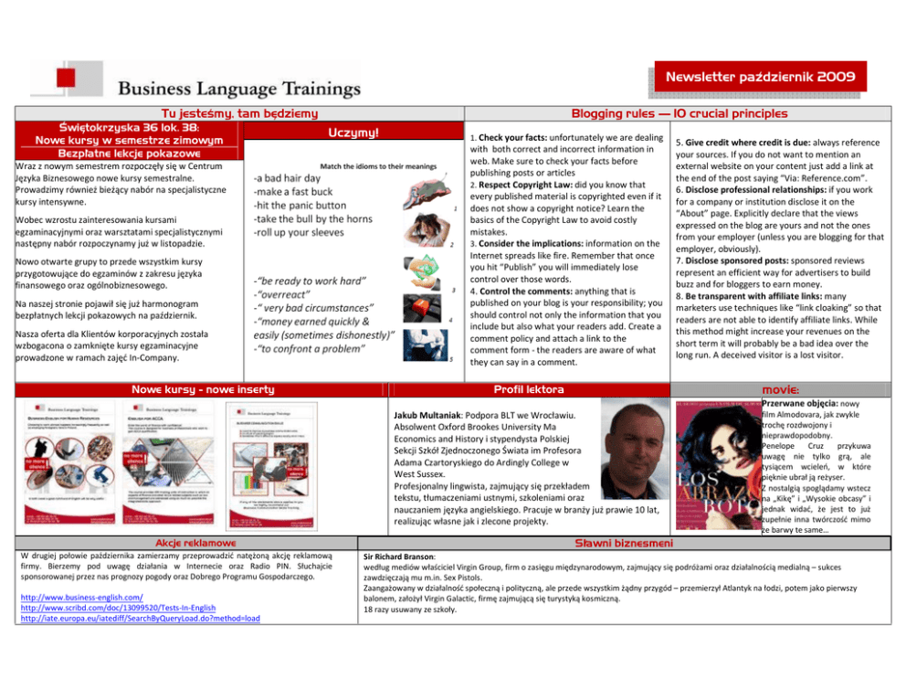Newsletter pazdziernik 2009 Tu jestesmy, tam bedziemy Swietokrzyska 36 lok. 38: Nowe kursy w semestrze zimowym Bezplatne lekcje pokazowe Blogging rules – 10 crucial principles Uczymy! Wraz z nowym semestrem rozpoczęły się w Centrum Języka Biznesowego nowe kursy semestralne. Prowadzimy również bieżący nabór na specjalistyczne kursy intensywne. Wobec wzrostu zainteresowania kursami egzaminacyjnymi oraz warsztatami specjalistycznymi następny nabór rozpoczynamy już w listopadzie. Nowo otwarte grupy to przede wszystkim kursy przygotowujące do egzaminów z zakresu języka finansowego oraz ogólnobiznesowego. Na naszej stronie pojawił się już harmonogram bezpłatnych lekcji pokazowych na październik. Nasza oferta dla Klientów korporacyjnych została wzbogacona o zamknięte kursy egzaminacyjne prowadzone w ramach zajęć In-Company. Nowe kursy - nowe inserty http://www.english.biz.pl/business_communication_skills.php http://www.english.biz.pl/business_communication_skills.php http://www.english.biz.pl/business_english_for_human_resources.php http://www.english.biz.pl/business_english_for_human_resources.php http://www.english.biz.pl/english_for_acca.php http://www.english.biz.pl/english_for_acca.php Akcje reklamowe http://www.scribd.com/doc/19183365/Useful-Business-English-Phrases-1 W drugiej połowie października zamierzamy przeprowadzić natężoną akcję reklamową firmy. Bierzemy pod uwagę działania w Internecie oraz Radio PIN. Słuchajcie sponsorowanej przez nas prognozy pogody oraz Dobrego Programu Gospodarczego. http://www.business-english.com/ http://www.scribd.com/doc/13099520/Tests-In-English http://iate.europa.eu/iatediff/SearchByQueryLoad.do?method=load 1. Check your facts: unfortunately we are dealing with both correct and incorrect information in web. Make sure to check your facts before publishing posts or articles 2. Respect Copyright Law: did you know that every published material is copyrighted even if it does not show a copyright notice? Learn the basics of the Copyright Law to avoid costly mistakes. 3. Consider the implications: information on the Internet spreads like fire. Remember that once you hit “Publish” you will immediately lose control over those words. 4. Control the comments: anything that is published on your blog is your responsibility; you should control not only the information that you include but also what your readers add. Create a comment policy and attach a link to the comment form - the readers are aware of what they can say in a comment. Profil lektora 5. Give credit where credit is due: always reference your sources. If you do not want to mention an external website on your content just add a link at the end of the post saying “Via: Reference.com”. 6. Disclose professional relationships: if you work for a company or institution disclose it on the “About” page. Explicitly declare that the views expressed on the blog are yours and not the ones from your employer (unless you are blogging for that employer, obviously). 7. Disclose sponsored posts: sponsored reviews represent an efficient way for advertisers to build buzz and for bloggers to earn money. 8. Be transparent with affiliate links: many marketers use techniques like “link cloaking” so that readers are not able to identify affiliate links. While this method might increase your revenues on the short term it will probably be a bad idea over the long run. A deceived visitor is a lost visitor. movie: Przerwane objęcia: nowy Jakub Multaniak: Podpora BLT we Wrocławiu. Absolwent Oxford Brookes University Ma Economics and History i stypendysta Polskiej Sekcji Szkół Zjednoczonego Świata im Profesora Adama Czartoryskiego do Ardingly College w West Sussex. Profesjonalny lingwista, zajmujący się przekładem tekstu, tłumaczeniami ustnymi, szkoleniami oraz nauczaniem języka angielskiego. Pracuje w branży już prawie 10 lat, realizując własne jak i zlecone projekty. film Almodovara, jak zwykle trochę rozdwojony i nieprawdopodobny. Penelope Cruz przykuwa uwagę nie tylko grą, ale tysiącem wcieleń, w które pięknie ubrał ją reżyser. Z nostalgią spoglądamy wstecz na „Kikę” i „Wysokie obcasy” i jednak widać, że jest to już zupełnie inna twórczość mimo że barwy te same… Slawni biznesmeni Sir Richard Branson: według mediów właściciel Virgin Group, firm o zasięgu międzynarodowym, zajmujący się podróżami oraz działalnością medialną – sukces zawdzięczają mu m.in. Sex Pistols. Zaangażowany w działalność społeczną i polityczną, ale przede wszystkim żądny przygód – przemierzył Atlantyk na łodzi, potem jako pierwszy balonem, założył Virgin Galactic, firmę zajmującą się turystyką kosmiczną. 18 razy usuwany ze szkoły.