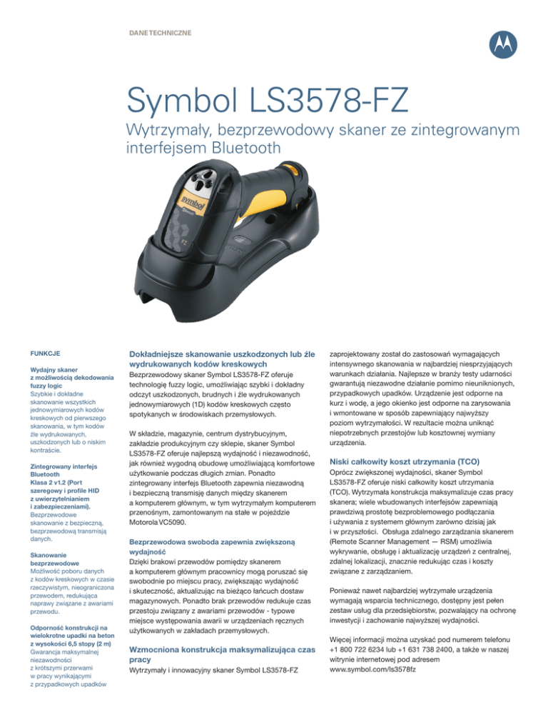 DANE techniczne Symbol LS3578-FZ Wytrzymały, bezprzewodowy skaner ze zintegrowanym interfejsem Bluetooth FUNKCJE Wydajny skaner z możliwością dekodowania fuzzy logic Szybkie i dokładne skanowanie wszystkich jednowymiarowych kodów kreskowych od pierwszego skanowania, w tym kodów źle wydrukowanych, uszkodzonych lub o niskim kontraście. Zintegrowany interfejs Bluetooth Klasa 2 v1.2 (Port szeregowy i profile HID z uwierzytelnianiem i zabezpieczeniami). Bezprzewodowe skanowanie z bezpieczną, bezprzewodową transmisją danych. Skanowanie bezprzewodowe Możliwość poboru danych z kodów kreskowych w czasie rzeczywistym, nieograniczona przewodem, redukująca naprawy związane z awariami przewodu. Odporność konstrukcji na wielokrotne upadki na beton z wysokości 6,5 stopy (2 m) Gwarancja maksymalnej niezawodności z krótszymi przerwami w pracy wynikającymi z przypadkowych upadków Dokładniejsze skanowanie uszkodzonych lub źle wydrukowanych kodów kreskowych Bezprzewodowy skaner Symbol LS3578-FZ oferuje technologię fuzzy logic, umożliwiając szybki i dokładny odczyt uszkodzonych, brudnych i źle wydrukowanych jednowymiarowych (1D) kodów kreskowych często spotykanych w środowiskach przemysłowych. W składzie, magazynie, centrum dystrybucyjnym, zakładzie produkcyjnym czy sklepie, skaner Symbol LS3578-FZ oferuje najlepszą wydajność i niezawodność, jak również wygodną obudowę umożliwiającą komfortowe użytkowanie podczas długich zmian. Ponadto zintegrowany interfejs Bluetooth zapewnia niezawodną i bezpieczną transmisję danych między skanerem a komputerem głównym, w tym wytrzymałym komputerem przenośnym, zamontowanym na stałe w pojeździe Motorola VC5090. Bezprzewodowa swoboda zapewnia zwiększoną wydajność Dzięki brakowi przewodów pomiędzy skanerem a komputerem głównym pracownicy mogą poruszać się swobodnie po miejscu pracy, zwiększając wydajność i skuteczność, aktualizując na bieżąco łańcuch dostaw magazynowych. Ponadto brak przewodów redukuje czas przestoju związany z awariami przewodów - typowe miejsce występowania awarii w urządzeniach ręcznych użytkowanych w zakładach przemysłowych. Wzmocniona konstrukcja maksymalizująca czas pracy Wytrzymały i innowacyjny skaner Symbol LS3578-FZ zaprojektowany został do zastosowań wymagających intensywnego skanowania w najbardziej niesprzyjających warunkach działania. Najlepsze w branży testy udarności gwarantują niezawodne działanie pomimo nieuniknionych, przypadkowych upadków. Urządzenie jest odporne na kurz i wodę, a jego okienko jest odporne na zarysowania i wmontowane w sposób zapewniający najwyższy poziom wytrzymałości. W rezultacie można uniknąć niepotrzebnych przestojów lub kosztownej wymiany urządzenia. Niski całkowity koszt utrzymania (TCO) Oprócz zwiększonej wydajności, skaner Symbol LS3578-FZ oferuje niski całkowity koszt utrzymania (TCO). Wytrzymała konstrukcja maksymalizuje czas pracy skanera; wiele wbudowanych interfejsów zapewniają prawdziwą prostotę bezproblemowego podłączania i używania z systemem głównym zarówno dzisiaj jak i w przyszłości. Obsługa zdalnego zarządzania skanerem (Remote Scanner Management — RSM) umożliwia wykrywanie, obsługę i aktualizację urządzeń z centralnej, zdalnej lokalizacji, znacznie redukując czas i koszty związane z zarządzaniem. Ponieważ nawet najbardziej wytrzymałe urządzenia wymagają wsparcia technicznego, dostępny jest pełen zestaw usług dla przedsiębiorstw, pozwalający na ochronę inwestycji i zachowanie najwyższej wydajności. Więcej informacji można uzyskać pod numerem telefonu +1 800 722 6234 lub +1 631 738 2400, a także w naszej witrynie internetowej pod adresem www.symbol.com/ls3578fz DANE techniczne Symbol LS3578-FZ Testowany na stopień uszczelnienia IP56 (elektroniczny załącznik) Ochrona przed wodą i kurzem dla niezawodnego funkcjonowania w najbardziej niesprzyjających środowiskach pracy Jasno świecąca dioda LED i biper z regulowaną głośnością dźwięku Pewność, że informacja zwrotna dekodowania jest widoczna i słyszalna dla użytkowników, nawet w środowiskach z dużym natężeniem hałasu. Wielopunktowa komunikacja Użytkowanie do trzech skanerów dzięki jednej bazie, redukujące wydatki kapitałowe i koszty utrzymania. Dane techniczne urządzenia Symbol LS3578-FZ Dane fizyczne Bazy STB 3508 oraz FLB 3508 STB 3578 oraz FLB 3578 Wymiary: 7,34 cala (wys.) x 4,82 cala (dł.) x 2,93 cala (szer.) 18,65 cm (wys.) x 12,25 cm (dł.) x 7,43 cm (szer.) Wymagania dotyczące 4,75 – 14 VDC zasilania: Waga: (w tym bateria LiON) 14,6 oz. (414 g) Typowe natężenie zasilania: Bateria: bateria litowo-jonowa 2200 mAh Czas ładowania baterii: całkowicie naładowana (100%) w 3 godziny Bez ładowania 10 mA Kolor: czarno-szary i żółty Charakterystyka działania Typ skanera: Retrokolektywny Źródło światła: dioda z widocznym laserem 650 nm. Prędkość skanowania: standardowo 36 odczytów na sekundę Minimalna szerokość elementu: 5 mil (0,127 mm) Znamionowa odległość robocza: Zobacz strefę dekodowania 4,75 – 14 VDC 105 mA @ 5V 45 mA @9 V Tryb szybki ładowania 915 mA @5 V 660 mA @9 V 915 mA @5 V 660 mA @9 V Tryb wolny ładowania 480 mA @5 V 345 mA @9 V 480 mA @5 V 345 mA @9 V Specyfikacje radiowe Interfejs: Bluetooth, Klasa 2, wersja 1.2, Port szeregowy i profile HID częstotliwość adaptacyjna od 2,402 do 2,480 GHz skacząca (współistniejąca z bezprzewodową siecią 802.11) Przepustowość: 720 kbps Kontrast wydruku: minimalny współczynnik odbicia 25% Obrót (przechylenie)1: +/- 20 stopni od naturalnego położenia 2 Nachylenie : +/- 65 stopni od naturalnego położenia IEC 1000-4-(2,3,4,5,6,11) Ustawienie ukośne (odchylenie)3: Ochrona przepływu danych: +/- 50 stopni od naturalnego położenia Jasna kropka lasera celującego (650 nm średnicy) Zapewnienie łatwo widocznej linii dla dokładniejszego skanowania Możliwość dekodowania: UP