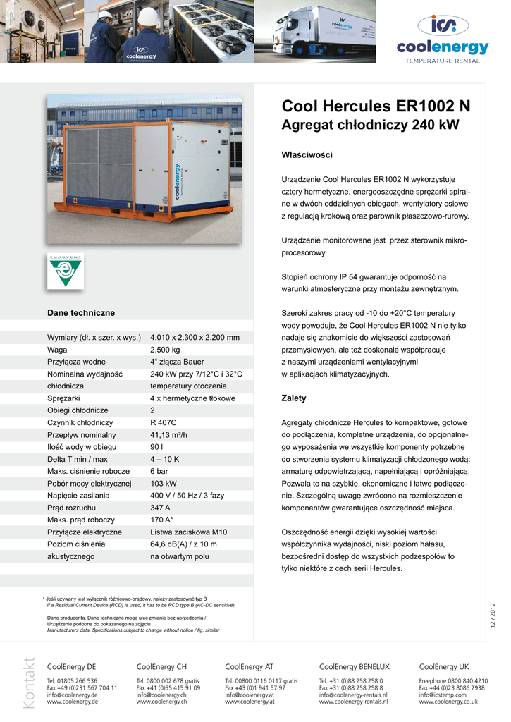 Cool Hercules ER1002 N Agregat chłodniczy 240 kW Właściwości Urządzenie Cool Hercules ER1002 N wykorzystuje cztery hermetyczne, energooszczędne sprężarki spiralne w dwóch oddzielnych obiegach, wentylatory osiowe z regulacją krokową oraz parownik płaszczowo-rurowy. Urządzenie monitorowane jest przez sterownik mikroprocesorowy. Stopień ochrony IP 54 gwarantuje odporność na warunki atmosferyczne przy montażu zewnętrznym. Dane techniczne Szeroki zakres pracy od -10 do +20°C temperatury wody powoduje, że Cool Hercules ER1002 N nie tylko Wymiary (dł. x szer. x wys.) 4.010 x 2.300 x 2.200 mm nadaje się znakomicie do większości zastosowań Waga 2.500 kg przemysłowych, ale też doskonale współpracuje Przyłącza wodne 4“ złącza Bauer z naszymi urządzeniami wentylacyjnymi Nominalna wydajność 240 kW przy 7/12°C i 32°C w aplikacjach klimatyzacyjnych. chłodnicza temperatury otoczenia Sprężarki 4 x hermetyczne tłokowe Obiegi chłodnicze 2 Czynnik chłodniczy R 407C Agregaty chłodnicze Hercules to kompaktowe, gotowe Przepływ nominalny 41,13 m³/h do podłączenia, kompletne urządzenia, do opcjonalne- Ilość wody w obiegu 90 l go wyposażenia we wszystkie komponenty potrzebne Delta T min / max 4 – 10 K do stworzenia systemu klimatyzacji chłodzonego wodą: Maks. ciśnienie robocze 6 bar armaturę odpowietrzającą, napełniającą i opróżniającą. Pobór mocy elektrycznej 103 kW Pozwala to na szybkie, ekonomiczne i łatwe podłącze- Napięcie zasilania 400 V / 50 Hz / 3 fazy nie. Szczególną uwagę zwrócono na rozmieszczenie Prąd rozruchu 347 A komponentów gwarantujące oszczędność miejsca. Maks. prąd roboczy 170 A* Przyłącze elektryczne Listwa zaciskowa M10 Oszczędność energii dzięki wysokiej wartości Poziom ciśnienia 64,6 dB(A) / z 10 m współczynnika wydajności, niski poziom hałasu, akustycznego na otwartym polu bezpośredni dostęp do wszystkich podzespołów to Zalety tylko niektóre z cech serii Hercules. 12 / 2012 * Jeśli używany jest wyłącznik różnicowo-prądowy, należy zastosować typ B If a Residual Current Device (RCD) is used, it has to be RCD type B (AC-DC sensitive) Kontakt Dane producenta. Dane techniczne mogą ulec zmianie bez uprzedzenia / Urządzenie podobne do pokazanego na zdjęciu Manufacturers data. Specifications subject to change without notice / fig. similar CoolEnergy DE CoolEnergy CH CoolEnergy AT CoolEnergy BENELUX CoolEnergy UK Tel. 01805 266 536 Fax +49 (0)231 567 704 11 [email protected] www.coolenergy.de Tel. 0800 002 678 gratis Fax +41 (0)55 415 91 09 [email protected] www.coolenergy.ch Tel. 00800 0116 0117 gratis Fax +43 (0)1 941 57 97 [email protected] www.coolenergy.at Tel. +31 (0)88 258 258 0 Fax +31 (0)88 258 258 8 [email protected] www.coolenergy-rentals.nl Freephone 0800 840 4210 Fax +44 (0)23 8086 2938 [email protected] www.coolenergy.co.uk