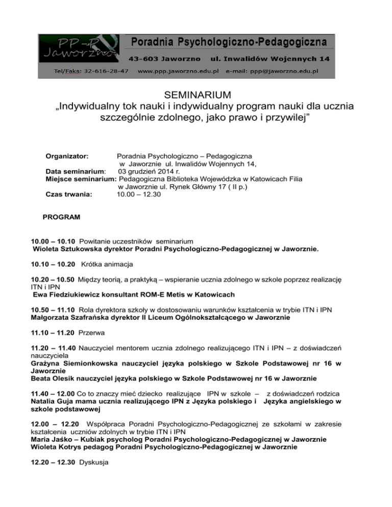 SEMINARIUM „Indywidualny tok nauki i indywidualny program nauki dla ucznia szczególnie zdolnego, jako prawo i przywilej” Poradnia Psychologiczno – Pedagogiczna w Jaworznie ul. Inwalidów Wojennych 14, Data seminarium: 03 grudzień 2014 r. Miejsce seminarium: Pedagogiczna Biblioteka Wojewódzka w Katowicach Filia w Jaworznie ul. Rynek Główny 17 ( II p.) Czas trwania: 10.00 – 12.30 Organizator: PROGRAM 10.00 – 10.10 Powitanie uczestników seminarium Wioleta Sztukowska dyrektor Poradni Psychologiczno-Pedagogicznej w Jaworznie. 10.10 – 10.20 Krótka animacja 10.20 – 10.50 Między teorią, a praktyką – wspieranie ucznia zdolnego w szkole poprzez realizację ITN i IPN Ewa Fiedziukiewicz konsultant ROM-E Metis w Katowicach 10.50 – 11.10 Rola dyrektora szkoły w dostosowaniu warunków kształcenia w trybie ITN i IPN Małgorzata Szafrańska dyrektor II Liceum Ogólnokształcącego w Jaworznie 11.10 – 11.20 Przerwa 11.20 – 11.40 Nauczyciel mentorem ucznia zdolnego realizującego ITN i IPN – z doświadczeń nauczyciela Grażyna Siemionkowska nauczyciel języka polskiego w Szkole Podstawowej nr 16 w Jaworznie Beata Olesik nauczyciel języka polskiego w Szkole Podstawowej nr 16 w Jaworznie 11.40 – 12.00 Co to znaczy mieć dziecko realizujące IPN w szkole – z doświadczeń rodzica Natalia Guja mama ucznia realizującego IPN z Języka polskiego i Języka angielskiego w szkole podstawowej 12.00 – 12.20 Współpraca Poradni Psychologiczno-Pedagogicznej ze szkołami w zakresie kształcenia uczniów zdolnych w trybie ITN i IPN Maria Jaśko – Kubiak psycholog Poradni Psychologiczno-Pedagogicznej w Jaworznie Wioleta Kotrys pedagog Poradni Psychologiczno-Pedagogicznej w Jaworznie 12.20 – 12.30 Dyskusja
