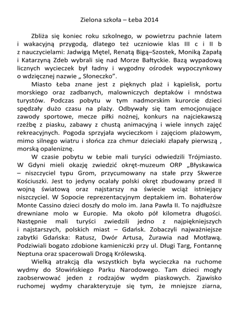 Zielona szkoła – Łeba 2014 Zbliża się koniec roku szkolnego, w powietrzu pachnie latem i wakacyjną przygodą, dlatego też uczniowie klas III c i II b z nauczycielami: Jadwigą Mętel, Renatą Bigą–Szostek, Moniką Zapałą i Katarzyną Zdeb wybrali się nad Morze Bałtyckie. Bazą wypadową licznych wycieczek był ładny i wygodny ośrodek wypoczynkowy o wdzięcznej nazwie „ Słoneczko”. Miasto Łeba znane jest z pięknych plaż i kąpielisk, portu morskiego oraz zadbanych, malowniczych deptaków i mnóstwa turystów. Podczas pobytu w tym nadmorskim kurorcie dzieci spędzały dużo czasu na plaży. Odbywały się tam emocjonujące zawody sportowe, mecze piłki nożnej, konkurs na najciekawszą rzeźbę z piasku, zabawy z chustą animacyjną i wiele innych zajęd rekreacyjnych. Pogoda sprzyjała wycieczkom i zajęciom plażowym, mimo silnego wiatru i słooca zza chmur dzieciaki złapały pierwszą , morską opaleniznę. W czasie pobytu w Łebie mali turyści odwiedzili Trójmiasto. W Gdyni mieli okazję zwiedzid okręt-muzeum ORP „Błyskawica – niszczyciel typu Grom, przycumowany na stałe przy Skwerze Kościuszki. Jest to jedyny ocalały polski okręt zbudowany przed II wojną światową oraz najstarszy na świecie wciąż istniejący niszczyciel. W Sopocie reprezentacyjnym deptakiem im. Bohaterów Monte Cassino dzieci doszły do molo im. Jana Pawła II. To najdłuższe drewniane molo w Europie. Ma około pół kilometra długości. Następnie mali turyści zwiedzili jedno z najpiękniejszych i najstarszych, polskich miast – Gdaosk. Zobaczyli najważniejsze zabytki Gdaoska: Ratusz, Dwór Artusa, Żurawia nad Motławą. Podziwiali bogato zdobione kamieniczki przy ul. Długi Targ, Fontannę Neptuna oraz spacerowali Drogą Królewską. Wielką atrakcją dla wszystkich była wycieczka na ruchome wydmy do Słowioskiego Parku Narodowego. Tam dzieci mogły zaobserwowad jeden z rodzajów wydm piaskowych. Zjawisko ruchomej wydmy charakteryzuje się tym, że mniejsze ziarna, występujące w niewielkich ilościach w piasku nadmorskim, są zwiewane ze szczytu. Ciągłe przesypywanie się ziaren piasku powoduje stopniowe przemieszczanie się szczytów wydm zgodnie z kierunkiem wiatrów. Ciekawym doświadczeniem dla dzieci była wizyta w Parku Jurajskim, przepięknie położonym na obszarze 20 hektarów, wśród lasów, stawów i trzęsawisk. Podczas spaceru uroczymi ścieżkami poznawały prehistoryczne gady. W mini ZOO z zaciekawieniem oglądały współczesne zwierzęta: daniele, kozy, osiołki, lamy, owce, jelenie, kucyki i wiele innych. W Parku Dinozaurów było też coś dla fanów motoryzacji, którzy mogli spróbowad swoich sił, poruszając się „z prędkością światła” pojazdem Flinstonów - napędzanym pedałami. Kolejną atrakcją w tym niezwykłym miejscu była ścieżka ekologiczna prowadząca przez las. Oprócz pozujących do zdjęd dinozaurów były tam liczne tablice informacyjne wzbogacające wiedzę dzieci na temat dawnej i obecnej fauny i flory, botaniki i zoologii, a przede wszystkim ekologii. W trakcie zwiedzania Parku Jurajskiego uczniowie brali udział w zabawie z piratami oraz uczyli się taoców pirackich. Niektórzy mieli pecha, ponieważ piraci postanowili ich związad, ogolid bardzo ostrym nożem i nawet wymierzyd karę twardym, drewnianym wiosłem. Było bardzo wesoło. Na koniec wszyscy trafili do wioski indiaoskiej, gdzie zakupili pamiątki – między innymi ostre, drewniane topory. W kolejnym dniu pobytu nad morzem uczniowie zaprzyjaźnionych klas odwiedzili latarnię morską Stilo. Wieża latarni położona jest na wierzchołku wydmy, odległej około 1000 m od morza. Wyjście na taras widokowy na szczycie latarni był dla większości nie lada wyczynem. Z góry roztaczał się przepiękny widok na zielone, sosnowe lasy, nadmorskie plaże i błękitną taflę morza. Wielką przygodą dla dzieci była wizyta w Sea Parku w Sarbsku, jedynym takim parku w Polsce, związanym tematycznie z fauną i florą mórz i oceanów, a także z kulturą i historią Pomorza. Największe wrażenie na uczestnikach wycieczki zrobiły urocze foki oraz ich przepiękne kuzynki kotiki, które sprytnie wykonywały sztuczki z piłkami, kółkami ringo, aportowały swoim opiekunom jak pieski. Wizyta w Oceanarium Prehistorycznym dostarczyła dzieciom wielu wiadomości o podwodnych stworach żyjących miliony lat temu. Duże wrażenie robił park makiet zwierząt morskich i park makiet latarni oraz przeżycie ataku rekina uderzającego w szybę, która pęka i woda zrasza uczestników tego niezwykłego spektaklu. Podsumowaniem pobytu w tym ciekawym miejscu były zabawy w parku zręcznościowo-linowym oraz zakupienie niezbędnych pamiątek. W czasie pobytu w ośrodku „Słoneczko” uczniowie wzięli również udział w zajęciach edukacyjnych pod hasłem Błękitny Patrol WWF. Zajęcia te miały na celu zapoznanie z chronionymi gatunkami ssaków żyjącymi w Bałtyku: foką szarą i morświnem bałtyckim. W czasie tej prelekcji, wzbogaconej pokazem slajdów, dzieci poznały także nadmorskie gatunki ptaków takich jak: siweczka obrożna, rybitwa białoczelna, rybitwa czubata i rzeczna oraz ostrygojad. W czasie „turnusu” miały również miejsce konkursy: plastyczny i czystości. Wieczorami odbywały się dyskoteki oraz konkursy karaoke. Podczas pobytu w „Słoneczku” dzieci chętnie korzystały z boisk, placu zabaw, siłowni na świeżym powietrzu, olbrzymiej trampoliny, parku linowego oraz jeździły na gokardach. Na pewno na nudę nikt nie narzekał. W drodze powrotnej mali turyści zwiedzili niezwykłe miejsce - Szymbark, a w nim dom do góry nogami – dom stojący na dachu. Symbol naszych czasów - świata pełnego sprzeczności i zagrożeo. Krótki pobyt w domu do góry nogami powoduje zaburzenie zmysłu równowagi. W Szymbarku „koloniści” odwiedzili Bunkier Gryfa Pomorskiego - rekonstrukcję bunkra tajnej organizacji wojskowej Gryf Pomorski. W całk