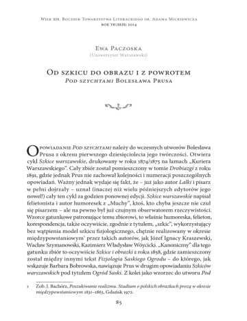 Wiek XIX . Rocznik Towarzystwa Literackiego im. Adama Mickiewicza rok VIi (XLix) 2014 Ewa Paczoska (Uniwersy tet Warszawski) Od szkicu do obrazu i z powrotem Pod szychtami Bolesława Prusa O powiadanie Pod szychtami należy do wczesnych utworów Bolesława Prusa z okresu pierwszego dziesięciolecia jego twórczości. Otwiera cykl Szkice warszawskie, drukowany w roku 1874/1875 na łamach „Kuriera Warszawskiego”. Cały zbiór został pomieszczony w tomie Drobiazgi z roku 1891, gdzie jednak Prus nie zachował kolejności i numeracji poszczególnych opowiadań. Ważny jednak wydaje się fakt, że – już jako autor Lalki i pisarz w pełni dojrzały – uznał (inaczej niż wielu późniejszych edytorów jego nowel!) cały ten cykl za godzien ponownej edycji. Szkice warszawskie napisał felietonista i autor humoresek z „Muchy”, ktoś, kto chyba jeszcze nie czuł się pisarzem – ale na pewno był już czujnym obserwatorem rzeczywistości. Wzorce gatunkowe patronujące temu zbiorowi, to właśnie humoreska, felieton, korespondencja, także oczywiście, zgodnie z tytułem, „szkic”, wykorzystujący bez wątpienia model szkicu fizjologicznego, chętnie realizowany w okresie międzypowstaniowym1 przez takich autorów, jak Józef Ignacy Kraszewski, Wacław Szymanowski, Kazimierz Władysław Wóycicki. „Kanoniczny” dla tego gatunku zbiór to oczywiście Szkice i obrazki z roku 1858, gdzie zamieszczony został między innymi tekst Fizjologia Saskiego Ogrodu – do którego, jak wskazuje Barbara Bobrowska, nawiązuje Prus w drugim opowiadaniu Szkiców warszawskich pod tytułem Ogród Saski. Z kolei jako wzorzec do utworu Pod 1 Zob. J. Bachórz, Poszukiwanie realizmu. Studium o polskich obrazkach prozą w okresie międzypowstaniowym 1831–1863, Gdańsk 1972. 85 • Ewa Paczoska • szychtami badaczka (idąc za Józefem Bachórzem) wskazuje szkic portretowy Wóycickiego Przekupka warszawska2. Maciejowa „spod szychtów” nie jest jednak przekupką, ale warszawską śmieciarką. Jej skrócony, zaledwie półstronicowy portret w istocie wykorzystuje zasadę szkicu fizjologicznego – oparty jest na kilku charakterystycznych rysach, którymi chętnie posługują się autorzy tego rodzaju środowiskowych typologii. Narrator wykorzystuje tu także stylizację gwarową, szukając efektu językowego obrazu tego egzotycznego dlań świata. Egzotycznego – ponieważ obserwator, także zgodnie z regułami szkicu, doń nie należy (to dlatego kształty śmieciarki porówna do pięknej Heleny). Przypomnijmy, że autor fizjologii odgrywa rolę poszukiwacza prawdy w mikroodsłonach, których zbiór przynieść ma sprawdzoną i pełną wiedzę o świecie, zgodnie z zasadą organizującą tę wizję rzeczywistości: „od kamyków do mozaiki”. Zamiast jednak przystąpić do następnych podobnych w charakterze mikroobserwacji, narrator Prusa, ujawniwszy wcześniej swe zainteresowania „fizjologa”, wycofuje się, znika – zresztą wraz z panią Maciejową, przywołaną jeszcze raz w drugim segmencie utworu, ale z daleka, z zupełnie odmiennej perspektywy. Na plac „pod szychtami” patrzymy tu z góry, wykorzystując też optykę zmiany: czasu, przestrzeni, pogody, ukształtowania terenu. Plac staje się w tym miejscu wręcz figurą zmiany – bo „rozwala się” nieoczekiwanie nad Wisłą i podlega nieustannej metamorfozie, zależnej, jak mówi narrator, od „epoki” kształtującej jego obraz. Jeśli inne miejsca w mieście, jak przywoływany tu Ogród Krasińskich, mają strukturę stałą, w tym fragmencie miejskiej przestrzeni wszystko się nieustannie destabilizuje. W okresie przyboru wody w Wiśle plac to „rodzaj przylądka i półwyspu”3, w czasie suszy – wyschnięta ziemia niczyja i wielki śmietnik. Zmieniają się też ludzie, którzy odwiedzają to miejsce. Jedyną stałą jakością pozostaje wrażenie „rozłażenia się”, rozkładania, nie tylko dlatego, że w porze suszy tu właśnie pani Maciejowa „łata wiecznie rozłażący się kaftanik”. Przestrzenią przybierającą kolejno formy: jeziora, półwyspu, sadzawki, bagna, błota i śmietniska, rządzi reguła destrukcji, organizuje ją wektor śmierci. Egzotyczny w pierwszym segmencie szkic z życia „nizin” zamienia się w rozpoznanie sił rozkładu. To dlatego w segmencie trzecim śmietnisko przy ulicy Dobrej zostaje porównane do cmentarza. Tu wrażenie „rozłażenia się” przestrzeni, z daleka przypominającej rozrastanie się zbuntowanych, rakowatych komórek, zyskuje dodatkowe efekty, bo znów następuje zmiana perspektywy. Wraz z narratorem 2 3 B. Bobrowska, Małe narracje Prusa, Gdańsk 2004, s. 126. B. Prus, Pod szychtami, w: tegoż, Drobiazgi, Warszawa 1892, s. 4. 86 • Od szkicu do obrazu i z powrotem. Pod szychtami Bolesława Prusa • skracamy dystans, znajdujemy się bardzo blisko obserwowanego obiektu: „Najwstrętniejsze kupy różnorodnych szczątków wypierają się nawzajem, tworząc pstry dywan, nad którym pływa obmierzła woń padliny i spośród dziur którego listki nędznej, skrofulicznej trawy wydzierają się do słońca, jakby błagając go o ratunek przeciw haniebnemu sąsiedztwu”4. Obserwatora nie chroni tu już ani dystans poszukiwacza osobliwości, ani odległość topograficzna, jest atakowany ze wszystkich stron i wobec „miazmatów” rozkładu musi stracić poczucie bezpieczeństwa. „Kanał, śmietnik i filtry” – trójca organizująca przestrzeń placu pod szychtami – „[…] nasuwa pytanie: po co człowiek żyje na tym świecie? Czy po to, aby służyć za ogniwo między kanałem a filtrem?…”5. Po tej refleksji żurnalistycznego poszukiwacza mądrości narrator jednak znów rezygnuje z wybranej wcześniej roli, nie chce, choć przecież mógłby, dalej zajmować się „higieną i filozofią”. Znów porzuca wybraną perspektywę obserwacji, bo ta nieuchronnie zdaje się prowadzić w stronę jakiegoś dziennikarskiego stereotypu czy ustabilizowa