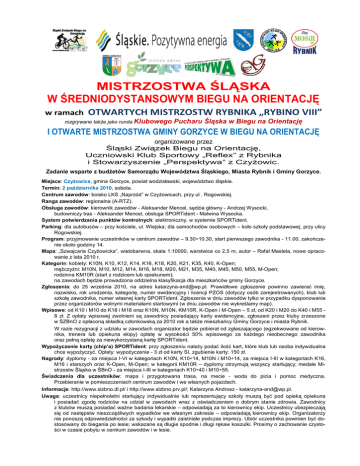 MISTRZOSTWA ŚLĄSKA W ŚREDNIODYSTANSOWYM BIEGU NA ORIENTACJĘ w ramach OTWARTYCH MISTRZOSTW RYBNIKA „RYBINO VIII” rozgrywane także jako runda Klubowego Pucharu Śląska w Biegu na Orientację I OTWARTE MISTRZOSTWA GMINY GORZYCE W BIEGU NA ORIENTACJĘ organizowane przez Śląski Związek Biegu na Orientację, Uczniowski Klub Sportowy „Reflex” z Rybnika i Stowarzyszenie „Perspektywa” z Czyżowic. Zadanie wsparte z budżetów Samorządu Województwa Śląskiego, Miasta Rybnik i Gminy Gorzyce. Miejsce: Czyżowice, gmina Gorzyce, powiat wodzisławski, województwo śląskie. Termin: 2 października 2010, sobota. Centrum zawodów: boisko LKS „Naprzód” w Czyżowicach, przy ul . Rogowskiej. Ranga zawodów: regionalna (A-RTZ). Obsługa zawodów: kierownik zawodów - Aleksander Mencel, sędzia główny - Andrzej Wysocki, budowniczy tras - Aleksander Mencel, obsługa SPORTident - Malwina Wysocka. System potwierdzania punktów kontrolnych: elektroniczny, w systemie SPORTident. Parking: dla autobusów – przy kościele, ul. Wiejska; dla samochodów osobowych – koło szkoły podstawowej, przy ulicy Rogowskiej. Program: przyjmowanie uczestników w centrum zawodów – 9.30÷10.30, start pierwszego zawodnika - 11.00, zakończenie około godziny 14. Mapa: „Szwajcaria Czyżowicka”, wielobarwna, skala 1:10000, warstwice co 2,5 m, autor – Rafał Mastela, nowe opracowanie z lata 2010 r. Kategorie: kobiety: K10N, K10, K12, K14, K16, K18, K20, K21, K35, K40, K-Open; mężczyźni: M10N, M10, M12, M14, M16, M18, M20, M21, M35, M40, M45, M50, M55, M-Open; rodzinna KM10R (start z rodzicem lub opiekunem); na zawodach będzie prowadzona oddzielna klasyfikacja dla mieszkańców gminy Gorzyce. Zgłoszenia: do 25 września 2010, na adres [email protected]. Prawidłowe zgłoszenie powinno zawierać imię, nazwisko, rok urodzenia, kategorię, numer ewidencyjny i licencji PZOS (dotyczy osób zarejestrowanych), klub lub szkołę zawodnika, numer własnej karty SPORTident. Zgłoszenia w dniu zawodów tylko w przypadku dysponowania przez organizatorów wolnymi materiałami startowymi (w dniu zawodów nie wykreślamy map). Wpisowe: od K10 i M10 do K18 i M18 oraz K10N, M10N, KM10R, K-Open i M-Open – 5 zł, od K20 i M20 do K40 i M55 8 zł. Z opłaty wpisowej zwolnieni są zawodnicy posiadający karty ewidencyjne, zgłoszeni przez kluby zrzeszone w ŚZBnO z opłaconą składką członkowską za 2010 rok a także mieszkańcy Gminy Gorzyce i miasta Rybnik. W razie rezygnacji z udziału w zawodach organizator będzie pobierał od zgłaszającego (egzekwowane od kierownika, trenera lub opiekuna ekipy) opłatę w wysokości 50% wpisowego za każdego nieobecnego zawodnika oraz pełną opłatę za niewykorzystaną kartę SPORTident. Wypożyczenie karty (chip’a) SPORTident: przy zgłoszeniu należy podać ilość kart, które klub lub osoba indywidualna chce wypożyczyć. Opłaty: wypożyczenie - 3 zł od karty SI, zgubienie karty: 150 zł. Nagrody: dyplomy - za miejsca I-VI w kategoriach K10N, K10÷14, M10N i M10÷14, za miejsca I-III w kategoriach K16, M16 i starszych oraz K-Open, M-Open; w kategorii KM10R – dyplomy otrzymują wszyscy startujący; medale Mistrzostw Śląska w ŚBnO - za miejsca I-III w kategoriach K10÷40 i M10÷55. Świadczenia dla uczestników: mapa i przygotowana trasa, na mecie - woda do picia i pomoc medyczna. Przebieranie w pomieszczeniach centrum zawodów i we własnych pojazdach. Informacje: http://www.slzbno.dl.pl/ i http://www.slzbno.prv.pl/; Katarzyna Androsz - [email protected]. Uwaga: uczestnicy niepełnoletni startujący indywidualnie lub reprezentujący szkoły muszą być pod opieką opiekuna i posiadać zgodę rodziców na udział w zawodach wraz z oświadczeniem o dobrym stanie zdrowia. Zawodnicy z klubów muszą posiadać ważne badania lekarskie – odpowiadają za to kierownicy ekip. Uczestnicy ubezpieczają się od następstw nieszczęśliwych wypadków we własnym zakresie – odpowiadają kierownicy ekip. Organizatorzy nie ponoszą odpowiedzialności za szkody i wypadki zaistniałe podczas imprezy. Ubiór uczestnika powinien być dostosowany do biegania po lesie; wskazane są długie spodnie i długi rękaw koszulki. Prosimy o zachowanie czystości w czasie pobytu w centrum zawodów i w lesie.