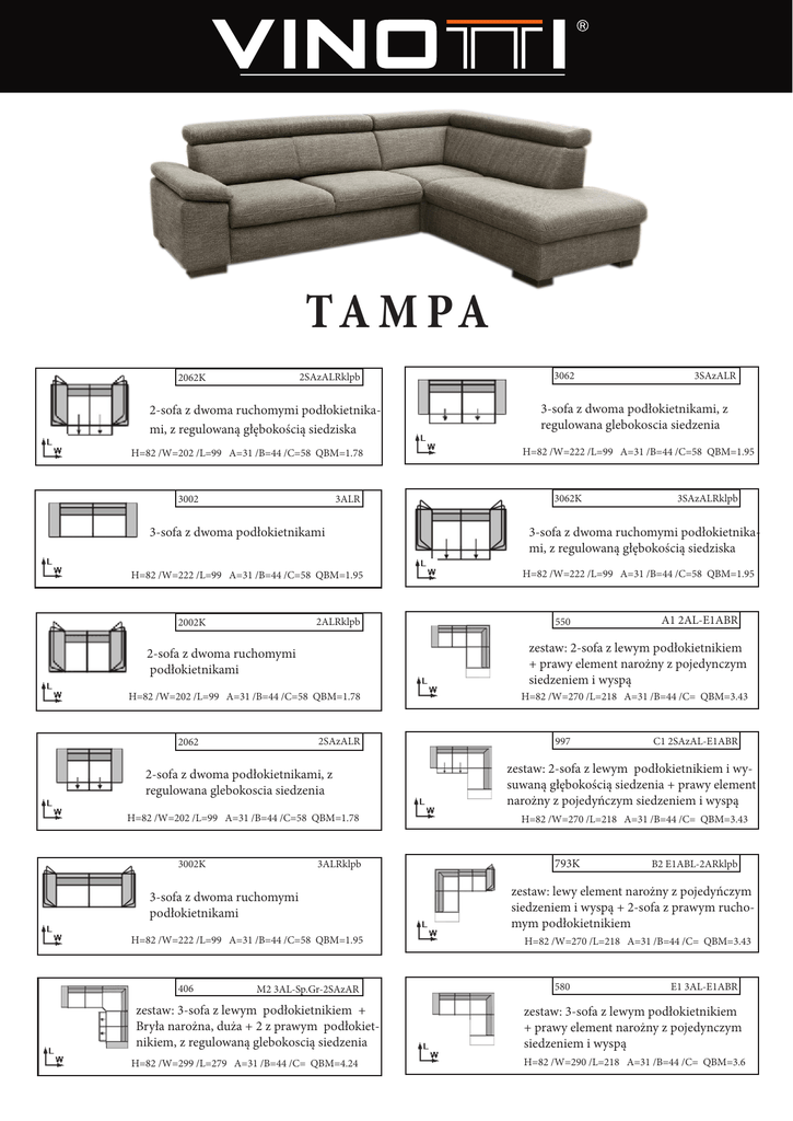 T A M PA 2SAzALRklpb 2062K 2-sofa z dwoma ruchomymi podłokietnikami, z regulowaną głębokością siedziska H=82 /W=202 /L=99 A=31 /B=44 /C=58 QBM=1.78 3002 3ALR 3-sofa z dwoma podłokietnikami H=82 /W=222 /L=99 A=31 /B=44 /C=58 QBM=1.95 2ALRklpb 2002K H=82 /W=202 /L=99 A=31 /B=44 /C=58 QBM=1.78 2SAzALR 2-sofa z dwoma podłokietnikami, z regulowana glebokoscia siedzenia H=82 /W=202 /L=99 A=31 /B=44 /C=58 QBM=1.78 3002K 3ALRklpb 3-sofa z dwoma ruchomymi podłokietnikami H=82 /W=222 /L=99 A=31 /B=44 /C=58 QBM=1.95 406 3SAzALR 3-sofa z dwoma podłokietnikami, z regulowana glebokoscia siedzenia H=82 /W=222 /L=99 A=31 /B=44 /C=58 QBM=1.95 3062K 3SAzALRklpb 3-sofa z dwoma ruchomymi podłokietnikami, z regulowaną głębokością siedziska H=82 /W=222 /L=99 A=31 /B=44 /C=58 QBM=1.95 550 A1 2AL-E1ABR zestaw: 2-sofa z lewym podłokietnikiem + prawy element narożny z pojedynczym siedzeniem i wyspą 2-sofa z dwoma ruchomymi podłokietnikami 2062 3062 M2 3AL-Sp.Gr-2SAzAR zestaw: 3-sofa z lewym podłokietnikiem + Bryła narożna, duża + 2 z prawym podłokietnikiem, z regulowaną glebokoscią siedzenia H=82 /W=299 /L=279 A=31 /B=44 /C= QBM=4.24 H=82 /W=270 /L=218 A=31 /B=44 /C= QBM=3.43 997 C1 2SAzAL-E1ABR zestaw: 2-sofa z lewym podłokietnikiem i wysuwaną głębokością siedzenia + prawy element narożny z pojedyńczym siedzeniem i wyspą H=82 /W=270 /L=218 A=31 /B=44 /C= QBM=3.43 793K B2 E1ABL-2ARklpb zestaw: lewy element narożny z pojedyńczym siedzeniem i wyspą + 2-sofa z prawym ruchomym podłokietnikiem H=82 /W=270 /L=218 A=31 /B=44 /C= QBM=3.43 580 E1 3AL-E1ABR zestaw: 3-sofa z lewym podłokietnikiem + prawy element narożny z pojedynczym siedzeniem i wyspą H=82 /W=290 /L=218 A=31 /B=44 /C= QBM=3.6 418 I1 2AL-Sp.Gr-2AR zestaw: 2-sofa z lewym podłokietnikiem + narożnik standardowy szeroki + 2-sofa z prawym podłokietnikiem H=82 /W=279 /L=279 A=31 /B=44 /C= QBM=4.07 361K L1 2SAzALklpb-Sp.Gr-2ARklpb zestaw: 2 z lewym ruchomym podłokietnikiem, z regulowaną glebokoscią siedzenia + Bryła narożna, duża + 2-sofa z prawym ruchomym podłokietnikiem H=82 /W=279 /L=299 A=31 /B=44 /C=58 QBM=1.78 405K N1 2SAzALklpb-Sp.Gr-3ARklpb zestaw: 2 z lewym ruchomym podłokietnikiem, z regulowaną glebokoscią siedzenia + Bryła narożna, duża + 3-sofa z prawym ruchomym podłokietnikiem H=82 /W=279 /L=299 A=31 /B=44 /C= QBM=4.24 4652K Z2 LALklpb-2-Sp.Gr-2ARklpb zestaw: Longchair z lewymruchomym podłokietnikiem + 2-sofa bez podłokietników + Bryła narożna, duża + 2-sofa z prawym ruchomym podłokietnikiem H=82 /W=352 /L=207 A=31 /B=44 /C= QBM=5.31 589K D2 E1ABL-2SAzARklpb zestaw: lewy element narożny z pojedyńczym siedzeniem i wyspą + 2-sofa z prawym ruchomym podłokietnikiem i wysuwaną głębokością siedzenia H=82 /W=270 /L=218 A=31 /B=44 /C=58 QBM=1.78 592K F2 E1ABL-3ARklpb zestaw: lewy element narożny z pojedynczym siedzeniem i wyspą + 3-sofa z prawym ruchomym podłokietnikiem H=82 /W=290 /L=218 A=31 /B=44 /C= QBM=3.6 588K H2 E1ABL-3SAzARklpb zestaw: lewy element narożny z pojedyńczym siedzeniem i wyspą + 3-sofa z prawym ruchomym podłokietnikiem i wysuwaną głębokością siedzenia H=82 /W=290 /L=218 A=31 /B=44 /C= QBM=3.6 408 J2 2AL-Sp.Gr-2SAzAR zestaw: 2-sofa z lewym podłokietnikiem + Bryła narożna, duża + 2 z prawym podłokietnikiem, z regulowaną glebokoscią siedzenia H=82 /W=279 /L=279 A=31 /B=44 /C= QBM=4.07 4651K Z1 2ALklpb-Sp.Gr-2-LARklpb zestaw: 2-sofa z lewym ruchomym podłokietnikiem + Bryła narożna, duża + 2 bez podłokietników + Longchair z prawym ruchomym podłokietnikiem H=82 /W=279 /L=352 A=31 /B=44 /C= QBM=5.31 4656 BB1 E1ABL-3-LAR zestaw : Lewy element narożny z pojedynczym siedzeniem i wyspą + 3-sofa bez podłokietników + longchair prawy H=82 /W=363 /L=218 A=31 /B=44 /C= QBM=4.84 86K P1 3ALRklpb+2ALRklpb zestaw : 3-sofa z dwoma ruchomymi podłokietnikami + 2-sofa z dwoma ruchomymi podłokietnikami H=82 /W=222 /L=202 A=31 /B=44 /C= QBM=3.73 4742K DD1 2SAzALklpb-1,5-LARklpb zestaw: 2-sofa z lewym ruchomym podłokietnikiem, z regulowaną głębokością ssiedzenia + 1,5-Sofa bez podłokietników + Longchair z prawym ruchomym podłokietnikiem H=82 /W=345 /L=163 A=0 /B= /C= QBM=3.65 4652 Y2 LAL-2-Sp.Gr-2AR zestaw: Longchair z lewym podłokietnikiem + 2-sofa bez podłokietników + Bryła narożna, duża + 2-sofa z prawym podłokietnikiem H=82 /W=352 /L=279 A=31 /B=44 /C= QBM=5.31 551 AA2 LAL-2-E1ABR zestaw : Longchair lewy + 2-sofa bez podłokietników + prawy element narożny z pojedynczym siedzeniem i wyspą H=82 /W=343 /L=218 A=0 /B= /C= QBM=4.67 4743 C2 LAL-1,5-2SAzCAR zestaw: Longchair z lewym podłokietnikiem + 1,5-sofa bez podłokietników + 2-sofa z prawym podłokietnikiem, z regulowaną głębokością siedzenia H=82 /W=345 /L=163 A=0 /B= /C= QBM=3.65 551K EE2 LALklpb-2-E1ABR zestaw : Longchair lewy z ruchomym podlokietnikiem +2-sofa bez podłokietników + prawy element narożny z pojedynczym siedzeniem i wyspą H=82 /W=343 /L=218 A=0 /B= /C= QBM=4.67 Vinotti Sp. z o.o. S.K.A., ul. Zawiła 65e, 30-390 Kraków tel. +48 12 260 95 30, fax +48 12 262 02 84 e-mail: [email protected], www.vinotti.eu Właścicielem znaku towarowego Vinotti Furniture jest firma Vinotti Sp. z o.o. S.K.A. Firma Vinotti zastrzega sobie prawo do błędów edytorskich. Zdjęcia produktów mogą nieznacznie odbiegać od rzeczywistości. Podane wymiary są wartościami zewnętrznymi. Niniejszy katalog nie stanowi oferty w rozumieniu prawnym i jest publikowany jedynie w celach informacyjnych.