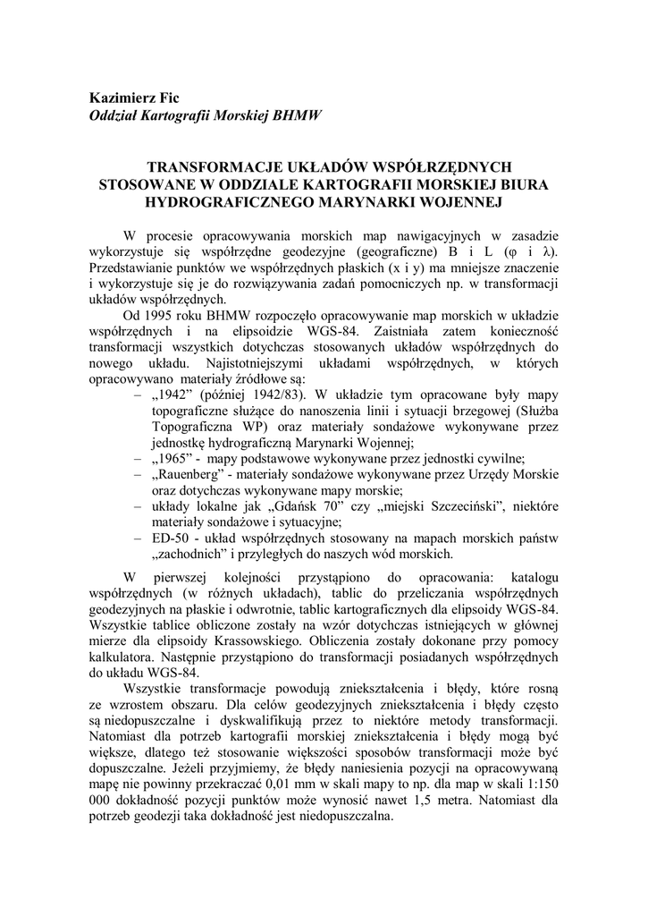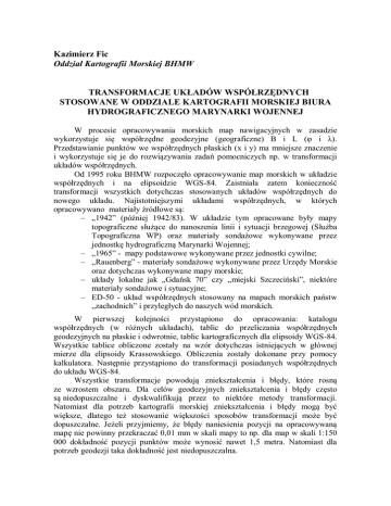 Kazimierz Fic Oddział Kartografii Morskiej BHMW TRANSFORMACJE UKŁADÓW WSPÓŁRZĘDNYCH STOSOWANE W ODDZIALE KARTOGRAFII MORSKIEJ BIURA HYDROGRAFICZNEGO MARYNARKI WOJENNEJ W procesie opracowywania morskich map nawigacyjnych w zasadzie wykorzystuje się współrzędne geodezyjne (geograficzne) B i L (φ i λ). Przedstawianie punktów we współrzędnych płaskich (x i y) ma mniejsze znaczenie i wykorzystuje się je do rozwiązywania zadań pomocniczych np. w transformacji układów współrzędnych. Od 1995 roku BHMW rozpoczęło opracowywanie map morskich w układzie współrzędnych i na elipsoidzie WGS-84. Zaistniała zatem konieczność transformacji wszystkich dotychczas stosowanych układów współrzędnych do nowego układu. Najistotniejszymi układami współrzędnych, w których opracowywano materiały źródłowe są: – „1942” (później 1942/83). W układzie tym opracowane były mapy topograficzne służące do nanoszenia linii i sytuacji brzegowej (Służba Topograficzna WP) oraz materiały sondażowe wykonywane przez jednostkę hydrograficzną Marynarki Wojennej; – „1965” - mapy podstawowe wykonywane przez jednostki cywilne; – „Rauenberg” - materiały sondażowe wykonywane przez Urzędy Morskie oraz dotychczas wykonywane mapy morskie; – układy lokalne jak „Gdańsk 70” czy „miejski Szczeciński”, niektóre materiały sondażowe i sytuacyjne; – ED-50 - układ współrzędnych stosowany na mapach morskich państw „zachodnich” i przyległych do naszych wód morskich. W pierwszej kolejności przystąpiono do opracowania: katalogu współrzędnych (w różnych układach), tablic do przeliczania współrzędnych geodezyjnych na płaskie i odwrotnie, tablic kartograficznych dla elipsoidy WGS-84. Wszystkie tablice obliczone zostały na wzór dotychczas istniejących w głównej mierze dla elipsoidy Krassowskiego. Obliczenia zostały dokonane przy pomocy kalkulatora. Następnie przystąpiono do transformacji posiadanych współrzędnych do układu WGS-84. Wszystkie transformacje powodują zniekształcenia i błędy, które rosną ze wzrostem obszaru. Dla celów geodezyjnych zniekształcenia i błędy często są niedopuszczalne i dyskwalifikują przez to niektóre metody transformacji. Natomiast dla potrzeb kartografii morskiej zniekształcenia i błędy mogą być większe, dlatego też stosowanie większości sposobów transformacji może być dopuszczalne. Jeżeli przyjmiemy, że błędy naniesienia pozycji na opracowywaną mapę nie powinny przekraczać 0,01 mm w skali mapy to np. dla map w skali 1:150 000 dokładność pozycji punktów może wynosić nawet 1,5 metra. Natomiast dla potrzeb geodezji taka dokładność jest niedopuszczalna. Aby zastosować jakąkolwiek metodę transformacji niezbędne jest posiadanie odpowiedniej ilości punktów wspólnych w starym i nowym układzie współrzędnych. W początkowym okresie BHMW nie posiadało żadnego punktu wspólnego, dlatego przystąpiono do transformacji wybranych punktów w układzie „1942” do WGS-84 przy pomocy modelu transformacji Bursy-Wolfa, wykorzystując dostępne wówczas współczynniki transformacji: ∆X = + 29,199 m ∆Y = - 106,452 m ∆Z = - 68,869 m k = - 1,4789 x 10-6 x = -0,594”= - 2,8798 10-6 [rad] y = -0,124”= - 6,0117 10-7 [rad] z = -0,066”= +3,1998 10-7 [rad] Wektorowe równanie transformacyjne w tym modelu ma postać: X wes = X+ (1+k) X42 + z Y42 - y Z42 Ywes = Y+ (1+k) Y42 + z X42 - x Z42 Z wes = Z + (1+k) Z42 + y X42 - x Y42 Zamianę współrzędnych geodezyjnych na współrzędne przestrzenne (kartezjańskie) i odwrotnie dokonuje się według wzorów przyjętych i stosowanych w geodezji. BHMW nie posiadało programów do przeliczeń, dlatego metoda była czasochłonna i wymagała wzmożonej uwagi ze względu na możliwość pomyłek. Współczynniki do transformacji nie były precyzyjne i metoda transformacji nie była zbyt dokładna. W późniejszym okresie, kiedy już otrzymano niektóre współrzędne punktów sieci POLREF, dokonano porównania i okazało się, że metodą Bursy-Wolfa popełniono następujące błędy na wybranych punktach: – Barzowice ∆= 2,18 m – Roszczyce ∆= 1,16 m – Buszkowy ∆= 1,29 m Ponieważ OKM wykorzystywał obliczone tą metodą współrzędne do dalszej transformacji, to błędy były przenoszone. Do transformacji metodą Bursy-Wolfa wybierano takie punkty, z których można było tworzyć trójkąty i dalej transformować współrzędne metodą afiniczną. Ukształtowanie naszego wybrzeża pozwala na ograniczone stosowanie metody afinicznej. Metodę tą można stosować tylko w Zatoce Gdańskiej, Zalewie Wiślanym, Zatoce Pomorskiej i Zalewie Szczecińskim. Natomiast na wybrzeżu środkowym od Rozewia do Niechorza metodę można stosować w ograniczonym zakresie. Dla wybrzeża środkowego najkorzystniejszą wydaje się być metoda Helmerta. Zarówno transformacja aficzna jak i Helmerta wykonywane są we współrzędnych płaskich. Z tego powodu konieczne są transformacje współrzędnych geodezyjnych na płaskie i odwrotnie. Jak już wspomniano wcześniej w OKM opracowano tablice do przeliczeń współrzędnych dla różnych elipsoid. Tablice obliczono jedynie dla pasa o szerokości 2° (od szerokości geograficznej 53° do 55°). W późniejszym okresie został opracowany program komputerowy „PRZELICZANIE”. Program ten opracowano dla elipsoid Bessela, Krassowskiego, Hayforda i WGS-84 (GRS-80) gdzie uwzględniono odwzorowania: Gaussa-Krügera oraz UTM. W programie istnieje również możliwość przeliczania współrzędnych w odwzorowaniach 1992 i 2000. Program jest wykorzystywany do chwili obecnej. W BHMW dosyć szeroko stosuje się transformacje metodą Mołodiejskiego, która jest zalecana przez Międzynarodową Organizację Hydrograficzną. Z całą pewnością metoda ta nie nadaje się do transformacji współrzędnych dla potrzeb geodezji, ale może być wystarczająco dokładna dla potrzeb nawigacji i 