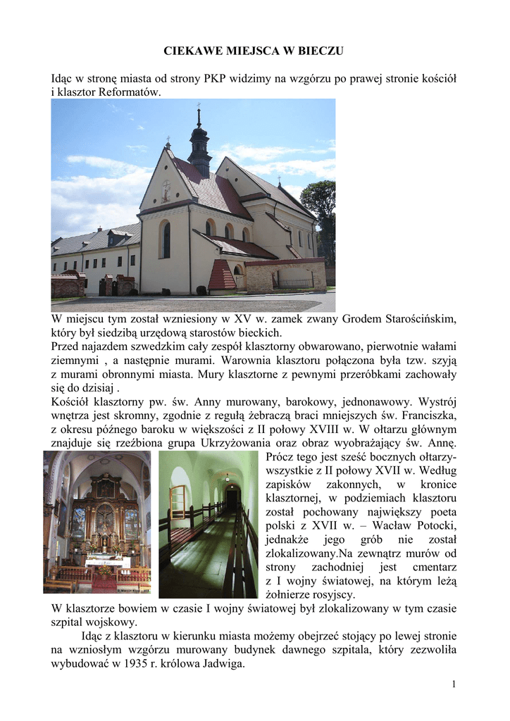 CIEKAWE MIEJSCA W BIECZU Idąc w stronę miasta od strony PKP widzimy na wzgórzu po prawej stronie kościół i klasztor Reformatów. W miejscu tym został wzniesiony w XV w. zamek zwany Grodem Starościńskim, który był siedzibą urzędową starostów bieckich. Przed najazdem szwedzkim cały zespół klasztorny obwarowano, pierwotnie wałami ziemnymi , a następnie murami. Warownia klasztoru połączona była tzw. szyją z murami obronnymi miasta. Mury klasztorne z pewnymi przeróbkami zachowały się do dzisiaj . Kościół klasztorny pw. św. Anny murowany, barokowy, jednonawowy. Wystrój wnętrza jest skromny, zgodnie z regułą Ŝebraczą braci mniejszych św. Franciszka, z okresu późnego baroku w większości z II połowy XVIII w. W ołtarzu głównym znajduje się rzeźbiona grupa UkrzyŜowania oraz obraz wyobraŜający św. Annę. Prócz tego jest sześć bocznych ołtarzywszystkie z II połowy XVII w. Według zapisków zakonnych, w kronice klasztornej, w podziemiach klasztoru został pochowany największy poeta polski z XVII w. – Wacław Potocki, jednakŜe jego grób nie został zlokalizowany.Na zewnątrz murów od strony zachodniej jest cmentarz z I wojny światowej, na którym leŜą Ŝołnierze rosyjscy. W klasztorze bowiem w czasie I wojny światowej był zlokalizowany w tym czasie szpital wojskowy. Idąc z klasztoru w kierunku miasta moŜemy obejrzeć stojący po lewej stronie na wzniosłym wzgórzu murowany budynek dawnego szpitala, który zezwoliła wybudować w 1935 r. królowa Jadwiga. 1 Wzgórze na którym zlokalizowany jest szpital ma szczególne znaczenie historyczne. Ostatnie badania historyczne wykazały, Ŝe juŜ w X-XI w. istniała na wzgórzu osada, o czym świadczy palenisko odkopane na głębokości 2 metrów, zlokalizowane nieco poniŜej fundamentów późniejszego zamku. Późnej wzniesiono na tym miejscu zamek(dwór królewski) jeden z 3 zamków na terenie Biecza; zamek ten w 1395 r. juŜ nie istniał. Wiadomość o nim potwierdziły odkopane fundamenty w 1958 r. W 1395 r. Królowa Jadwiga oddała plac, gdzie stał niegdyś dwór królewski i zbudowano na nim szpital. Budynek wzniesiony jest z gotyckiej cegły, a zewnętrzne mury zdobione są cegłą zendrówką we wzory geometryczne. Wewnątrz zachował się pierwotny układ pomieszczeń z drewnianymi przepierzkami o konstrukcji sumikowej, które zostały usunięte bezpowrotnie. Kilkadziesiąt metrów dalej w kierunku południowo- zachodnim od szpitala stoi podłuŜny budynek tzw. Gród. Został on wzniesiony na początku XVI w. Od połowy XVII w., po częściowej przebudowie mieściła się tutaj siedziba sądu grodzkiego. Obecnie jest to siedziba Zespół Szkół Nr 1 . Ze skarpy wzgórza, po drugiej stronie rzeki Ropy, widoczne są stare zabudowania, sięgające początku XV w. Idąc dalej w kierunku rynku mijamy po drodze stare kamieniczki. W pierzejach otaczających rynek zachowały się pod tymi kamieniczkami XIV-XVII wieczne piwnice, słuŜące niegdyś do przechowywania wina i innych towarów. Cały układ przestrzenno- urbanistyczne Biecza zachowały się z okresu średniowiecza. Sam rynek w kształcie prostokąta, przystosowany do celów handlowych, zachował się bez większych zmian. W środku rynku wnosi się ratusz z wieŜą, pierwotnie gotycki zbudowany w II połowie XV w. i przebudowany w XVI w. W XVIII w. budynek popadł w ruinę. Około roku 1830 r. rozebrano jego część wschodnią. Wewnątrz ratusza zachowały się gotyckie portale. Na zewnątrz widoczne są odkrywki na ścianach dawnego boniowania. Pierwotna wieŜa ratusza runęła w 1569 r. Obecna wzniesiona była w latach 15691580.WieŜa ratuszowa jest podpiwniczona. Piwnica zlokalizowana w części nadziemnej była miejscem tortur. Widoczne są na ścianach jeszcze ślady napisów z XVII w. w postaci dat, inicjałów nazwisk więźniów i kalendarzy. W niŜszej kondygnacji mieści się loch, do którego wtrącano skazańców. 2 Do ciekawszych zabytkowych obiektów Biecza naleŜy kamienica naroŜna w zachodniej pierzei rynku, która nosi nazwę legendarnego zbója Becza. Idąc w stronę Kościoła parafialnego znajduje się kamienica Barianów Rokickich, zwana takŜe Domem z Basztą lub Starą Apteką, która początkami swymi sięga 1523 r. Idąc w kierunku północnym od Kamienicy Rokickich, dochodzimy wąską uliczką do stojącej przy skrzyŜowaniu tej uliczki z ulicą Kromera starej kamieniczki mieszczańskiej (obecnie Muzeum Ziemi Bieckiej). W pobliŜu naroŜa północno- zachodniego fasady kościoła parafialnego wznosi się dzwonnica późnogotycka z XVw. usytuowana w linii dawnego muru obronnego. SłuŜyła ona celom obronnym, o czym świadczą zachowane kroksztyny na wysokości piętra, stanowiące podpory dawnego ganku, obiegającego dzwonnice oraz okienka strzelnicze zachowane w najwyŜszej kondygnacji. Do dzwonnicy przylega kaplica św. Barbary przebudowana w stylu neogotyckim w zeszłym stuleciu na miejscu poprzedniej kaplicy z XV w. Od strony południowej na murze oporowym umieszczonych jest 13 figur, przedstawiających apostołów, a fundowanych przez piątników z Węgier i róŜne osobistości z regionu Biecza. Kościół parafialny pod wezwaniem BoŜego Ciała w Bieczu, późnogotycki, halowy trójnawowy, z kaplicami, naleŜy do najcenniejszych zabytków architektury sakralnej w Polsce. 3 Najstarszą częścią kościoła jest prezbiterium zbudowane przed 1480 r. Kościół zbudowany jest z cegły oraz ciosów. Zewnętrzne ściany prezbiterium zdobione są wzorami geometrycznymi z ciemniejszej cegły. Po wyjściu z kościoła głównymi drzwiami, zaraz za bramą po prawej stronie widać krzyŜ poświęcony harcerzom z druŜyny bieckiej, poległym w pierwszej i drugiej wojnie światowej. Na tablicy pod krzyŜem umieszczone są nazwiska poległych. Za bramą po lewej stronie widoczny jest odkryty w 1964 r. barbakan, trzeci ze znanych w Polsce. Po prawej stronie ciągną się mury obronne w skład których wch