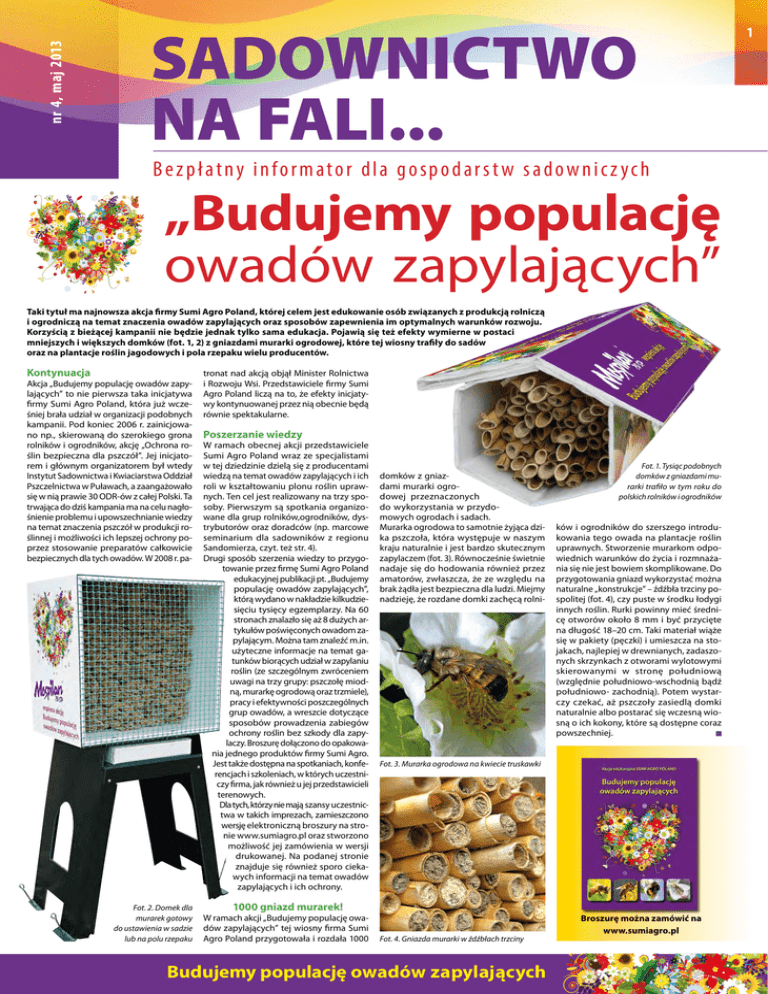 nr 4, maj 2013 1 Bezp łatny informator dla gospodarst w sadownic z ych „Budujemy populację owadów zapylających” Taki tytuł ma najnowsza akcja firmy Sumi Agro Poland, której celem jest edukowanie osób związanych z produkcją rolniczą i ogrodniczą na temat znaczenia owadów zapylających oraz sposobów zapewnienia im optymalnych warunków rozwoju. Korzyścią z bieżącej kampanii nie będzie jednak tylko sama edukacja. Pojawią się też efekty wymierne w postaci mniejszych i większych domków (fot. 1, 2) z gniazdami murarki ogrodowej, które tej wiosny trafiły do sadów oraz na plantacje roślin jagodowych i pola rzepaku wielu producentów. Akcja „Budujemy populację owadów zapylających” to nie pierwsza taka inicjatywa firmy Sumi Agro Poland, która już wcześniej brała udział w organizacji podobnych kampanii. Pod koniec 2006 r. zainicjowano np., skierowaną do szerokiego grona rolników i ogrodników, akcję „Ochrona roślin bezpieczna dla pszczół”. Jej inicjatorem i głównym organizatorem był wtedy Instytut Sadownictwa i Kwiaciarstwa Oddział Pszczelnictwa w Puławach, a zaangażowało się w nią prawie 30 ODR-ów z całej Polski. Ta trwająca do dziś kampania ma na celu nagłośnienie problemu i upowszechnianie wiedzy na temat znaczenia pszczół w produkcji roślinnej i możliwości ich lepszej ochrony poprzez stosowanie preparatów całkowicie bezpiecznych dla tych owadów. W 2008 r. pa- Fot. 2. Domek dla murarek gotowy do ustawienia w sadzie lub na polu rzepaku tronat nad akcją objął Minister Rolnictwa i Rozwoju Wsi. Przedstawiciele firmy Sumi Agro Poland liczą na to, że efekty inicjatywy kontynuowanej przez nią obecnie będą równie spektakularne. Poszerzanie wiedzy W ramach obecnej akcji przedstawiciele Sumi Agro Poland wraz ze specjalistami w tej dziedzinie dzielą się z producentami wiedzą na temat owadów zapylających i ich roli w kształtowaniu plonu roślin uprawnych. Ten cel jest realizowany na trzy sposoby. Pierwszym są spotkania organizowane dla grup rolników,ogrodników, dystrybutorów oraz doradców (np. marcowe seminarium dla sadowników z regionu Sandomierza, czyt. też str. 4). Drugi sposób szerzenia wiedzy to przygotowanie przez firmę Sumi Agro Poland edukacyjnej publikacji pt. „Budujemy populację owadów zapylających”, którą wydano w nakładzie kilkudziesięciu tysięcy egzemplarzy. Na 60 stronach znalazło się aż 8 dużych artykułów poświęconych owadom zapylającym. Można tam znaleźć m.in. użyteczne informacje na temat gatunków biorących udział w zapylaniu roślin (ze szczególnym zwróceniem uwagi na trzy grupy: pszczołę miodną, murarkę ogrodową oraz trzmiele), pracy i efektywności poszczególnych grup owadów, a wreszcie dotyczące sposobów prowadzenia zabiegów ochrony roślin bez szkody dla zapylaczy. Broszurę dołączono do opakowania jednego produktów firmy Sumi Agro. Jest także dostępna na spotkaniach, konferencjach i szkoleniach, w których uczestniczy firma, jak również u jej przedstawicieli terenowych. Dla tych, którzy nie mają szansy uczestnictwa w takich imprezach, zamieszczono wersję elektroniczną broszury na stronie www.sumiagro.pl oraz stworzono możliwość jej zamówienia w wersji drukowanej. Na podanej stronie znajduje się również sporo ciekawych informacji na temat owadów zapylających i ich ochrony. domków z gniazdami murarki ogrodowej przeznaczonych do wykorzystania w przydomowych ogrodach i sadach. Murarka ogrodowa to samotnie żyjąca dzika pszczoła, która występuje w naszym kraju naturalnie i jest bardzo skutecznym zapylaczem (fot. 3). Równocześnie świetnie nadaje się do hodowania również przez amatorów, zwłaszcza, że ze względu na brak żądła jest bezpieczna dla ludzi. Miejmy nadzieję, że rozdane domki zachęcą rolni- ków i ogrodników do szerszego introdukowania tego owada na plantacje roślin uprawnych. Stworzenie murarkom odpowiednich warunków do życia i rozmnażania się nie jest bowiem skomplikowane. Do przygotowania gniazd wykorzystać można naturalne „konstrukcje” – źdźbła trzciny pospolitej (fot. 4), czy puste w środku łodygi innych roślin. Rurki powinny mieć średnicę otworów około 8 mm i być przycięte na długość 18–20 cm. Taki materiał wiąże się w pakiety (pęczki) i umieszcza na stojakach, najlepiej w drewnianych, zadaszonych skrzynkach z otworami wylotowymi skierowanymi w stronę południową (względnie południowo-wschodnią bądź południowo- zachodnią). Potem wystarczy czekać, aż pszczoły zasiedlą domki naturalnie albo postarać się wczesną wiosną o ich kokony, które są dostępne coraz powszechniej. Fot. 3. Murarka ogrodowa na kwiecie truskawki 1000 gniazd murarek! W ramach akcji „Budujemy populację owadów zapylających” tej wiosny firma Sumi Agro Poland przygotowała i rozdała 1000 Fot. 1. Tysiąc podobnych domków z gniazdami murarki trafiło w tym roku do polskich rolników i ogrodników fot. 3, 4 J. Klepacz-Baniak Kontynuacja Fot. 4. Gniazda murarki w źdźbłach trzciny Budujemy populację owadów zapylających Broszurę można zamówić na www.sumiagro.pl 2 Zasady ochrony roślin bezpiecznej dla pszczół Dr Dariusz Teper, Instytut Ogrodnictwa Oddział Pszczelnictwa w Puławach W ostatnich latach obserwujemy z jednej strony zmniejszanie się populacji pszczół i innych owadów zapylających, z drugiej – rosnące zainteresowanie producentów roślin znaczeniem i ochroną tych pożytecznych owadów. O to, jak pogodzić produkcję roślin z wykorzystaniem niezbędnej ochrony chemicznej upraw z troską o bezpieczeństwo zapylaczy zapytaliśmy specjalistę ds. pszczół dr. Dariusza Tepera. Redakcja: Jak klasyfikuje się środki ochrony roślin (ś.o.r.) ze względu na zagrożenie dla pszczół? Dariusz Teper: Zgodnie z Rozporządzeniem Ministra Zdrowia z 29.10.2004 roku, ś.o.r. klasyfikuje się ze względu na zagrożenie stwarzane dla pszczół na podstawie ocen