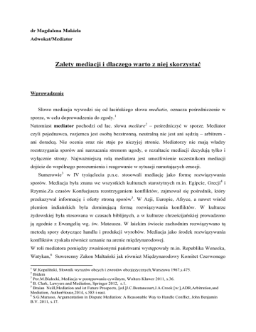 dr Magdalena Makieła Adwokat/Mediator Zalety mediacji i dlaczego warto z niej skorzystać Wprowadzenie Słowo mediacja wywodzi się od łacińskiego słowa mediatio, oznacza pośredniczenie w sporze, w celu doprowadzenia do zgody.1 Natomiast mediator pochodzi od łac. słowa mediare2 – pośredniczyć w sporze. Mediator czyli pojednawca, rozjemca jest osobą bezstronną, neutralną nie jest ani sędzią – arbitrem ani doradcą. Nie ocenia oraz nie staje po niczyjej stronie. Mediatorzy nie mają władzy rozstrzygania sporów ani narzucania stronom ugody, o rezultacie mediacji decydują tylko i wyłącznie strony. Najważniejszą rolą mediatora jest umożliwienie uczestnikom mediacji dojście do wspólnego porozumienia i reagowanie w sytuacji narastających emocji. Sumerowie3 w IV tysiącleciu p.n.e. stosowali mediację jako formę rozwiązywania sporów. Mediacja była znana we wszystkich kulturach starożytnych m.in. Egipcie, Grecji4 i Rzymie.Za czasów Konfucjusza rozstrzyganiem konfliktów, zajmował się pośrednik, który przekazywał informację i oferty stroną sporów5. W Azji, Europie, Afryce, a nawet wśród plemion indiańskich była dominującą formą rozwiązywania konfliktów. W kulturze żydowskiej była stosowana w czasach biblijnych, a w kulturze chrześcijańskiej prowadzono ją zgodnie z Ewangelią wg. św. Mateusza. W laickim świecie zachodnim rozwiązywano tą metodą spory dotyczące handlu i produkcji wyrobów. Mediacja jako środek rozwiązywania konfliktów zyskała również uznanie na arenie międzynarodowej. W roli mediatora pomiędzy zwaśnionymi państwami występowały m.in. Republika Wenecka, Watykan,6 Suwerenny Zakon Maltański jak również Międzynarodowy Komitet Czerwonego 1 W.Kopaliński, Słownik wyrazów obcych i zwrotów obcojęzycznych,Warszawa 1967,s.475. Ibidem 3 Por.M.Białecki, Mediacja w postępowaniu cywilnym, Wolters Kluwer 2011, s.36. 4 B. Clark, Lawyers and Mediation, Springer 2012, s.1. 5 Braian Neill,Mediation and ist Future Prospects, [ed.]J.C.Beatancourt,J.A.Crook [w:],ADR,Arbitration,and Mediation, AuthorHouse,2014, s.583 i nast. 6 S.G.Marasso, Argumentation in Dispute Mediation: A Reasonable Way to Handle Conflict, John Benjamin B.V. 2011, s.17. 2 Krzyża7. Rolę mediatorów, oprócz państw, podejmowali również ich przywódcy, np. doża Sebastiano Ziani występował jako mediator w sporze w 1177r., pomiędzy Fryderykiem Barbarossą a papieżem Aleksandrem III i Ligą lombardzką8. W międzynarodowych procesach mediacyjnych istotną rolę odegrała delegacja watykańska. Zaangażowana była w rozwiązywanie konfliktu, w latach 70-tych XX w., pomiędzy Chile a Argentyną o Kanał Bengale. Konflikt zakończył się sukcesem poprzez podpisanie aktu z Montevideo w 1979r. W latach 70-tych XX wieku groził gospodarce i wymiarowi sprawiedliwości USA - paraliż. W sądach amerykańskich wiele lat oczekiwano na wyroki, z powodu natłoku spraw. Stanowiło to realne zagrożenie w sprawnym funkcjonowaniu państwa9. Zaczęto wprowadzać metody alternatywne do rozwiązywania sporów tzw. ADR (ang: Alternative Dispute Resolution), które dały m.in. przedsiębiorcom szeroki wachlarz możliwość, aby uniknąć postępowania sądowego. W literaturze10 do podstawowych form ADR zalicza się mediację, arbitraż oraz koncyliację. W doktrynie jak i w praktyce mediacje określa się jako alternatywę w stosunku do postępowania sądowego. W latach dziewięćdziesiątych XX wieku europejskie środowisko prawnicze zaczęło akceptować mediację jako alternatywę dla postępowania sądowego. Sędziowie uzyskali możliwość proponowania mediacji stronom konfliktu, w celu uniknięcia długotrwałych procesów i odciążenia sądów. W 2005 r. polski ustawodawca wprowadził do kodeksu postępowania cywilnego11 (dalej: k.p.c.) mediację. Mediacja i jej zalety Mediacja zyskała miano „królowej ADR”. Obecnie rozumiana jest jako określone podejście do rozwiązywania konfliktów, których celem jest osiągnięcie satysfakcjonującej ugody. 7 https://www.icrc.org/eng/resources/documents/interview/neutral-intermediary-interview-070708.htm B. Mitchell, The Majesty of the State. Triumphal Progresses of Foreign Sovereigns in Renaissance Italy (14941600, Universit of Chicago 1986,s.37. 9 R.Coulson, The future of private Dispute Resolutionin the United States,[ed.]J.C.Beatancourt,J.A.Crook [w:],ADR,Arbitration,and Mediation, AuthorHouse,2014, s.36 i nast. 10 Ł.Błaszczak, Alternatywne formy rozwiązywania sporów – analiza zjawiska na tle prawa polskiego’, [w] Czterdziestolecie Kodeksu Postępowania Cywilnego. Zjazd katedr postępowania cywilnego w Zakopanem, Zakamycze 2006, s.332. 11 Ustawa z dnia 17 listopada 1964 r. - Kodeks postępowania cywilnego, Dz.U. 1964 nr 43 poz. 296. 8 Została zdefiniowana przez dyrektywę 2008/52/WE12 z dnia 21 maja 2008 r. w sprawie niektórych aspektów mediacji w sprawach cywilnych i handlowych (dalej: dyrektywa), której założeniem jest propagowanie stosowania mediacji. Artykuł 3 dyrektywy, określił, iż „ mediacja oznacza zorganizowane postępowanie o dobrowolnym charakterze, bez względu na jego nazwę lub określenie, w którym przynajmniej dwie strony sporu próbują same osiągnąć porozumienie w celu rozwiązania ich sporu, korzystając z pomocy mediatora. Postępowanie takie może zostać zainicjowane przez strony albo może je zaproponować lub zarządzić sąd lub nakazać prawo państwa członkowskiego.” Zaletami mediacji są: - dobrowolność - elastyczność - poufność - szybkość postępowania - niskie koszty - mniejszy formalizm proceduralny - poczucie wpływu na rozwiązywanie sporu - zmniejszenie eskalacji konfliktu - gwarancja rezultatu Mediacja jest procesem dobrowolnym. Jeżeli jedna ze stron będzie przymuszana, to sukces mediacji będzie mało prawdopodobny, a w przypadku osiągnięcia porozumienia strony będą uchylać się od jej postanowień. Każda ze stron może w dowolnym 