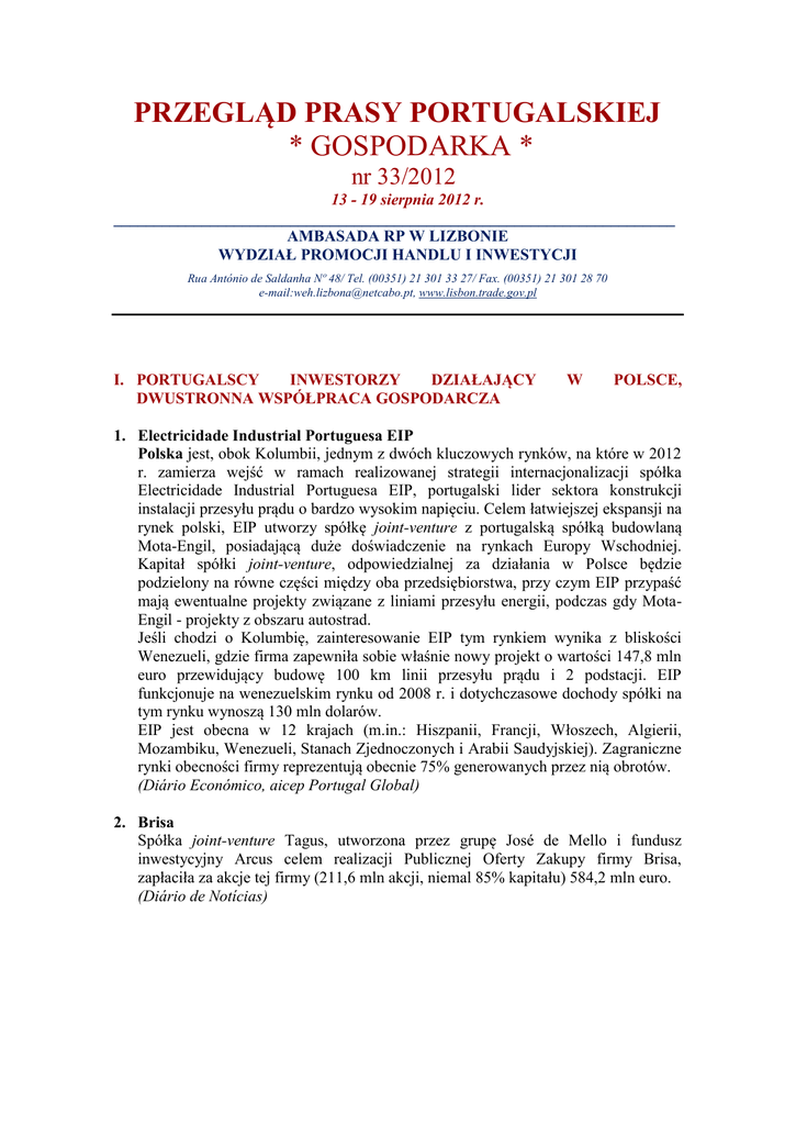 PRZEGLĄD PRASY PORTUGALSKIEJ * GOSPODARKA * nr 33/2012 13 - 19 sierpnia 2012 r. ______________________________________________________________________ AMBASADA RP W LIZBONIE WYDZIAŁ PROMOCJI HANDLU I INWESTYCJI Rua António de Saldanha Nº 48/ Tel. (00351) 21 301 33 27/ Fax. (00351) 21 301 28 70 e-mail:[email protected], www.lisbon.trade.gov.pl I. PORTUGALSCY INWESTORZY DZIAŁAJĄCY DWUSTRONNA WSPÓŁPRACA GOSPODARCZA W POLSCE, 1. Electricidade Industrial Portuguesa EIP Polska jest, obok Kolumbii, jednym z dwóch kluczowych rynków, na które w 2012 r. zamierza wejść w ramach realizowanej strategii internacjonalizacji spółka Electricidade Industrial Portuguesa EIP, portugalski lider sektora konstrukcji instalacji przesyłu prądu o bardzo wysokim napięciu. Celem łatwiejszej ekspansji na rynek polski, EIP utworzy spółkę joint-venture z portugalską spółką budowlaną Mota-Engil, posiadającą duże doświadczenie na rynkach Europy Wschodniej. Kapitał spółki joint-venture, odpowiedzialnej za działania w Polsce będzie podzielony na równe części między oba przedsiębiorstwa, przy czym EIP przypaść mają ewentualne projekty związane z liniami przesyłu energii, podczas gdy MotaEngil - projekty z obszaru autostrad. Jeśli chodzi o Kolumbię, zainteresowanie EIP tym rynkiem wynika z bliskości Wenezueli, gdzie firma zapewniła sobie właśnie nowy projekt o wartości 147,8 mln euro przewidujący budowę 100 km linii przesyłu prądu i 2 podstacji. EIP funkcjonuje na wenezuelskim rynku od 2008 r. i dotychczasowe dochody spółki na tym rynku wynoszą 130 mln dolarów. EIP jest obecna w 12 krajach (m.in.: Hiszpanii, Francji, Włoszech, Algierii, Mozambiku, Wenezueli, Stanach Zjednoczonych i Arabii Saudyjskiej). Zagraniczne rynki obecności firmy reprezentują obecnie 75% generowanych przez nią obrotów. (Diário Económico, aicep Portugal Global) 2. Brisa Spółka joint-venture Tagus, utworzona przez grupę José de Mello i fundusz inwestycyjny Arcus celem realizacji Publicznej Oferty Zakupy firmy Brisa, zapłaciła za akcje tej firmy (211,6 mln akcji, niemal 85% kapitału) 584,2 mln euro. (Diário de Notícias) PRZEGLĄD PRASY PORTUGALSKIEJ - GOSPODARKA nr 32/2012 II. INNE INWESTYCJE PORTUGALSKICH I KONTRAKTY ZAGRANICZNE FIRM 1. Portugalski eksport towarów w I półroczu 2012 r. Według danych opublikowanych przez portugalski Narodowy Instytut Statystyki (Instituto Nacional de Estatística, INE), eksport towarów w I półroczu br. wzrósł o 9,1% wobec tego samego okresu ubiegłego roku (1,903 mld euro w ujęciu wartościowym). W analizowanym okresie sprzedaż na rynki pozaunijne wzrosła o 25,8%. Wśród najważniejszych rynków docelowych portugalskiego eksportu znalazły się Angola i Chiny, które wspólnie są odpowiedzialne na 1/3 całkowitego wzrostu portugalskiego eksportu w okresie styczeń – czerwiec br. INE informuje, że w ciągu I półrocza br. eksport do Chin wzrósł niemal trzykrotnie i jego wartość wyniosła 440,6 mln euro, dzięki czemu kraj ten awansował z dotychczasowego 19. miejsca na liście odbiorców towarów portugalskich na miejsce 10. W przypadku Angoli, będącej 4. odbiorcą towarów portugalskich, zaobserwowany został również znaczący wzrost portugalskiego eksportu o 37%, do poziomu 1,312 mld euro. Łącznie, Angola i Chiny reprezentują już 7,7% całkowitej wartości portugalskiego eksportu (w porównaniu z 5,3% w I półroczu 2011 r.). Pozytywne wyniki Portugalia odnotowała również w zakresie eksportu na rynki europejskie. Pomimo kryzysu strefy euro oraz spowolnienia gospodarczego Europy, eksport na rynki unijne wzrósł o 3,7%. Na szczególną uwagę zasługują Francja, Belgia i Wlk. Brytania – sprzedaż dóbr na te rynki wzrosła łącznie o 360 mln euro. Hiszpania, będąca głównym rynkiem portugalskiego eksportu odnotowała spadek o 4,12% (222 mln euro w ujęciu wartościowym). (aicep Portugal Global) +++ 2