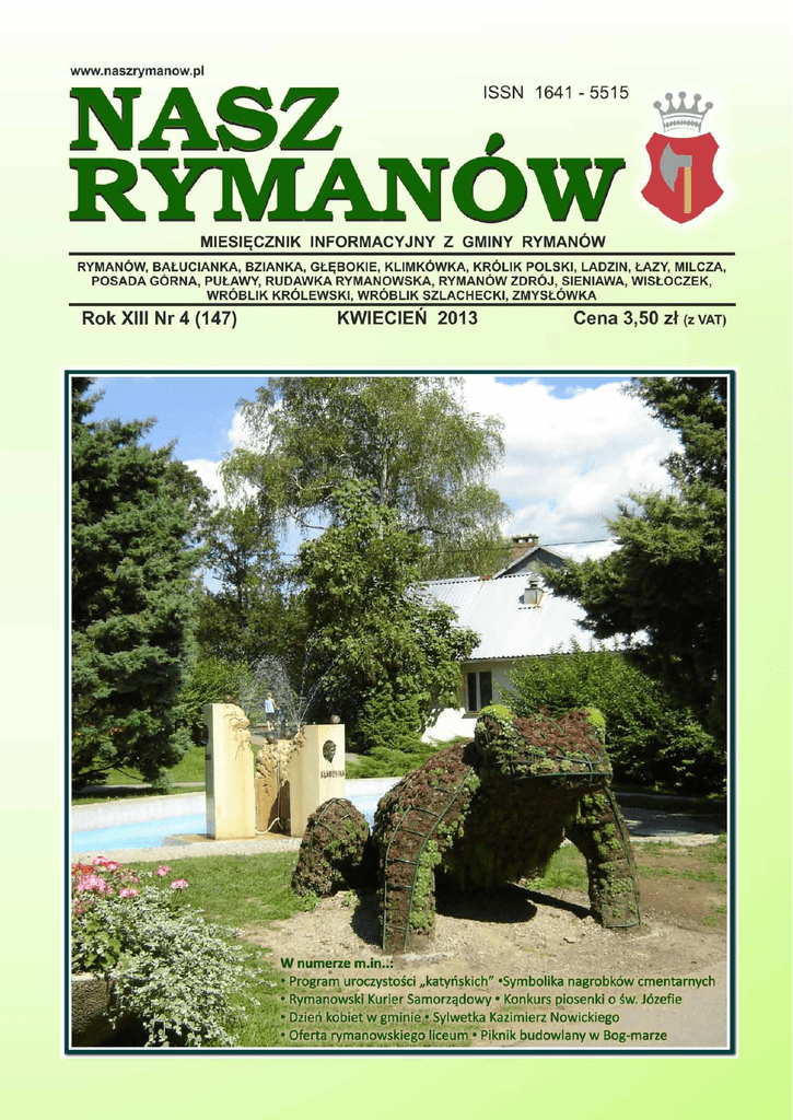 NASZ RYMANÓW 1 I miejsce dla „Nutek Św. Józefa” W dniu 14.03.2013 r. odbył się międzyprzedszkolny „Konkurs piosenki o Św. Józefie” zorganizowany po raz drugi przez Przedszkole Publiczne Św. Józefa z Rzeszowa, które prowadzi Zgromadzenie Sióstr Służebniczek NMP NP. Konkurs obejmował zasięgiem prowincję mi: siostrą dyrektor przedszkola Barbarą Słowik, s. Alicją Mika oraz p. Barbarą Panaś, p. Iwoną Wojtuń i p. Edytą Dworzańską. Zespół „Nutki Św. Józefa” za wykonanie piosenki „O Józefie Święty, Opiekunie nasz” zdobył I miejsce w kategorii zespołów i główną nagrodę - dwudniowy wyjazd do sanktuarium św Józefa w Częstochowie. Zespół wystąpił w składzie: Kornelia Magierow- Józefie”. Tekst i muzyka autorstwa sióstr karmelitanek, akompaniament na organach elektrycznych p. Iwona Wojtuń. W dniu prezentacji muzycznych zostały ogłoszone wyniki konkursu plastycznego ”Zawierzyć jak Św. Józef”, w którym przedszkole Św. Józefa w Rymanowie również zgłosiło swój udział. Wszystkie wysłane prace otrzymały wyróżnienia. Są to prace wykonane przez Jakuba Krukara, Wiktora Szczęsnego, przemyską i przeznaczony był dla dzieci uczęszczających do przedszkoli i ochronek prowadzonych przez siostry służebniczki starowiejskie. Uczestnicy mogli wykonać jeden utwór związany z osobą św. Józefa. Prezentacja utworów odbywała się według czterech kategorii: soliści w wieku 4 lat, 5 lat i 6 lat oraz zespoły do 10 osób (w wieku 4-6 lat). Dzieci z 15 przedszkoli przyjechały wraz ze swoimi opiekunami w czwartkowy ranek do Instytutu Teologiczno-Pastoralnego w Rzeszowie, gdzie wykonały 32 utwory przed powołaną przez organizatora komisją konkursową. W konkursie wzięły udział przedszkolaki z Przedszkola Św. Józefa w Rymanowie, które przyjechały z opiekuna- ska, Oliwia Kilar, Wiktoria Małopolska, Zofia Hanus, Kornelia Strąk, Sara Maścibrzuch, Julia Krakowiecka, Seweryn Doszlik, Damian Olszyński, Sebastian Litarowicz. Prezentację utworu wzbogaciły przedstawione przez małych aktorów, w sposób bardzo symboliczny sceny z życia Świętej Rodziny. W pięknych strojach wystąpili - św. Józef i Maryja z Dzieciątkiem oraz Anioł Gabriel. Tekst piosenki przygotowała s. Barbara Słowik, muzykę i akompaniament na organach elektrycznych p. Iwona Wojtuń – nauczyciel rytmiki. Wyróżnienie w kategorii soliści w wieku 6 lat zdobyła Laura Urbanik za wykonanie piosenki „Kochany Święty Jakuba Wawrzkowicza, Zosię Fiejdasz, Martynkę Wnęk, Martę Leń, Wiktorię Małopolską i Kornelię Strąk. Mali artyści zmęczeni po całym dniu zmagań, ale rozśpiewani i weseli wracali w czwartkowe, bardzo zimowe popołudnie do swoich domów. Długa powrotna 5-godzinna podróż do Rymanowa, przez zasypane śniegiem drogi była dla dzieci dużą atrakcją. Wszystkim małym artystom serdecznie gratulujemy i czekamy na kolejne sukcesy. Szczególne podziękowania i gratulacje należą się także opiekunom i nauczycielom z Przedszkola Św. Józefa. Barbara Pruś fot. s. Alicja Mika Konklawe Zaproszenie Marzec – rok 2013r Wieczór, trzynastegoTrzynasty to Dzień Maryjny i środa nowenny do tego okres postu – pokuty, ważny dla każdego A w Watykanie dzień konklawe drugiczas modlitwy, nadziei, oczekiwań długich tak inny od poprzednich, jakby znak specjalnyabdykował Benedykt XVI, w czasie Roku Wiary -bo sił zabrakło , do posługi trudnej oraz wielkiejuznał zatem, że kto inny trudy te podejmie Media krzykiem i dysputami fakt ten komentują Kto będzie teraz papieżem ?-wprost się licytują A Duch Święty niespodziankę zrobił im nie lada wskazał, by był wybrany ktoś aż z „końca Świata” Znał na pewno Duch Święty tego wyboru przyczyny że został Ojcem Świętym Bergoglio z Argentynyktórego wiara, prostota, pokora- bez większego trudu stała się bardzo jasna, od razu, dla całego ludu I pewno jak Franciszek Biedaczyna, którego wziął imię będzie dźwigał cały Kościół mocą wiary w Rzymie Cech wiele „franciszkowych” ma nasz Papież nowy niech zatem, jak kiedyś święty Franciszek, dokona odnowy. Maria Przybylska 2 NASZ RYMANÓW Burmistrz Gminy Rymanów Stowarzyszenie „Nasz Rymanów” Towarzystwo Gimnastyczne „Sokół” Zespół Szkół Publicznych w Rymanowie Gminny Ośrodek Kultury w Rymanowie zapraszają mieszkańców na uroczystości 73 rocznicy zbrodni katyńskiej 10 kwietnia 2013 (środa) Program uroczystości: - godz. 19oo – Msza św. w intencji Ofiar Katynia, - przemarsz na miejsce upamiętnienia pomordowanych, - uroczysta odprawa i zmiana warty, - apel poległych, - złożenie kwiatów Wydarzyło się w kwietniu 24.IV.1333 – na króla Polski koronowany zostaje Kazimierz, który później otrzymał przydomek Wielki. W chwili koronacji miał 23 lata i był ostatnim władcą z dynastii Piastów. Mimo że słynął z podbojów sercowych, nie doczekał się dziedzica tronu. 29.IV.1483 – zakończono podbój Gran Canarii, drugiej co do wielkości wyspy archipelagu Kanarów. Walka z lokalnymi mieszkańcami Guanczami trwały 5 lat. 29.IV.1493 – król Polski Jan Olbracht odebrał przysięgę wierności od wielkiego mistrza Zakonu Niemieckiego Jana von Tiefena. 5.IV.1573 – otwarto pierwszy most na Wiśle w Warszawie. Jego budowa trwała prawie 5 lat, od 25.VI.1568 r. 8.IV.1723 – ur. Celestyn Czaplic, wielki łowczy koronny, marszałek sejmu. Zasłynął dwoma rzeczami: zasnął na krześle prowadząc obrady sejmu oraz z tego, że skomponował przyśpiewkę „Kurdesz”, co w j. staropolskim znaczyło – pieśń biesiadna. 21.IV.1773 – w czasie obrad sejmu rozegrała się słynna scena protestu Tadeusza Rejtana przeciwko podpisaniu traktatu rozbiorowego. Scenę tą namalował J. Matejko w 1866 r., ale tak daleko odbiegającą od realiów, że potomkowie osób namalowanych po stronie zdrajców a nie uczestniczące w zdarzeniu, groziły Matejce procesem i żądały znis