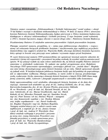 Andrzej Hildebrandt Od Redaktora Naczelnego Niniejszy numer czasopisma „Telekomunikacja i Techniki Informacyjne” został wydany z okazji 75 lat badań i rozwoju w dziedzinie telekomunikacji w Polsce. W dniu 22 marca 1934 r. utworzono bowiem Państwowy Instytut Telekomunikacyjny, będący pierwszym w Polsce instytutem badawczym, działającym w obszarze telekomunikacji i techniki pocztowej. Z tego Instytutu został wyłoniony w 1951 r. Instytut Łączności, mający obecnie w nazwie drugi człon – Państwowy Instytut Badawczy. Przedstawiamy Państwu 12 artykułów autorstwa pracowników i byłych pracowników Instytutu. Planując zawartość numeru, przyjęliśmy, że – mimo jego jubileuszowego charakteru – rozpoczniemy od wskazania bieżących problemów Instytutu i naszkicowania jego najbliższej przyszłości. Zamieściliśmy więc najpierw artykuł inż. Wojciecha Hałki, obecnego dyrektora Instytutu Łączności, który opisuje te kwestie oraz precyzuje nowe zadania i wyzwania stojące przed Instytutem. W części historycznej numeru TITI postanowiliśmy nie ograniczać inwencji autorów odnośnie do zawartości i formy ich wypowiedzi – pozostawić im pełną swobodę, by uzyskać większą autentyczność opisów. W tej sytuacji wydało się nam celowe nakreślenie tła, na którym mogliby Państwo umieścić omawiane w artykułach wydarzenia. To zadanie ma spełnić przygotowane przez Redaktora Naczelnego TITI opracowanie wprowadzające, zawierające głównie tzw. „twarde dane”. Mogłoby ono mieć formę chronologicznego opisu historii Instytutu rok po roku. Takich opracowań ukazało się jednak wiele. W każdym kolejnym jubileuszu Instytutu każdy opis był podobny do poprzedniego, tyle że odpowiednio wydłużony. Dlatego uznaliśmy, że warto zrobić to inaczej, przedstawiając osoby, wydarzenia i liczby, stanowiące elementy historii Instytutu w latach 1934–2009. Dane mają formę zestawień, tablic, wykresów i fotografii zaopatrzonych w niewielkie tylko komentarze. Dalej zaprezentowaliśmy sześć artykułów, obrazujących historię Instytutu aż do dnia dzisiejszego. Autorami tych artykułów są: prof. dr inż. Andrzej Zieliński, doc. dr inż. Alina Karwowska-Lamparska, doc. dr inż. Krystyn Plewko, pracownicy Oddziału IŁ we Wrocławiu – prof. dr hab. inż. Ryszard Strużak, dr inż. Janusz Sobolewski, dr inż. Maciej Grzybkowski, mgr inż. Marek Kałuski, dr inż. Mirosław Pietranik, mgr inż. Stanisław Siczek, mgr inż. Piotr Tyrawa i dr inż. Dariusz Więcek – następnie inż. Jan Komorowski wspólnie z inż. Pawłem Klisiem oraz trójka współautorów – inż. Paweł Godlewski, inż. Bogdan Chojnacki i mgr inż. Barbara Regulska. Następny artykuł dotyczy już w całości czasów nam najbliższych, a napisali go: dr inż. Janusz Granat i prof. dr hab. inż. Andrzej P. Wierzbicki. Dwa dalsze artykuły wybiegają w przyszłość i prezentują nową sieć, zwaną Internetem Przyszłości oraz fotonikę przyszłości, a zostały opracowane przez prof. dr hab. inż. Wojciecha Burakowskiego i prof. dr hab. inż. Pawła Szczepańskiego. Ostatni artykuł w tym numerze TITI ma charakter promocyjny i zawiera rynkową ofertę Instytutu, a przygotował go mgr inż. Edward Juszkiewicz. Autorzy części historycznej, mimo że odegrali istotną rolę w historii Instytutu, opisali przede wszystkim własne przeżycia oraz swoje spojrzenie na to, w czym brali udział i co było w ich życiu zawodowym znaczące. Dlatego może się zdarzyć, że zabrakło w ich opracowaniach wydarzeń lub osób, które zasługiwałyby na przypomnienie. Będziemy więc wdzięczni za nadesłanie uzupełniających informacji. Część artykułów zawiera elementy wizji rozwoju Instytutu – i tu również oczekujemy opinii Państwa. Natomiast opracowania eksperckie, zamieszczone w części końcowej, stanowią dobre uzupełnienie materiałów je poprzedzających. Zainteresowanych szczegółami bieżących spraw Instytutu zapraszamy do naszej witryny internetowej (www.itl.waw.pl) lub do Działu Sprzedaży i Marketingu Instytutu (tel. +48 22 5128 291). Szanowni Państwo, Dziesięć lat temu, z inicjatywy prof. dr hab. inż. Andrzeja P. Wierzbickiego, ówczesnego dyrektora Instytutu, powstało nasze czasopismo „Telekomunikacja i Techniki Informacyjne”. Pragnę wyrazić podziękowanie za 10 lat współpracy całemu zespołowi redakcji, a zwłaszcza inż. Marii Łopuszniak – sekretarzowi redakcji, mgr Krystynie Juszkiewicz – redaktorowi technicznemu, mgr inż. Henrykowi Gutowi-Mostowemu, dr inż. Kornelowi Wydro i dr inż. Elżbiecie Andrukiewicz – redaktorom działowym oraz mgr inż. Ewie Kapuściarek – kierownikowi Ośrodka Informacji Naukowej. 2 Wojciech Hałka Instytut Łączności – 75 lat tradycji i obecne wyzwania Instytut Łączności – 75 lat tradycji i obecne wyzwania Wojciech Hałka Obecny dyrektor Instytutu Łączności, nawiązując do 75-letniego dorobku Instytutu, określa dzisiejsze zadania i wyzwania na najbliższe lata, zgodnie z kierunkami badawczymi Unii Europejskiej. telekomunikacja, Instytut Łączności – dorobek, nowe zadania i wyzwania W bieżącym roku Instytut Łączności – Państwowy Instytut Badawczy (IŁ-PIB) obchodzi 75 rocznicę założenia Państwowego Instytutu Telekomunikacyjnego (PIT) w Warszawie, swojego poprzednika, z którego w 1951 r. wydzielono dwie odrębne, działające do dziś jednostki: Przemysłowy Instytut Telekomunikacji i Instytut Łączności. Państwowy Instytut Telekomunikacyjny rozpoczął działalność badawczo-wdrożeniową 1 kwietnia 1934 r. z inicjatywy prof. Janusza Groszkowskiego, jego pierwszego dyrektora, a późniejszego długoletniego przewodniczącego Rady Naukowej Instytutu Łączności. Obchody tej rocznicy są dobrą okazją do refleksji na temat historycznego dorobku i przyszłości Instytutu Łączności. Pracownicy Instytutu Łączności wśród uczestników Konferencji VIII Komisji Studió