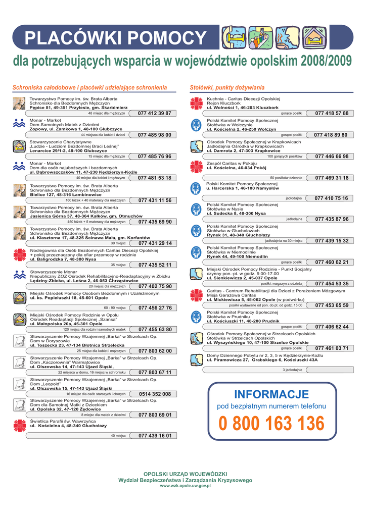 PLACÓWKI POMOCY dla potrzebuj¹cych wsparcia w województwie opolskim 2008/2009 Schroniska ca³odobowe i placówki udzielaj¹ce schronienia Sto³ówki, punkty do¿ywiania Towarzystwo Pomocy im. œw. Brata Alberta Schronisko dla Bezdomnych Mê¿czyzn Pêpice 81, 49-351 Przylesie, gm. Skarbimierz 48 miejsc dla mê¿czyzn Kuchnia - Caritas Diecezji Opolskiej Rejon Kluczbork ul. Wolnoœci 1, 46-203 Kluczbork 077 412 39 87 Monar - Markot Dom Samotnych Matek z Dzieæmi Zopowy, ul. Zamkowa 1, 48-100 G³ubczyce 44 miejsca dla kobiet i dzieci gor¹ce posi³ki K S 15 miejsc dla mê¿czyzn gor¹ce posi³ki 077 485 76 96 077 481 53 18 K S 077 431 11 56 K S Towarzystwo Pomocy im. œw. Brata Alberta Schronisko dla Bezdomnych Mê¿czyzn Jasienica Górna 37, 48-364 Ka³ków, gm. Otmuchów 450 ³ó¿ek + 5 materacy dla mê¿czyzn 077 435 69 90 K S Towarzystwo Pomocy im. œw. Brata Alberta Schronisko dla Bezdomnych Mê¿czyzn ul. Klasztorna 17, 48-325 Œcinawa Ma³a, gm. Korfantów 39 miejsc 39 miejsc dla mê¿czyzn 077 431 29 14 K S Noclegownia dla Osób Bezdomnych Caritas Diecezji Opolskiej + pokój przeznaczony dla ofiar przemocy w rodzinie ul. Baligrodzka 7, 48-300 Nysa 35 miejsc 077 803 62 00 Stowarzyszenie Pomocy Wzajemnej „Barka” w Strzelcach Op. Dom „Kaczorownia” Warm¹towice ul. Olszowska 14, 47-143 Ujazd Œl¹ski, 22 miejsca w domu, 16 miejsc w schronisku jad³odajnia na 30 miejsc 077 439 15 32 077 460 62 21 077 454 53 35 077 453 65 59 Polski Komitet Pomocy Spo³ecznej Sto³ówka w Prudniku ul. Koœciuszki 11, 48-200 Prudnik gor¹ce posi³ki 077 406 62 44 Oœrodek Pomocy Spo³ecznej w Strzelcach Opolskich Sto³ówka w Strzelcach Opolskich ul. Wyszyñskiego 10, 47-100 Strzelce Opolskie gor¹ce posi³ki 077 461 03 71 Domy Dziennego Pobytu nr 2, 3, 5 w Kêdzierzynie-KoŸlu ul. Piramowicza 27, Grabskiego 6, Koœciuszki 43A 3 jad³odajnie 077 803 67 11 0514 352 008 INFORMACJE pod bezp³atnym numerem telefonu 077 803 69 01 Œwietlica Parafii œw. Wawrzyñca ul. Koœcielna 4, 48-340 G³ucho³azy 40 miejsc 077 435 87 96 Polski Komitet Pomocy Spo³ecznej Sto³ówka w Niemodlinie Rynek 44, 49-100 Niemodlin Stowarzyszenie Pomocy Wzajemnej „Barka” w Strzelcach Op. Dom dla Samotnej Matki z Dzieckiem ul. Opolska 32, 47-120 ¯êdowice 8 miejsc dla matek z dzieæmi jad³odajna Polski Komitet Pomocy Spo³ecznej Sto³ówka w G³ucho³azach Rynek 31, 48-340 G³ucho³azy Stowarzyszenie Pomocy Wzajemnej „Barka” w Strzelcach Op. Dom „Leopold” ul. Olszowska 15, 47-143 Ujazd Œl¹ski 16 miejsc dla osób starszych i chorych 077 410 75 16 Polski Komitet Pomocy Spo³ecznej Sto³ówka w Nysie ul. Sudecka 8, 48-300 Nysa posi³ki wydawane od pon. do pt. od godz. 15.00 K S 077 455 63 80 jad³odajna Caritas - Centrum Rehabilitacji dla Dzieci z Pora¿eniem Mózgowym Misja Gara¿owa Caritas ul. Mickiewicza 5, 45-062 Opole (w podwórku) 077 456 27 76 Stowarzyszenie Pomocy Wzajemnej „Barka” w Strzelcach Op. Dom w Doryszowie ul. Toszecka 23, 47-134 B³otnica Strzelecka 25 miejsc dla kobiet i mê¿czyzn 077 469 31 18 posi³ki, magazyn z odzie¿¹ 077 402 75 90 Miejski Oœrodek Pomocy Rodzinie w Opolu Oœrodek Readaptacji Spo³ecznej „Szansa” ul. Ma³opolska 20a, 45-301 Opole 120 miejsc dla rodzin i samotnych matek 50 posi³ków dziennie Polski Komitet Pomocy Spo³ecznej u. Harcerska 1, 46-100 Namys³ów Miejski Oœrodek Pomocy Rodzinie - Punkt Socjalny czynny pon.-pt. w godz. 9.00-17.00 ul. Sienkiewicza 2, 45-037 Opole Miejski Oœrodek Pomocy Osobom Bezdomnym i Uzale¿nionym ul. ks. Popie³uszki 18, 45-601 Opole 60 - 90 miejsc 077 446 66 98 gor¹ce posi³ki 077 435 52 11 Stowarzyszenie Monar Niepubliczny ZOZ Oœrodek Rehabilitacyjno-Readaptacyjny w Zbicku Lêdziny-Zbicko, ul. Leœna 2, 46-053 Chrz¹stowice 20 miejsc dla mê¿czyzn 100 gor¹cych posi³ków Zespó³ Caritas w Pokoju ul. Koœcielna, 46-034 Pokój Towarzystwo Pomocy im. œw. Brata Alberta Schronisko dla Bezdomnych Mê¿czyzn Bielice 127, 48-316 £ambinowice 160 ³ó¿ek + 40 materacy dla mê¿czyzn 077 418 89 80 Oœrodek Pomocy Spo³ecznej w Krapkowicach Jad³odajnia Oœrodka w Krapkowicach ul. Damrota 2, 47-303 Krapkowice Monar - Markot Dom dla osób najubo¿szych i bezdomnych ul. D¹browszczaków 11, 47-230 Kêdzierzyn-KoŸle 40 miejsc dla kobiet i mê¿czyzn Polski Komitet Pomocy Spo³ecznej Sto³ówka w Wo³czynie ul. Koœcielna 2, 46-250 Wo³czyn 077 485 98 00 Stowarzyszenie Charytatywne „Ludzie - Ludziom Bezdomnej Braci Leœnej” Lenarcice 29/1-2, 48-100 G³ubczyce 077 418 57 88 077 439 16 01 0 800 163 136 OPOLSKI URZ¥D WOJEWÓDZKI Wydzia³ Bezpieczeñstwa i Zarz¹dzania Kryzysowego www.wzk.opole.uw.gov.pl K S OPS