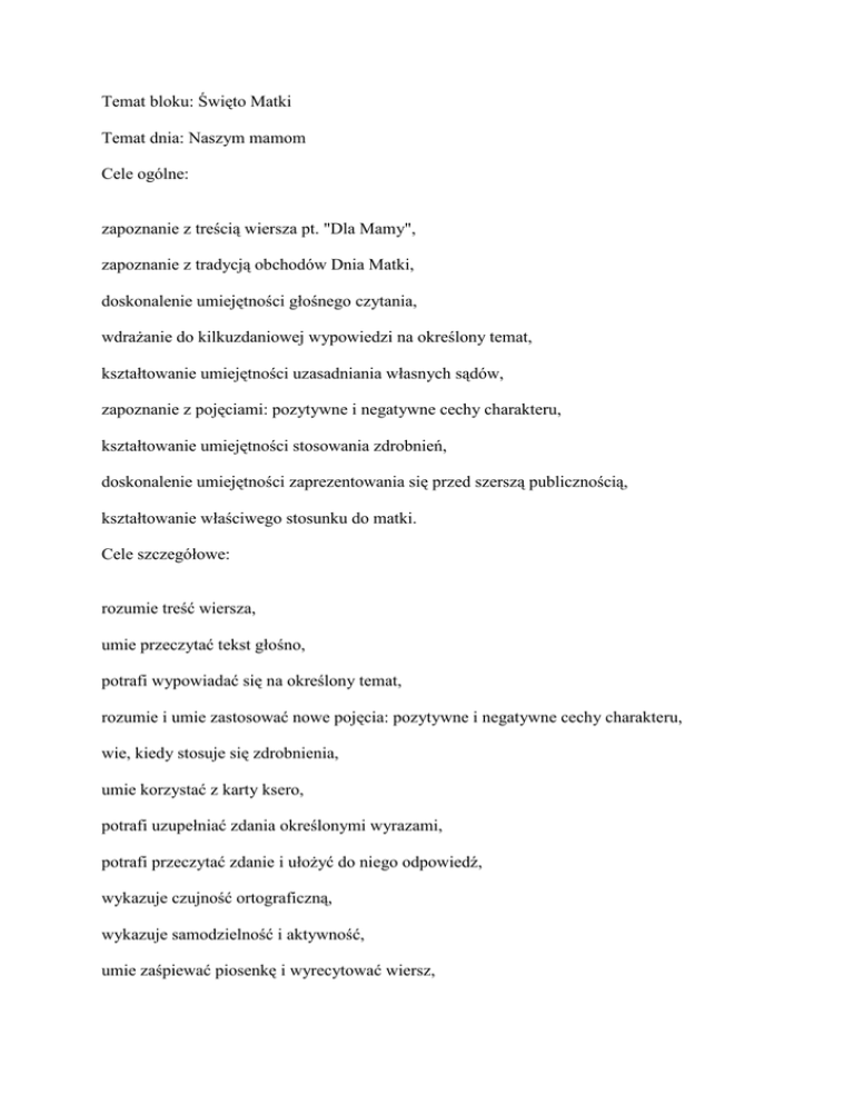 Temat bloku: Święto Matki Temat dnia: Naszym mamom Cele ogólne: zapoznanie z treścią wiersza pt. "Dla Mamy", zapoznanie z tradycją obchodów Dnia Matki, doskonalenie umiejętności głośnego czytania, wdraŜanie do kilkuzdaniowej wypowiedzi na określony temat, kształtowanie umiejętności uzasadniania własnych sądów, zapoznanie z pojęciami: pozytywne i negatywne cechy charakteru, kształtowanie umiejętności stosowania zdrobnień, doskonalenie umiejętności zaprezentowania się przed szerszą publicznością, kształtowanie właściwego stosunku do matki. Cele szczegółowe: rozumie treść wiersza, umie przeczytać tekst głośno, potrafi wypowiadać się na określony temat, rozumie i umie zastosować nowe pojęcia: pozytywne i negatywne cechy charakteru, wie, kiedy stosuje się zdrobnienia, umie korzystać z karty ksero, potrafi uzupełniać zdania określonymi wyrazami, potrafi przeczytać zdanie i ułoŜyć do niego odpowiedź, wykazuje czujność ortograficzną, wykazuje samodzielność i aktywność, umie zaśpiewać piosenkę i wyrecytować wiersz, rozumie znaczenie matki w swoim Ŝyciu, potrafi właściwie się zachować w obecności mam. Metody: słowne - rozmowa kierowana, praca z tekstem, pogadanka, praktycznego działania - ćwiczenia, zabawa, ekspresja ruchowa, problemowa. Formy: zbiorowa jednolita, indywidualna jednolita, występ artystyczny. Środki dydaktyczne: podręcznik "Wesoła szkoła", nagranie z utworami muzycznymi, piosenki: "Mama w kuchni", "Wiwat, wiwat nasze mamy", magnetofon, karty pracy, scenariusz części artystycznej, plansze z nazwami cech charakteru, listonosz - ubiór, rekwizyty, listy z Ŝyczeniami, serwetki, naczynia, słodycze, kwiaty. 1. Wysłuchanie piosenki pt. "Piosenka dla mamy" w celu wytworzenia odpowiedniego nastroju. 2. Rozmowa na temat treści piosenki i zbliŜającego się Dnia Matki. O kim jest ta piosenka? Co dzieci chcą dać mamie? Kiedy mamy obchodzą swoje święto? Wiosną 26 maja, kiedy wszystko budzi się do Ŝycia, mama ma swoje święto. Mama jak wiosna, daje nam nowe Ŝycie. Ale nie tylko wiosną i nie tylko tego dnia kochajcie swoje mamy. Święto to zaczęto obchodzić w Stanach Zjednoczonych w 1910 roku. W Europie dzień poświęcony matce pierwsza wprowadziła Austria. W Polsce po raz pierwszy obchodzono Dzień Matki w 1923 roku w Krakowie. Dzień ten ustalono po to, aby przynajmniej raz w roku ludzie uprzytomnili sobie, a matki odczuły, jak waŜna jest ich rola w społeczeństwie. 3. Głośne czytanie wiersza pt. "Dla Mamy" przez nauczyciela. 4. Udzielenie odpowiedzi na pytania zamieszczone pod tekstem wiersza: Co dziewczynka chciała dać swojej mamie, a co dała? Jak wyraziła swoją miłość do mamy? Jak ty wyrazisz swoją miłość do mamy? 5. Rozmowa na temat sposobów wyraŜania uczuć miłości, szacunku i przywiązania do mamy. Za co kochamy swoje mamy? (za to, Ŝe jesteśmy na świecie; Ŝe zawsze jest z nami; Ŝe nas kocha; opiekuje się nami, kiedy jesteśmy chorzy, itp.) 6. Ćwiczenia w czytaniu wiersza: zbiorowe i indywidualne. 7. Pisanie na promyczkach słoneczka wyrazów oznaczających nazwy cech charakteru swojej mamy. (Karty nr 43 ćw. 1) 8. Zapis tematu do zeszytu: Dzień Matki w naszej klasie. 9. Uzupełnianie w zeszycie zdania: Moja mama jest:______________, _________________, _____________, ________________, ________________, ___________________. Wyrazy do uzupełnienia: cierpliwa, kochana, miła, nieczuła, wyrozumiała, krzykliwa, serdeczna, troskliwa, nerwowa, mądra, oddana, ładna, sympatyczna, z poczuciem humoru. (Dzieci grupują wyrazy i poznają pojęcie: cechy charakteru pozytywne i negatywne.) 10. Przerwa - Symulacja czynności wykonywanych przez mamę w domu. (Dzieci zgłaszają propozycję i pokazują innym.) 11. Tworzenie wyrazów o pozytywnym zabarwieniu uczuciowym. (Karty nr 43 ćw. 2) Jako wprowadzenie do tego ćwiczenia nauczyciel czyta dzieciom wiersz pt. "Mamusia". "Mamusia" Mama, mamusia, mateczka Słowa jak ciepłe ciasteczka. Matuś, matka, mateńka Jakaś ty przy niej maleńka. Mamcia, mamunia, matula Mocno się zawsze przytula. Maleńka, posłuszna, grzeczna Mamy kochana córeczka. 12. Wybieranie i podkreślanie wyrazów oznaczających czynności wykonywane przez mamę. (Karty nr 43 ćw. 3) 13. Programowanie robota, który odciąŜy mamę od zbyt wielu prac domowych. (Inscenizacja ruchowa) 14. Wizyta listonosza - rozdanie listów mamom. (Czytanie listów napisanych przez dzieci na wcześniejszej lekcji.) 15. Uzupełnianie kart ksero - zabawa pt. "Czy znasz swoją mamę?" Jaki mama ma kolor oczu? Jaki mama ma kolor włosów? Jaką ksiąŜkę lubi mama najbardziej? W jaki sposób odpoczywa najczęściej? Ile ma lat? Jaki jest ulubiony kolor mamy? Jaki zawód wybrałaby mama dla Ciebie? Jaką porę roku mama lubi najbardziej? 16. Zabawa z udziałem mam! (Mamy odpowiadają na te same pytania i porównujemy odpowiedzi.) 17. Zadanie domowe: - Czytanie wiersza pt. "Dla mamy" s. 34 - Karty pracy nr 44 ćw. 1, 2, 3 CZĘŚĆ ARTYSTYCZNA W dniu tym wszystkie mamy obdarzone są szczególnymi dowodami miłości. Przedszkolak przynosi swoją laurkę, uczeń własnoręcznie wykonany upominek. My takŜe swoim mamom składamy najserdeczniejsze Ŝyczenia płynące z małych, ale gorących serc. Niech dowodem będzie program, jaki dla Was kochane mamy przygotowaliśmy. Wszyscy: Najlepiej jest u Mamy! To kaŜde dziecko wie. Najlepiej jest u Mamy, Gdy smutno ci i źle! Osoba I: (recytuje wiersz Ryszarda Przymusa) Kocham Cię, Mamo, bo Twoje serce bije jak refren w mojej piosence. Kocham Cię, Mamo, za Twoje bajki o kocie, który nie palił fajki.... Kocham Cię, Mamo, bo serce Twoje bije tak samo jak serce moje. Osoba II: (recytuje wiersz Ryszarda Przymusa) Moja Mama juŜ od rana wciąŜ jest we mnie zakochana.... A ja takŜe - w sercu Mamy jestem co dzień zakochany! Mama gładzi mnie po głowie, i zapomina o sobie... Bo myśli o mnie bez końca. Moja Mama pełna słońca! Wszyscy