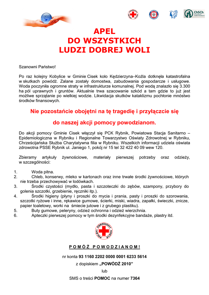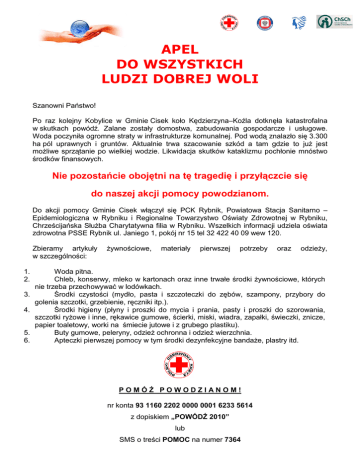 APEL DO WSZYSTKICH LUDZI DOBREJ WOLI Szanowni Państwo! Po raz kolejny Kobylice w Gminie Cisek koło Kędzierzyna–Koźla dotknęła katastrofalna w skutkach powódź. Zalane zostały domostwa, zabudowania gospodarcze i usługowe. Woda poczyniła ogromne straty w infrastrukturze komunalnej. Pod wodą znalazło się 3.300 ha pól uprawnych i gruntów. Aktualnie trwa szacowanie szkód a tam gdzie to juŜ jest moŜliwe sprzątanie po wielkiej wodzie. Likwidacja skutków kataklizmu pochłonie mnóstwo środków finansowych. Nie pozostańcie obojętni na tę tragedię i przyłączcie się do naszej akcji pomocy powodzianom. Do akcji pomocy Gminie Cisek włączył się PCK Rybnik, Powiatowa Stacja Sanitarno – Epidemiologiczna w Rybniku i Regionalne Towarzystwo Oświaty Zdrowotnej w Rybniku, Chrześcijańska SłuŜba Charytatywna filia w Rybniku. Wszelkich informacji udziela oświata zdrowotna PSSE Rybnik ul. Janiego 1, pokój nr 15 tel 32 422 40 09 wew 120. Zbieramy artykuły w szczególności: 1. 2. 3. 4. 5. 6. Ŝywnościowe, materiały pierwszej potrzeby oraz odzieŜy, Woda pitna. Chleb, konserwy, mleko w kartonach oraz inne trwałe środki Ŝywnościowe, których nie trzeba przechowywać w lodówkach. Środki czystości (mydło, pasta i szczoteczki do zębów, szampony, przybory do golenia szczotki, grzebienie, ręczniki itp.). Środki higieny (płyny i proszki do mycia i prania, pasty i proszki do szorowania, szczotki ryŜowe i inne, rękawice gumowe, ścierki, miski, wiadra, zapałki, świeczki, znicze, papier toaletowy, worki na śmiecie jutowe i z grubego plastiku). Buty gumowe, peleryny, odzieŜ ochronna i odzieŜ wierzchnia. Apteczki pierwszej pomocy w tym środki dezynfekcyjne bandaŜe, plastry itd. POMÓś POWODZIANOM! nr konta 93 1160 2202 0000 0001 6233 5614 z dopiskiem „POWÓDŹ 2010” lub SMS o treści POMOC na numer 7364