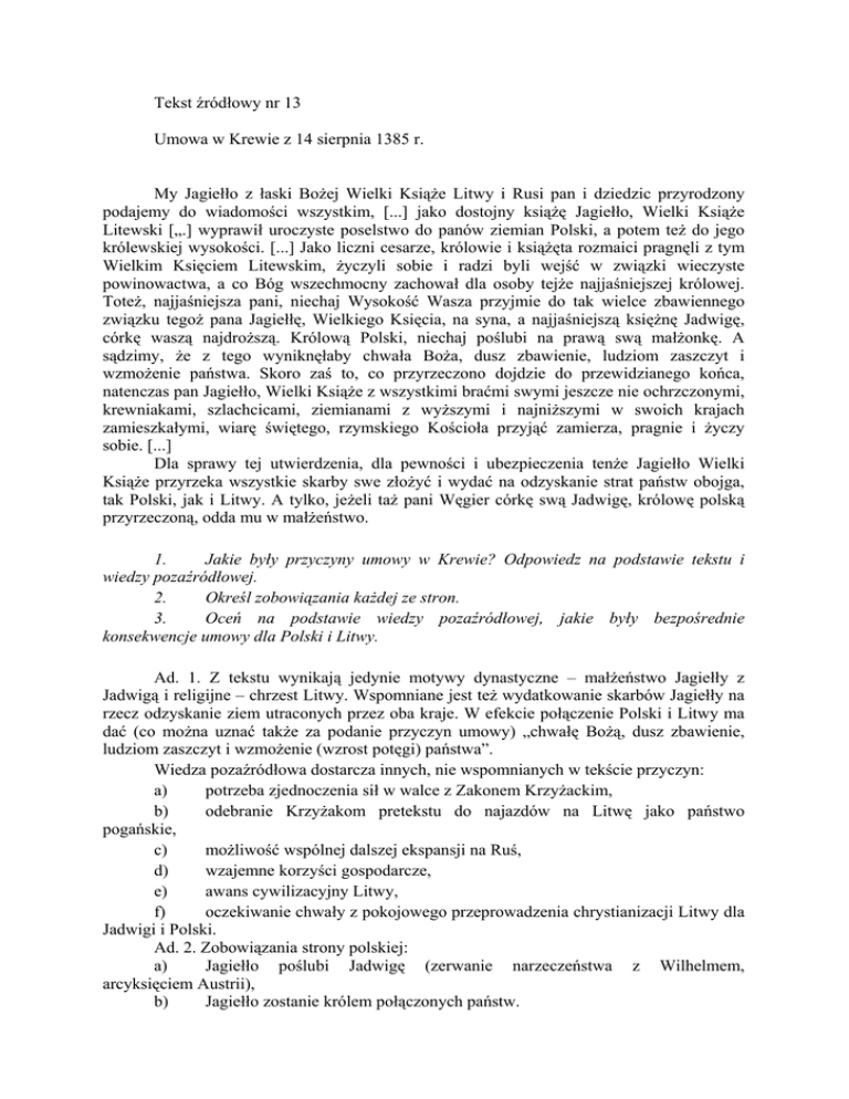 Tekst źródłowy nr 13 Umowa w Krewie z 14 sierpnia 1385 r. My Jagiełło z łaski Bożej Wielki Książe Litwy i Rusi pan i dziedzic przyrodzony podajemy do wiadomości wszystkim, [...] jako dostojny książę Jagiełło, Wielki Książe Litewski [„.] wyprawił uroczyste poselstwo do panów ziemian Polski, a potem też do jego królewskiej wysokości. [...] Jako liczni cesarze, królowie i książęta rozmaici pragnęli z tym Wielkim Księciem Litewskim, życzyli sobie i radzi byli wejść w związki wieczyste powinowactwa, a co Bóg wszechmocny zachował dla osoby tejże najjaśniejszej królowej. Toteż, najjaśniejsza pani, niechaj Wysokość Wasza przyjmie do tak wielce zbawiennego związku tegoż pana Jagiełłę, Wielkiego Księcia, na syna, a najjaśniejszą księżnę Jadwigę, córkę waszą najdroższą. Królową Polski, niechaj poślubi na prawą swą małżonkę. A sądzimy, że z tego wyniknęłaby chwała Boża, dusz zbawienie, ludziom zaszczyt i wzmożenie państwa. Skoro zaś to, co przyrzeczono dojdzie do przewidzianego końca, natenczas pan Jagiełło, Wielki Książe z wszystkimi braćmi swymi jeszcze nie ochrzczonymi, krewniakami, szlachcicami, ziemianami z wyższymi i najniższymi w swoich krajach zamieszkałymi, wiarę świętego, rzymskiego Kościoła przyjąć zamierza, pragnie i życzy sobie. [...] Dla sprawy tej utwierdzenia, dla pewności i ubezpieczenia tenże Jagiełło Wielki Książe przyrzeka wszystkie skarby swe złożyć i wydać na odzyskanie strat państw obojga, tak Polski, jak i Litwy. A tylko, jeżeli taż pani Węgier córkę swą Jadwigę, królowę polską przyrzeczoną, odda mu w małżeństwo. 1. Jakie były przyczyny umowy w Krewie? Odpowiedz na podstawie tekstu i wiedzy pozaźródłowej. 2. Określ zobowiązania każdej ze stron. 3. Oceń na podstawie wiedzy pozaźródłowej, jakie były bezpośrednie konsekwencje umowy dla Polski i Litwy. Ad. 1. Z tekstu wynikają jedynie motywy dynastyczne – małżeństwo Jagiełły z Jadwigą i religijne – chrzest Litwy. Wspomniane jest też wydatkowanie skarbów Jagiełły na rzecz odzyskanie ziem utraconych przez oba kraje. W efekcie połączenie Polski i Litwy ma dać (co można uznać także za podanie przyczyn umowy) „chwałę Bożą, dusz zbawienie, ludziom zaszczyt i wzmożenie (wzrost potęgi) państwa”. Wiedza pozaźródłowa dostarcza innych, nie wspomnianych w tekście przyczyn: a) potrzeba zjednoczenia sił w walce z Zakonem Krzyżackim, b) odebranie Krzyżakom pretekstu do najazdów na Litwę jako państwo pogańskie, c) możliwość wspólnej dalszej ekspansji na Ruś, d) wzajemne korzyści gospodarcze, e) awans cywilizacyjny Litwy, f) oczekiwanie chwały z pokojowego przeprowadzenia chrystianizacji Litwy dla Jadwigi i Polski. Ad. 2. Zobowiązania strony polskiej: a) Jagiełło poślubi Jadwigę (zerwanie narzeczeństwa z Wilhelmem, arcyksięciem Austrii), b) Jagiełło zostanie królem połączonych państw. Zobowiązania Jagiełly: a) przyjęcie chrztu i chrystianizacja Litwy, b) przyłączenie czy też połączenie („applicare”) Litwy z Polską, c) przeznaczenie swych środków materialnych („wszystkich skarbów”) na odzyskanie ziem utraconych („strat państw obojga”), d) spłacenie długu królowej Węgier (matki Jadwigi – Elżbiety), czyli odszkodowania za zerwane zaręczyny z Maksymilianem, e) przywrócenie wolności Polakom będącym w litewskiej niewoli. Ad. 3. Bezpośrednie konsekwencje to; chrzest Jagiełły (imię Władysław) i jego dworu, ślub Jadwigi z Władysławem Jagiełłą, koronacja Władysława Jagiełły na króla Polski a Jadwigi na królową, chrzest Litwy (1386 lub 1387) jako początek procesu chrystianizacji, początek kontrowersji wokół znaczenia określenia „applicare”.