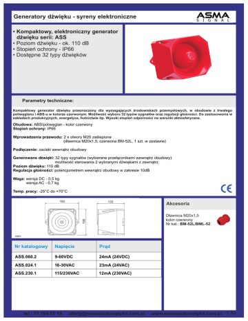 Generatory dŸwiêku - syreny elektroniczne • Kompaktowy, elektroniczny generator dŸwiêku serii: ASS • Poziom dŸwiêku - ok. 110 dB • Stopieñ ochrony - IP66 • Dostêpne 32 typy dŸwiêków Parametry techniczne: Kompaktowy generator dŸwiêku przeznaczony dla wymagaj¹cych œrodowiskach przemys³owych, w obudowie z trwa³ego poliwêglanu i ABS-u w kolorze czerwonym. Mo¿liwoœæ wyboru 32 typów sygna³ów oraz regulacji g³oœnoœci. Do zastosowania w zak³adach produkcyjnych, energetyce, hutnictwie itp. Wysoki stopieñ odpornoœci na warunki atmosferyczne. Obudowa: ABS/poliwêglan - kolor czerwony Stopieñ ochrony: IP66 Wprowadzenia przewodu: 2 x otwory M20 zaœlepione (d³awnica M20x1,5; czerwona BM-52L, 1 szt. w zestawie) Pod³¹czenie: zaciski wewn¹trz obudowy Generowane dŸwiêki: 32 typy sygna³ów (wybierane prze³¹cznikami wewn¹trz obudowy) mo¿liwoœæ sterowania 2 wybranymi dŸwiêkami z zewn¹trz Poziom dŸwiêku: 110 dB Regulacja g³oœnoœci: potencjometrem wewn¹trz obudowy w zakresie 10dB Waga: wersja DC - 0,5 kg wersja AC - 0,7 kg Temp. pracy: -25°C do +70°C 165 132 Akcesoria 136 D³awnica M20x1,5 kolor czerwony Nr kat.: BM-52L/BML-52 mm Nr katalogowy Napiêcie Pr¹d ASS.060.2 9-60VDC 24mA (24VDC) ASS.024.1 18-30VAC 23mA (24VAC) ASS.230.1 115/230VAC 12mA (230VAC) tel.: 71 794 57 19 [email protected] www.serwoautomatyka.com.pl 1.33