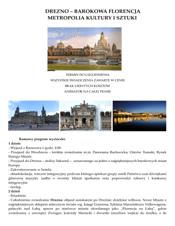 DREZNO – BAROKOWA FLORENCJA METROPOLIA KULTURY I SZTUKI TERMIN DO UZGODNIENIA WSZYSTKIE ŚWIADCZENIA ZAWARTE W CENIE BRAK UKRYTYCH KOSZTÓW ANIMATOR NA CAŁEJ TRASIE Ramowy program wycieczki: 1 dzień: - Wyjazd z Rzeszowa o godz. 4:00. - Przejazd do Wrocławia – krótkie zwiedzanie m.in. Panorama Racławicka, Ostrów Tumski, Rynek Starego Miasta - Przyjazd do Drezna – stolicy Saksonii – uznawanego za jedno z najpiękniejszych barokowych miast Europy. - Zakwaterowanie w hotelu - obiadokolacja, wieczór integracyjny podczas którego opiekun grupy umili Państwu czas dźwiękami gitarowej muzyki, zadba o swoisty klimat spotkania oraz poprowadzi zabawy i konkursy integracyjne - nocleg. 2 dzień - Śniadanie. - Całodzienne zwiedzanie Drezna: objazd autokarem po Dreźnie: dzielnice willowe, Nowe Miasto z najpiękniejszym sklepem mlecznym świata wg. księgi Guinessa, Szklana Manufaktura Volkswagena, pałacyki nad Łabą, spacer po starówce miasta określanego jako „Florencja na Łabą”, gdzie zwiedzamy z zewnątrz Zwinger, kościoły Mariacki i dworski (możliwe wejście do środka, o ile kościoły będą udostępnione do zwiedzania), rezydencja saksońskich władców, orszak władców – największy porcelanowy obraz świata. - Przerwa na kawę, czy coś drobnego do zjedzenia - zwiedzanie galerii malarstwa w Zwingerze z przewodnikiem, indywidualne zwiedzanie zbrojowni i zbiorów porcelany - rejs statkiem po Łabie: Drezno-Pillnitz-Drezno z muzyką jazzową - obiadokolacja w regionalnej restauracji - powrót do hotelu, nocleg 3 dzień - śniadanie - Przejazd do Miśni, zwiedzanie Manufaktury Porcelany, najstarszej w Europie - bardzo ciekawe warsztaty prezentujące wyrób porcelany, wystawa pokazująca porcelanę od samego początku po dzień dzisiejszy (możliwe zakupy) - Zwiedzanie starówki Miśni, małej i romantycznej, z pięknymi widokami, katedrą gotycką i zamkiem Albrechta, indywidualne wejście do zamku i katedry. - Przejazd do Radebeul - do manufaktury wina i szampana. Pałac Wackerbarth i przepiękne winnice – degustacja trzech saksońskich win - zamek łowiecki Mortizburg - powrót do hotelu, obiadokolacja, nocleg 4 dzień - Śniadanie, wykwaterowanie - Wyjazd w kierunku Polski, przyjazd do Rzeszowa w godzinach nocnych. Zakończenie wycieczki CENA: 1390,00 zł (przy grupie min. 45 os płacących) Świadczenia zawarte w cenie: - Transport komfortowym autokarem - zakwaterowanie: 3 noclegi w hotelu **** w Dreźnie, - wyżywienie: 3 śniadania i 3 obiadokolacje: 2 w hotelu, 1 x w regionalnej restauracji - degustacja wina w winnicy w Radebeul - rejs statkiem Drezno-Pillnitz-Drezno - opiekun grupy – animator na całej trasie wycieczki - ubezpieczenie KL i NNW - przewodników miejscowych we Wrocławiu, Dreźnie, Radebeul i Miśni - bilety wstępu do zwiedzanych obiektów (Zwinger, Manufaktura Porcelany, Zamek Mortizburg) Cena nie zawiera: − świadczeń nie wymienionych w ofercie − konsumpcji podczas czasu wolnego w Dreźnie (kawa, posiłek itp.) − wydatków osobistych uczestnika wycieczki Uwaga: Program jest ramowy, biuro zastrzega sobie możliwość zmiany kolejności zwiedzania. Ceny kalkulowane na dzień 10.07.2012