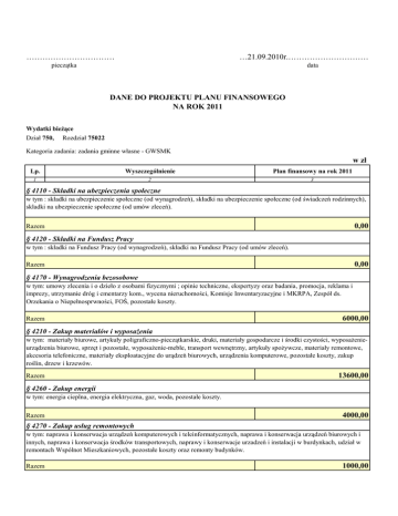 …………………………… …21.09.2010r.………………………… pieczątka data DANE DO PROJEKTU PLANU FINANSOWEGO NA ROK 2011 Wydatki bieżące Dział 750, Rozdział 75022 Kategoria zadania: zadania gminne własne - GWSMK w zł Lp. Wyszczególnienie Plan finansowy na rok 2011 1 2 3 § 4110 - Składki na ubezpieczenia społeczne w tym : składki na ubezpieczenie społeczne (od wynagrodzeń), składki na ubezpieczenie społeczne (od świadczeń rodzinnych), skladki na ubezpieczenie społeczne (od umów zleceń). 0,00 Razem § 4120 - Składki na Fundusz Pracy w tym : składki na Fundusz Pracy (od wynagrodzeń), składki na Fundusz Pracy (od umów zleceń). 0,00 Razem § 4170 - Wynagrodzenia bezosobowe w tym: umowy zlecenia i o dzieło z osobami fizycznymi ; opinie techniczne, ekspertyzy oraz badania, promocja, reklama i imprezy, utrzymanie dróg i cmentarzy kom., wycena nieruchomości, Komisje Inwentaryzacyjne i MKRPA, Zespół ds. Orzekania o Niepełnosprwności, FOŚ, pozostałe koszty. Razem 6000,00 § 4210 - Zakup materiałów i wyposażenia w tym: materiały biurowe, artykuły poligraficzno-pieczątkarskie, druki, materiały gospodarcze i środki czystości, wyposażenieurządzenia biurowe, sprzęt i pozostałe, wyposażenie-meble, transport wewnętrzny, artykuły spożywcze, materiały remontowe, akcesoria telefoniczne, materiały eksploatacyjne do urądzeń biurowych, urządzenia komputerowe, pozostałe koszty, zakup roślin, drzew i krzewów. Razem 13600,00 § 4260 - Zakup energii w tym: energia cieplna, energia elektryczna, gaz, woda, pozostałe koszty. Razem 4000,00 § 4270 - Zakup usług remontowych w tym: naprawa i konserwacja urządzeń komputerowych i teleinformatycznych, naprawa i konserwacja urządzeń biurowych i innych, naprawa i konserwacja środków transportowych, naprawy i konserwacje urzadzeń i instalacji w burdynkach, udział w remontach Wspólnot Mieszkaniowych, pozostałe koszty oraz remonty budynków. Razem 1000,00 § 4300 - Zakup usług pozostałych w tym: odprowadzenie ścieków, usługi związane z transportem wewnetrznym i zewnętrznym, opłaty eksploatacyje z tytułu użytkowania, sprzatanie, dozór, wywóz smieci, usługi wykonania mebli, usługi asysty technicznej sprzętu i oprogramowania, usługi teleinformatyczne, dopłaty do pracowaników UMK podejmujących naukę, opłaty pocztowe, frankownice, poligrafia i introligatorstwo, targi i prezentacje promocyjne, wykonanie materiałów promocyjnych, ogłoszenia i reklama, gastronomia, hotelarstwo oraz usługi związane z pobytem delegacji. 4500,00 Razem § 4360 - Opłaty z tytułu zakupu usług telekomunikacyjnych telefonii komórkowej w tym: opłaty z tytułu zakupu usług telekomunikacyjnych telefonii komórkowej. 0,00 Razem § 4370 - Opłaty z tytułu zakupu usług telekomunikacyjnych telefonii stacjonarnej w tym: opłaty z tytułu zakupu usług telekomunikacyjnych telefonii stacjonarnej. 7000,00 Razem § 4390 - Zakup usług obejmujących wykonanie ekspertyz, analiz i opinii w tym: zakup usług obejmujących wykonanie ekspetyz, analiz i opinii. 0,00 Razem § 4410 - Podróże służbowe krajowe w tym: podróże służbowe krajowe, bilety komunikacji miejskiej. 1000,00 Razem § 4740 - Zakup materiałów papierniczych do sprzętu drukarskiego i urządzeń kserograficznych w tym: zakup materiałów papierniczych do sprzętu drukarskiego i urządzeń kserograficznych. Razem 1400,00 § 4750 - Zakup akcesoriów komputerowych, w tym programów i licencji w tym: zakup akcesoriów komputerowych, zakup programów i licencji. Razem Całkowita kwota do dyspozycji Dzielnicy 1500,00 40 000,00 ................................................ podpis Przewodniczącego Rady i Zarządu Dzielnicy