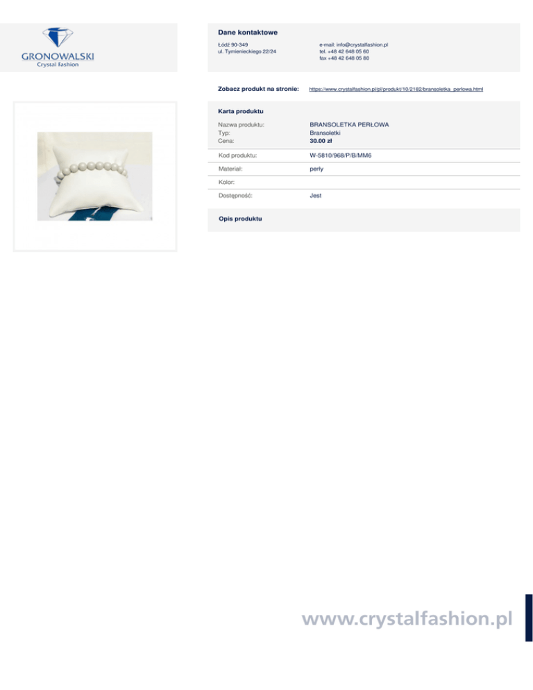 Powered by TCPDF (www.tcpdf.org) Dane kontaktowe Łódź 90-349 ul. Tymienieckiego 22/24 Zobacz produkt na stronie: e-mail: [email protected] tel. +48 42 648 05 60 fax +48 42 648 05 80 https://www.crystalfashion.pl/pl/produkt/10/2182/bransoletka_perlowa.html Karta produktu Nazwa produktu: Typ: Cena: BRANSOLETKA PERŁOWA Bransoletki 30.00 zł Kod produktu: W-5810/968/P/B/MM6 Materiał: perły Kolor: Dostępność: Opis produktu Jest