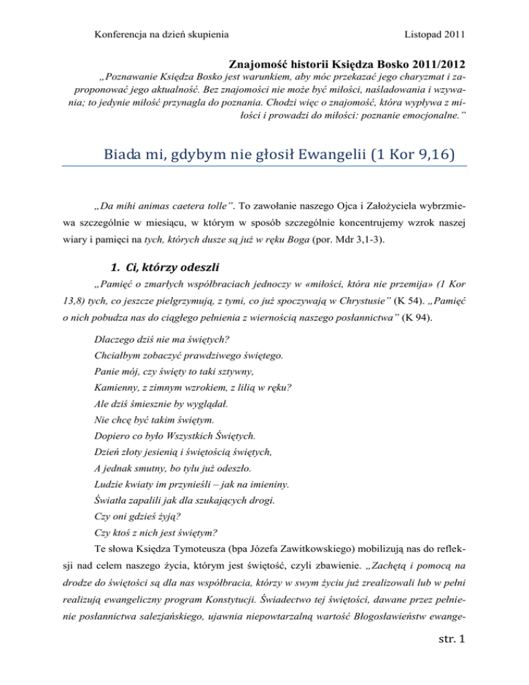 Konferencja na dzień skupienia Listopad 2011 Znajomość historii Księdza Bosko 2011/2012 „Poznawanie Księdza Bosko jest warunkiem, aby móc przekazać jego charyzmat i zaproponować jego aktualność. Bez znajomości nie może być miłości, naśladowania i wzywania; to jedynie miłość przynagla do poznania. Chodzi więc o znajomość, która wypływa z miłości i prowadzi do miłości: poznanie emocjonalne.” Biada mi, gdybym nie głosił Ewangelii (1 Kor 9,16) „Da mihi animas caetera tolle”. To zawołanie naszego Ojca i Założyciela wybrzmiewa szczególnie w miesiącu, w którym w sposób szczególnie koncentrujemy wzrok naszej wiary i pamięci na tych, których dusze są już w ręku Boga (por. Mdr 3,1-3). 1. Ci, którzy odeszli „Pamięć o zmarłych współbraciach jednoczy w «miłości, która nie przemija» (1 Kor 13,8) tych, co jeszcze pielgrzymują, z tymi, co już spoczywają w Chrystusie” (K 54). „Pamięć o nich pobudza nas do ciągłego pełnienia z wiernością naszego posłannictwa” (K 94). Dlaczego dziś nie ma świętych? Chciałbym zobaczyć prawdziwego świętego. Panie mój, czy święty to taki sztywny, Kamienny, z zimnym wzrokiem, z lilią w ręku? Ale dziś śmiesznie by wyglądał. Nie chcę być takim świętym. Dopiero co było Wszystkich Świętych. Dzień złoty jesienią i świętością świętych, A jednak smutny, bo tylu już odeszło. Ludzie kwiaty im przynieśli – jak na imieniny. Światła zapalili jak dla szukających drogi. Czy oni gdzieś żyją? Czy ktoś z nich jest świętym? Te słowa Księdza Tymoteusza (bpa Józefa Zawitkowskiego) mobilizują nas do refleksji nad celem naszego życia, którym jest świętość, czyli zbawienie. „Zachętą i pomocą na drodze do świętości są dla nas współbracia, którzy w swym życiu już zrealizowali lub w pełni realizują ewangeliczny program Konstytucji. Świadectwo tej świętości, dawane przez pełnienie posłannictwa salezjańskiego, ujawnia niepowtarzalną wartość Błogosławieństw ewange- str. 1 Konferencja na dzień skupienia Listopad 2011 licznych i jest najcenniejszym darem, jaki możemy ofiarować młodzieży” (K 25). „W wypełnianiu tego posłannictwa odnajdujemy drogę naszego uświęcenia” (K 2). 2. Ewangelizacja, stare - nowe wezwanie Już przed ponad dwudziestu laty ks. Generał E. Viganò w swoim liście okólnym Nowa Ewangelizacja pisał: „Ewangelizować” to znaczy przede wszystkim umieć głosić dzisiejszemu człowiekowi radosną nowość Paschy, wobec której upadają i rozsypują się w gruzy wszystkie przemijające i nietrwałe nowości, przemieniające się szybko w monotonię i niezadowolenie, jakie zwykły charakteryzować znudzone życie cywilizacji tylko horyzontalnej. Trzeba koniecznie stać się uwspółcześnionymi głosicielami tej wielkiej „nowości” z jej ogromnymi historycznymi wartościami. Istnieją, jak wiemy, dwa najważniejsze środki, przez które przekazujemy całe jej bogactwo. Są to: Słowo Boże i Liturgia. Stanowią one, jak tor kolejowy, wielką drogę „powrotu do źródeł”. Powrócić do źródeł – napisał Jan Paweł II – to w naszym wypadku znaczy powrócić do tego źródła życia, z którego czerpie siłę „gorliwość świętych”. Musimy wsłuchać się w pierwsze świadectwa Ewangelii, mówiące o sile, nowości i żywotności pierwszego głoszenia. Oto co mówi św. Jan Ewangelista w swoim pierwszym Liście: «To, co było od początku, to, cośmy słyszeli i zobaczyli własnymi oczyma, to, na co patrzyliśmy i czego dotykały nasze ręce… to wam oznajmiamy, abyście i wy mieli współuczestnictwo z nami»1. I dziś powinniśmy nieustannie pamiętać, że ewangelizacja czerpie żywotne soki z Bożego Słowa, dlatego trzeba się tym słowem karmić, tym bardziej, że jako kapłani jesteśmy przecież «sługami Słowa». Konieczne jest więc rozniecenie w sobie owej pierwotnej gorliwości i zapału jakim promieniowali Apostołowie po Pięćdziesiątnicy. Trzeba wzbudzić w sobie płomiennego ducha Apostoła Narodów, który wołał: «Biada mi, gdybym nie głosił Ewangelii» (1 Kor 9,16)2. „Nowa Ewangelizacja dla przekazu wiary chrześcijańskiej” to temat XIII Ogólnego Zebrania Generalnego Synodu Biskupów, który odbędzie się w roku 2012. Tematyka Nowej Ewangelizacji podjęta była również w czasie Visita d’insieme, która miała miejsce we wrześniu, podczas której zwrócono uwagę na aktualne wyzwania przed którymi stoi Kościół, a w nim my jako salezjanie. 1 E. Viganò, Nowa Ewangelizacja. List okólny, Kraków 1990, s. 11. 2 Por. Kalbarczyk A., Program przepowiadania na rok 2010/2011 „W komunii z Bogiem”, w: W komunii z Bogiem. Kościół domem i szkołą komunii. Program duszpasterski Kościoła w Polsce na lata 2010-2013, Święty Wojciech Wydawnictwo, Poznań 2010, s. 45-47. str. 2 Konferencja na dzień skupienia Listopad 2011 a. Rozpoznać wyzwania „W pierwszym rzędzie trzeba wskazać na głęboki kontekst kulturowy. Żyjemy w epoce głębokiej sekularyzacji, w której zatracono umiejętność słuchania i rozumienia słów Ewangelii jako przesłania żywego i ożywczego”3. Sekularyzacja przedstawia się dzisiaj poprzez życie w wolności, bez jakiegokolwiek odniesienia do transcendencji przez co zdominowała codzienne życie ludzi i ukształtowała mentalność, w której Bóg jest praktycznie nieobecny, zupełnie lub częściowo, w życiu i świadomości człowieka4. W środowisku kulturowym naznaczonym w taki sposób nie może nas zdziwić, że te idee zsekularyzowanego świata naznaczają codzienne postępowanie wielu chrześcijan. A my wychowawcy i duszpasterze jesteśmy posłani do tych młodych, którzy są dziećmi tego środowiska. Trzeba dodać, że jednym z mocnych argumentów sekularyzacji jest ogłoszona swego czasu przez Nietzsche’go, tzw. „śmierć Boga”. Ta „śmierć” przyniosła nam nie tylko świat pełen sierot, ale świat pe