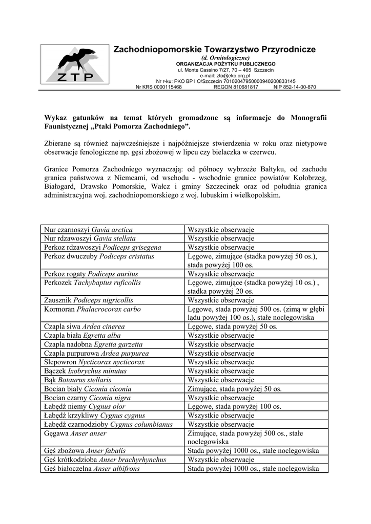 Zachodniopomorskie Towarzystwo Przyrodnicze (d. Ornitologiczne) ORGANIZACJA POŻYTKU PUBLICZNEGO ul. Monte Cassino 7/27, 70 – 465 Szczecin e-mail: [email protected] Nr r-ku: PKO BP I O/Szczecin 70102047950000940200833145 Nr KRS 0000115468 REGON 810681817 NIP 852-14-00-870 Wykaz gatunków na temat których gromadzone są informacje do Monografii Faunistycznej „Ptaki Pomorza Zachodniego”. Zbierane są również najwcześniejsze i najpóźniejsze stwierdzenia w roku oraz nietypowe obserwacje fenologiczne np. gęsi zbożowej w lipcu czy bielaczka w czerwcu. Granice Pomorza Zachodniego wyznaczają: od północy wybrzeże Bałtyku, od zachodu granica państwowa z Niemcami, od wschodu - wschodnie granice powiatów Kołobrzeg, Białogard, Drawsko Pomorskie, Wałcz i gminy Szczecinek oraz od południa granica administracyjna woj. zachodniopomorskiego z woj. lubuskim i wielkopolskim. Nur czarnoszyi Gavia arctica Nur rdzawoszyi Gavia stellata Perkoz rdzawoszyi Podiceps grisegena Perkoz dwuczuby Podiceps cristatus Perkoz rogaty Podiceps auritus Perkozek Tachybaptus ruficollis Zausznik Podiceps nigricollis Kormoran Phalacrocorax carbo Czapla siwa Ardea cinerea Czapla biała Egretta alba Czapla nadobna Egretta garzetta Czapla purpurowa Ardea purpurea Ślepowron Nycticorax nycticorax Bączek Ixobrychus minutus Bąk Botaurus stellaris Bocian biały Ciconia ciconia Bocian czarny Ciconia nigra Łabędź niemy Cygnus olor Łabędź krzykliwy Cygnus cygnus Łabędź czarnodzioby Cygnus columbianus Gęgawa Anser anser Gęś zbożowa Anser fabalis Gęś krótkodzioba Anser brachyrhynchus Gęś białoczelna Anser albifrons Wszystkie obserwacje Wszystkie obserwacje Wszystkie obserwacje Lęgowe, zimujące (stadka powyżej 50 os.), stada powyżej 100 os. Wszystkie obserwacje Lęgowe, zimujące (stadka powyżej 10 os.) , stadka powyżej 20 os. Wszystkie obserwacje Lęgowe, stada powyżej 500 os. (zimą w głębi lądu powyżej 100 os.), stałe noclegowiska Lęgowe, stada powyżej 50 os. Wszystkie obserwacje Wszystkie obserwacje Wszystkie obserwacje Wszystkie obserwacje Wszystkie obserwacje Wszystkie obserwacje Zimujące, stada powyżej 50 os. Wszystkie obserwacje Lęgowe, stada powyżej 100 os. Wszystkie obserwacje Wszystkie obserwacje Zimujące, stada powyżej 500 os., stałe noclegowiska Stada powyżej 1000 os., stałe noclegowiska Wszystkie obserwacje Stada powyżej 1000 os., stałe noclegowiska Bernikla białolica Branta leucopsis Bernikla obrożna Branta bernicla Bernikla kanadyjska Branta canadensis Ohar Tadorna tadorna Mandarynka Aix galericulata Krzyżówka Anas platyrhynchos Krakwa Anas strepera Świstun Anas penelope Cyraneczka Anas crecca Cyranka Anas querquedula Rożeniec Anas acuta Płaskonos Anas clypeata Hełmiatka Netta rufina Głowienka Aythya ferina Czernica Aythya fuligula Podgorzałka Aythya nyroca Ogorzałka Aythya marila Gągoł Bucephala clangula Uhla Melanitta fusca Markaczka Melanitta nigra Lodówka Clangula hyemalis Edredon Somateria mollissima Nurogęś Mergus merganser Szlachar Mergus serrator Bielaczek Mergus albellus Orzeł przedni Aquila chrysaetos Orlik krzykliwy Aquila pomarina Bielik Haliaeetus albicilla Rybołów Pandion haliaetus Myszołów Buteo buteo Myszołów włochaty Buteo lagopus Trzmielojad Pernis apivorus Jastrząb Accipiter gentilis Krogulec Accipiter nisus Kania ruda Milvus milvus Kania czarna Milvus migrans Błotniak stawowy Circus aeruginosus Błotniak zbożowy Circus cyaneus Błotniak łąkowy Circus pygargus Sokół wędrowny Falco peregrinus Wszystkie obserwacje Wszystkie obserwacje Wszystkie obserwacje Wszystkie obserwacje Wszystkie obserwacje Stada powyżej 1000 os. Lęgowe, zimujące, stada powyżej 100 os. Zimujące, stada powyżej 100 os. Lęgowe, zimujące, stada powyżej 100 os. Lęgowe, zimujące, stada powyżej 30 os. Lęgowe, zimujące, stada powyżej 100 os. Lęgowe, zimujące, stada powyżej 50 os. Wszystkie obserwacje Lęgowe, stada powyżej 500 os. Lęgowe, stada powyżej 1000 os. Wszystkie obserwacje Wszystkie obserwacje poza wybrzeżem i Zalewem Szczecińskim (na zalewie i wybrzeżu stada powyżej 1000 os.) Lęgowe, stada powyżej 500 os. Wszystkie obserwacje poza wybrzeżem, na wybrzeżu stadka powyżej 10 os. Wszystkie obserwacje poza wybrzeżem, na wybrzeżu stadka powyżej 100 os. Wszystkie obserwacje poza wybrzeżem, na wybrzeżu stada powyżej 1000 os. Wszystkie obserwacje poza wybrzeżem, na wybrzeżu stadka powyżej 10 os. Lęgowe, stada powyżej 500 os. Wszystkie obserwacje poza wybrzeżem, na wybrzeżu stada powyżej 100 os. Wszystkie obserwacje poza Zalewem Szczecińskim i wybrzeżem (na zalewie powyżej 1000 os.) Wszystkie obserwacje Wszystkie obserwacje Lęgowe, zgrupowania powyżej 10 os. Wszystkie obserwacje Zgrupowania powyżej 50 os. Wszystkie obserwacje Wszystkie obserwacje Lęgowe Lęgowe Lęgowe, zimujące Wszystkie obserwacje Lęgowe, zimujące Wszystkie obserwacje Wszystkie obserwacje Wszystkie obserwacje Kobuz Falco subbuteo Drzemlik Falco columbarius Kobczyk Falco vespertinus Pustułka Falco tinnunculus Kuropatwa Perdix perdix Jarząbek Bonasa bonasia Przepiórka Coturnix coturnix Żuraw Grus grus Wodnik Rallus aquaticus Kropiatka Porzana porzana Zielonka Porzana parva Derkacz Crex crex Kokoszka Gallinula chloropus Łyska Fulica atra Ostrygojad Haematopus ostralegus Czajka Vanellus vanellus Sieweczka obrożna Charadrius hiaticula Sieweczka rzeczna Charadrius dubius Siewnica Pluvialis squatarola Siewka złota Pluvialis apricaria Szablodziób Recurvirostra avosetta Biegus rdzawy Calidris canutus Piaskowiec Calidris alba Biegus malutki Calidris minuta Biegus mały Calidris temminckii Biegus krzywodzioby Calidris ferruginea Biegus zmienny Calidris alpina Biegus płaskodzioby Limicola falcinellus Batalion Philomachus pugnax Bekasik Lymnocryptes minimus Kszyk Gallinago gallinago Dubelt Gallinago media Słonka Scolopax rusticola Rycyk Limosa limosa Szlamnik Limosa lapponica Kulik mniejszy Numenius phaeopus Kulik wielki Numen