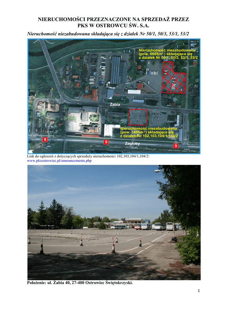 NIERUCHOMOŚCI PRZEZNACZONE NA SPRZEDAŻ PRZEZ PKS W OSTROWCU ŚW. S.A. Nieruchomość niezabudowana składająca się z działek Nr 50/1, 50/3, 53/1, 53/2 Link do ogłoszeń z dotyczących sprzedaży nieruchomości 102,103,104/1,104/2: www.pksostrowiec.pl/announcements.php Położenie: ul. Żabia 40, 27-400 Ostrowiec Świętokrzyski. 1 Opis nieruchomości przeznaczonej na sprzedaż: Sprzedaży podlega prawo użytkowania wieczystego – cztery wydzielone działki niezabudowane o łącznej powierzchni 6.605 m2. Lokalizacja działek – centrum miasta Ostrowca Św., w bezpośrednim sąsiedztwie z Dworcem Autobusowym PKS, na terenie obecnej bazy PKS, blisko dworca PKP oraz z bezpośrednim sąsiedztwem ogólnodostępnego parkingu miejskiego (po drugiej stronie ul Żabiej). Położenie działki wzdłuż ulicy Składowej z możliwością bezpośredniego dostępu do drogi powiatowej / ulica Żabia. Lokalizacja w odległości 500m od centrum handlowego Galeria Ostrowiec TESCO oraz Castorama. Nieopodal nowoczesna Pływalnia Rawszczyzna i Park Miejski. Uzbrojenie techniczne - pełne: instalacja wodno-kanalizacyjna, gazowa oraz energetyczna. Przeznaczenie nieruchomości – zabudowa komercyjna. Teren, na którym znajduje się działka nie jest obecnie objęty aktualnie obowiązującym planem zagospodarowania przestrzennego. W Studium Uwarunkowań i Kierunków Zagospodarowania Przestrzennego miasta Ostrowca teren ten jest opisany jako A2 – tereny większych skupisk infrastruktury transportowej. Warunki zabudowy – korzystne. Plac utwardzony - nawierzchnia asfaltowa. Obecnie teren jest dzierżawiony jako plac manewrowy dla nauki i doskonalenia techniki jazdy wykorzystywany przez szkoły nauki jazdy dla kandydatów na kierowców. Sprzedaż nieruchomości nastąpi w drodze przetargu na sprzedaż składników aktywów trwałych przeprowadzonego w trybie rozporządzenia Rady Ministrów z dn. 13 lutego 2007 r. (Dz.U. 2007 Nr 27 poz. 177 ze zm.) Cena wywoławcza ustalona została na kwotę 1.265.854 zł netto (1.557.000 zł brutto) w ślad za aktualnym operatem szacunkowym sporządzonym dla nieruchomości w dniu 31.12.2015 r. Zainteresowanych zapraszamy do zapoznania się ze stanem nieruchomości „na miejscu”. Informacje: Biuro Zarządu tel. 41-247-97-90, 41-265-11-35 fax. 41-247-97-89 (w godz. od 7 do 15) Dodatkowo (całodobowo) Tel. kom. 607 303 405 2 3