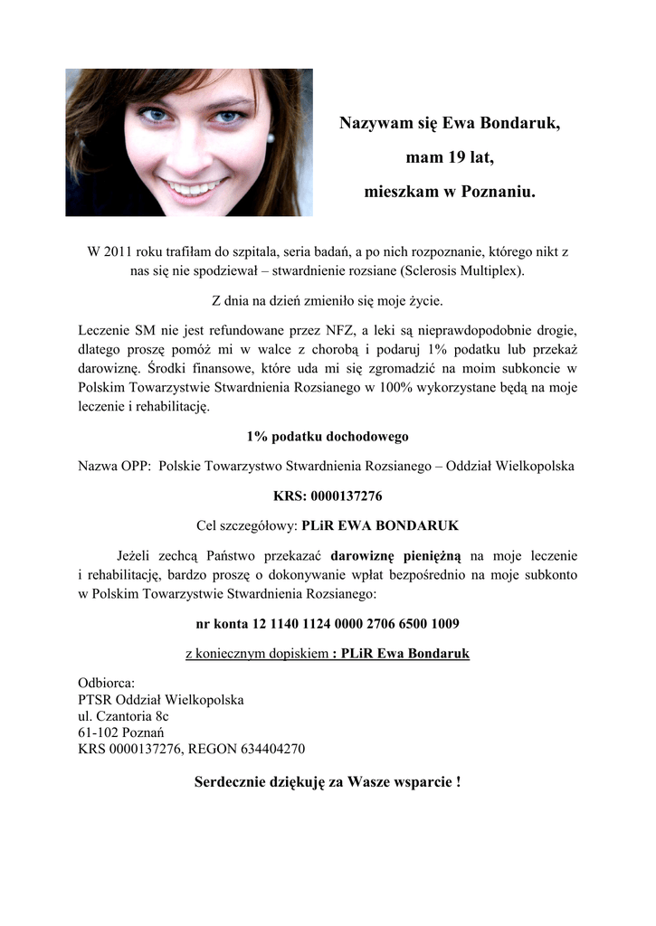 Nazywam się Ewa Bondaruk, mam 19 lat, mieszkam w Poznaniu. W 2011 roku trafiłam do szpitala, seria badań, a po nich rozpoznanie, którego nikt z nas się nie spodziewał – stwardnienie rozsiane (Sclerosis Multiplex). Z dnia na dzień zmieniło się moje życie. Leczenie SM nie jest refundowane przez NFZ, a leki są nieprawdopodobnie drogie, dlatego proszę pomóż mi w walce z chorobą i podaruj 1% podatku lub przekaż darowiznę. Środki finansowe, które uda mi się zgromadzić na moim subkoncie w Polskim Towarzystwie Stwardnienia Rozsianego w 100% wykorzystane będą na moje leczenie i rehabilitację. 1% podatku dochodowego Nazwa OPP: Polskie Towarzystwo Stwardnienia Rozsianego – Oddział Wielkopolska KRS: 0000137276 Cel szczegółowy: PLiR EWA BONDARUK Jeżeli zechcą Państwo przekazać darowiznę pieniężną na moje leczenie i rehabilitację, bardzo proszę o dokonywanie wpłat bezpośrednio na moje subkonto w Polskim Towarzystwie Stwardnienia Rozsianego: nr konta 12 1140 1124 0000 2706 6500 1009 z koniecznym dopiskiem : PLiR Ewa Bondaruk Odbiorca: PTSR Oddział Wielkopolska ul. Czantoria 8c 61-102 Poznań KRS 0000137276, REGON 634404270 Serdecznie dziękuję za Wasze wsparcie !