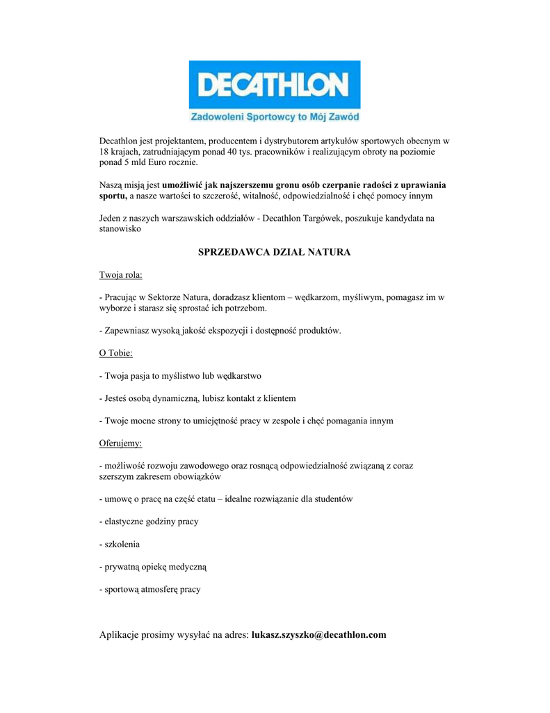 Decathlon jest projektantem, producentem i dystrybutorem artykułów sportowych obecnym w 18 krajach, zatrudniającym ponad 40 tys. pracowników i realizującym obroty na poziomie ponad 5 mld Euro rocznie. Naszą misją jest umożliwić jak najszerszemu gronu osób czerpanie radości z uprawiania sportu, a nasze wartości to szczerość, witalność, odpowiedzialność i chęć pomocy innym Jeden z naszych warszawskich oddziałów - Decathlon Targówek, poszukuje kandydata na stanowisko SPRZEDAWCA DZIAŁ NATURA Twoja rola: - Pracując w Sektorze Natura, doradzasz klientom – wędkarzom, myśliwym, pomagasz im w wyborze i starasz się sprostać ich potrzebom. - Zapewniasz wysoką jakość ekspozycji i dostępność produktów. O Tobie: - Twoja pasja to myślistwo lub wędkarstwo - Jesteś osobą dynamiczną, lubisz kontakt z klientem - Twoje mocne strony to umiejętność pracy w zespole i chęć pomagania innym Oferujemy: - możliwość rozwoju zawodowego oraz rosnącą odpowiedzialność związaną z coraz szerszym zakresem obowiązków - umowę o pracę na część etatu – idealne rozwiązanie dla studentów - elastyczne godziny pracy - szkolenia - prywatną opiekę medyczną - sportową atmosferę pracy Aplikacje prosimy wysyłać na adres: [email protected]
