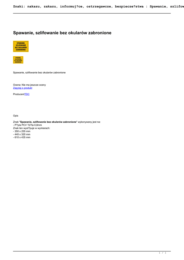 Znaki: nakazu, zakazu, informuj?ce, ostrzegawcze, bezpiecze?stwa : Spawanie, szlifow Spawanie, szlifowanie bez okularów zabronione Spawanie, szlifowanie bez okularów zabronione Ocena: Nie ma jeszcze oceny Zapytaj o produkt ProducentTDC Opis Znak "Spawanie, szlifowanie bez okularów zabronione" wykonywany jest na: - P?yta PCV ?ó?ta 0,8mm Znak ten wyst?puje w wymiarach: - 350 x 255 mm - 440 x 320 mm - 610 x 435 mm 1 / 1 Powered by TCPDF (www.tcpdf.org)