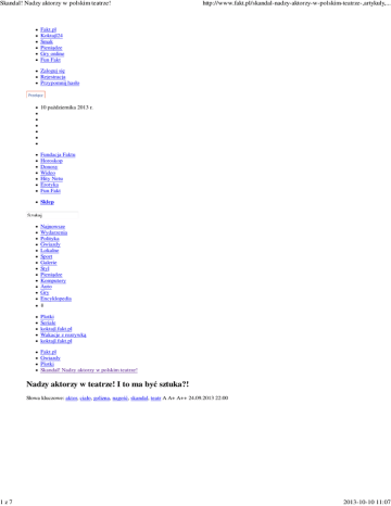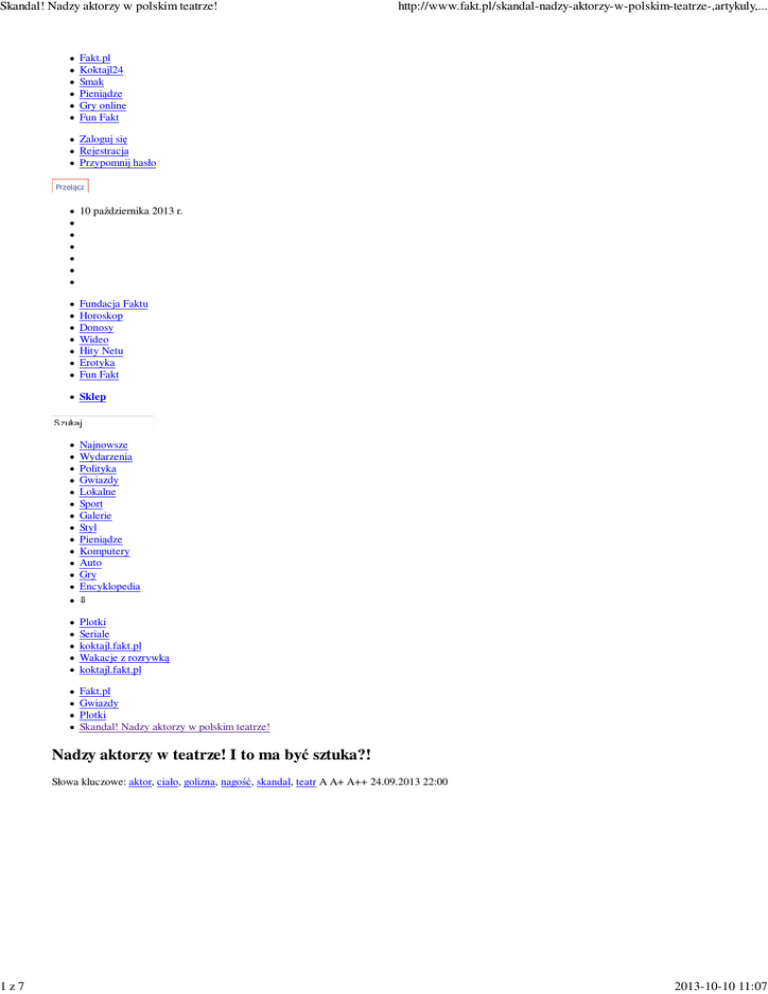 Skandal! Nadzy aktorzy w polskim teatrze! 1z7 http://www.fakt.pl/skandal-nadzy-aktorzy-w-polskim-teatrze-,artykuly,... Fakt.pl Koktajl24 Smak Pieniądze Gry online Fun Fakt Zaloguj się Rejestracja Przypomnij hasło Przełącz 10 października 2013 r. Fundacja Faktu Horoskop Donosy Wideo Hity Netu Erotyka Fun Fakt Sklep Najnowsze Wydarzenia Polityka Gwiazdy Lokalne Sport Galerie Styl Pieniądze Komputery Auto Gry Encyklopedia ⇓ Plotki Seriale koktajl.fakt.pl Wakacje z rozrywką koktajl.fakt.pl Fakt.pl Gwiazdy Plotki Skandal! Nadzy aktorzy w polskim teatrze! Nadzy aktorzy w teatrze! I to ma być sztuka?! Słowa kluczowe: aktor, ciało, golizna, nagość, skandal, teatr A A+ A++ 24.09.2013 22:00 2013-10-10 11:07 Skandal! Nadzy aktorzy w polskim teatrze! 2z7 ZOBACZ ZDJĘCIA spektaklu "The modesty of icebergs" http://www.fakt.pl/skandal-nadzy-aktorzy-w-polskim-teatrze-,artykuly,... Próba medialna do Tego jeszcze nie było! Nadzy aktorzy unoszą się w miłosnym rytmie w takt nut Fryderyka Chopina. Wszystko to w kontrowersyjnej sztuce - „The Modesty of Icebergs", którą dzisiaj i jutro można zobaczyć w warszawskim Teatrze Studio. Będzie skandal? Zobacz galerię zdjęć (2/6) Dziś polecamy Wyrzucili ciężarną ze ... Prawnik zabił żonę, bo ... Biedronki mutanty pożerają ... Te piersi ważą 20 kilogramów Dziś w Koktajl24.pl polecamy Księżna Charlene na pokazie ... Oto ideał kobiecego ciała. ... Uczestniczka "Top Model" w ... Zobacz również Ta seksbomba gra księżnę ... Pokazały nagie piersi na ... Najpopularniejsze Te piersi ważą 20 kilogramów Rentgen zdradził tajemnicę ... Wdowa po Ciechowskim o ... Hubert Urbański się ... 2013-10-10 11:07 Skandal! Nadzy aktorzy w polskim teatrze! 3z7 http://www.fakt.pl/skandal-nadzy-aktorzy-w-polskim-teatrze-,artykuly,... Przełącz 0 Podczas sztuki „The Modesty of Icebergs” sześciu aktorów przez cały czas występuje w pełnej krasie. I to do tego w rytm muzyki Fryderyka Chopina. Tego w polskim teatrze jeszcze nie było! Francuska grupa wystąpi na Międzynarodowym Festiwalu Tańca Współczesnego Ciało. – Na scenie reprezentują nas ciała w stanie wstrząsu. Nagie jak przestrzeń dookoła, ukazują niezbywalną dla kondycji ludzkiej wyrwę, która pojawia się w momencie nieoczekiwanego przekroczenia tyranii powierzchowności. Trio przemienia się w duet, a nieobecność miłosnej rywalizacji neutralizuje wszystkie formy wykluczenia. Nie jest to jednak podbój, lecz poszukiwanie możliwości i nadzwyczajny wysiłek podejmowany po to, by zwyczajnie żyć - mówi twórca spektaklu, Daniel Léveillé. I choć sztuka ta przyjechała do Polski tylko gościnnie na dwa spektakle, pojawia się pytanie. Czy Polska jest gotowa na taką formę artyzmu? Czy będzie z tego skandal? >>> Wieczorek z "M jak miłość" nago na ... >>> Gwiazda pokazała piersi. FOTO >>> Pokazały nagie piersi na festiwalu w ... [ BP ] Przełącz 0 ŚREDNIA OCENA 3.71/5. GŁOSÓW: 7 Waszym zdaniem Jesteś za nagością w teatrze? Tak Nie Zobacz co czytali inni: Kalisz chwali się zdjęciami syna Jak każdy dumny ojciec Ryszard Kalisz rozsyła po znajomych i przyjaciołach zdjęcia z synkiem. więcej Prawnik zabił żonę, bo chciała rozwodu. NOWE FAKTY Na jaw wychodzą kolejne szczegóły makabrycznej zbrodni na warszawskiej Pradze Południe. Z dotychczasowych ustaleń wynika, że przyczyną rodzinnej tragedii była sprawa rozwodowa. Łukasz P. (+34 l.) liczył na to, że Monika W. (+33 l. więcej Sp o n s o r o w a n e Przeprowadzka do nowego mieszkania? Nie odcinaj się od świata, wybierz ofertę na Telewizję Internet i Telefon od UPC! więcej Miss Polski: Nie jestem prostytutką Miss Polski Katarzyna Krzeszowska i inne piękne kandydatki do tytułu Miss Świata zostały obrażone przez muzułmanów. Wybory odbywały się na wyspie Bali, a wyznawcy Islamu oskarżali młode kobiety o bycie prostytutkami. więcej Zobacz też 2013-10-10 11:07 Skandal! Nadzy aktorzy w polskim teatrze! 4z7 http://www.fakt.pl/skandal-nadzy-aktorzy-w-polskim-teatrze-,artykuly,... Rentgen zdradził tajemnicę Marilyn ... Kasia Zielińska. Jej dobra passa trwa Patrycja Pająk: Zmądrzałam. Nie będę ... Komentarz ZWIŃ Komentarze: Wszystkie | Popularne | Data: Rosnąco | Malejąco Strona: Następna ZWIŃ 10 ~Janek, 26-09-2013 20:39 Niezłe.... Niezłe ale bez rewelacji.. Fragmentami mi się podobało a gdzie indziej miałem wrażenie że- od figury do figury. Problemem współczesnego teatru tańca nie jest nagość ale brak tańca. Zgłoś Odpowiedz ZWIŃ 10 ~nis, 25-09-2013 18:28 nagość Oczywiście ci z wielkimi uszami... Zgłoś Odpowiedz ZWIŃ 32 ~maciek, 25-09-2013 14:15 skandal Ile osób z głosujących i komentujących chodzi do teatru? A o dyscyplinie zwanej tańcem, ile słyszało? A ile z tych osób chodzi oglądać taniec? A osoba, który takiego njusa wrzuciła, chodzi? A słyszała może o Isadorze Duncan? http://en.wikipedia.org/wiki/Isadora_Duncan Nie? To jest skandal! Ludzie! Ominął was cały XXw.! To niezłe osiągnięcie! Zgłoś Odpowiedz ZWIŃ 22 ~od., 25-09-2013 17:56 RE: skandal 2013-10-10 11:07 Skandal! Nadzy aktorzy w polskim teatrze! 5z7 http://www.fakt.pl/skandal-nadzy-aktorzy-w-polskim-teatrze-,artykuly,... Isadora Duncan nie tańczyla na scenie nago.Nie muszę chodzić do teatru żeby ja znać.Taniec tych panów nijak się ma do jej talentu. Zgłoś Odpowiedz ZWIŃ 25 ~Rajmund, 25-09-2013 08:25 Nareszcie cos dla krytykow Wyobrazam sobie radosc krytyka Romana Pawlowskiego z "Gazety Wyborczej"ktory lansuje przez wiele lat teatr awangardowy.Coz za szczescie musi panowac w kregach naszej krytyki teatralnej,Nareszcie uwalniamy sie od konserwatywnego teatru opartego na literaturze i aktorach mowiacych pieknie tekst.Brawo !!!!Prosimy o wiecej !!!! Zgłoś Odpowiedz Komentarze: Wszystkie | Popularne | Data: Rosnąco | Malejąco Strona: Następna Zobacz też Wychodzi dodatek do Diablo III - ... Gra "Wiejskie życie" - zostań ... "Na ryby" - zo