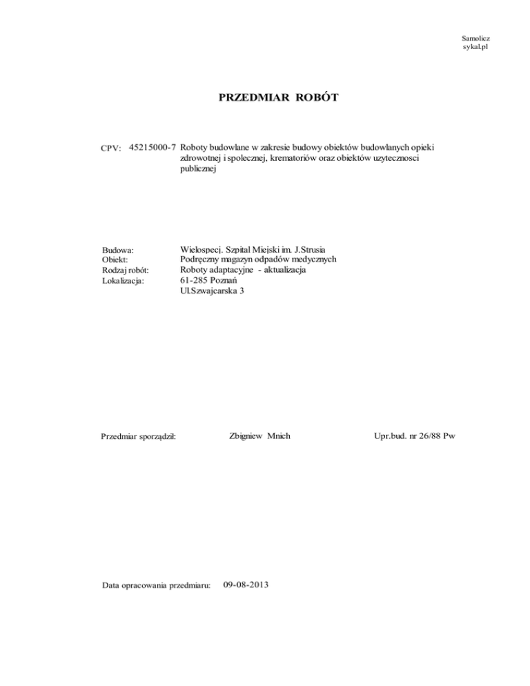 Samolicz sykal.pl PRZEDMIAR ROBÓT CPV: 45215000-7 Roboty budowlane w zakresie budowy obiektów budowlanych opieki zdrowotnej i spolecznej, krematoriów oraz obiektów uzytecznosci publicznej Budowa: Obiekt: Rodzaj robót: Lokalizacja: Wielospecj. Szpital Miejski im. J.Strusia Podręczny magazyn odpadów medycznych Roboty adaptacyjne - aktualizacja 61-285 Poznań Ul.Szwajcarska 3 Przedmiar sporządził: Data opracowania przedmiaru: Zbigniew Mnich 09-08-2013 Upr.bud. nr 26/88 Pw Samolicz sykal.pl SPIS DZIAŁÓW PRZEDMIAR ROBÓT CPV: 45215000-7 Roboty budowlane w zakresie budowy obiektów budowlanych opieki zdrowotnej i spolecznej, krematoriów oraz obiektów uzytecznosci publicznej Budowa: Obiekt: Rodzaj robót: Lokalizacja: Wielospecj. Szpital Miejski im. J.Strusia Podręczny magazyn odpadów medycznych Roboty adaptacyjne - aktualizacja 61-285 Poznań Ul.Szwajcarska 3 PRZEDMIAR Strona 1 09-08-2013 SYKAL DZIAŁ 1 2 3 NAZWA DZIAŁ U CPV 45215000-7: Roboty budowlane w zakresie budowy obiektów budowlanych opieki zdrowotnej i spolecznej, krematoriów oraz obiektów uzytecznosci publicznej - robty budowlane CPV 45332000-3: Roboty instalacyjne wodne i kanalizacyjne CPV 45331220-4: Instalowanie urzadzen klimatyzacyjnych Samolicz sykal.pl PRZEDMIAR ROBÓT CPV: 45215000-7 Roboty budowlane w zakresie budowy obiektów budowlanych opieki zdrowotnej i spolecznej, krematoriów oraz obiektów uzytecznosci publicznej Budowa: Obiekt: Rodzaj robót: Lokalizacja: Wielospecj. Szpital Miejski im. J.Strusia Podręczny magazyn odpadów medycznych Roboty adaptacyjne - aktualizacja 61-285 Poznań Ul.Szwajcarska 3 PRZEDMIAR Strona 1 09-08-2013 SYKAL DZ POZ SYMBOL POZYCJI NUMER ST NAZWA POZYCJI PRZEDMIAROWEJ JEDN MIARY ILOŚĆ 1 CPV 45215000-7: Roboty budowlane w zakresie budowy obiektów budowlanych opieki zdrowotnej i spolecznej, krematoriów oraz obiektów uzytecznosci publicznej - robty budowlane 1 10 KNR 401-08-04-07-00 STWIOR III.1 Zerwanie posadzki cementowej m² 34,15 1 15 KNR 401-08-11-07-00 STWIOR III.1 Rozebranie posadzek z płytek m² 3,24 1 20 KNR 401-02-12-01-00 STWIOR III.1 Rozbiórka elementów betonowych niezbrojonych grubości do 15 cm m³ 0,88 Wykopy wąskoprzestrzenne o szerokości dna do 1,5 m głębokości do 1,5 m kategoria gruntu 3 m³ 0,98 Wykopy jamiste o powierzchni dna do 2,25 m² głębokości do 1,5 m kategoria gruntu 3 m³ 3,39 1 1 30 KNR 40 KNR 401-01-02-02-00 STWIOR III.2 401-01-03-02-00 STWIOR III.2 1 50 KNR 401-01-05-02-00 STWIOR III.2 Zasypanie wykopów z przerzutem ziemi na odległość do 3 m i ubiciem w gruncie kategorii 3 m³ 4,14 1 60 KNR 401-02-07-03-00 STWIOR III.3 Wypełnienie żwirobetonem bruzd o przekroju do 0,045 m² bez deskowania metr 8,50 1 61 KNK 728-03-02-01-00 STWIOR III.3 Uzupełnienie podłoża żwiro-betonowego m² 2,25 1 62 KNR 202-06-40-02-00 STWIOR III.5 Uzupełnienie-uszczelnienie folią w płynie powierzchni poziomych . m² 2,25 1 63 KNR 202-06-09-03-00 STWIOR III.6 Uzupelnienie izolacja pozioma z płyt styropianowych (podłoga) gr 10 cm . m² 2,25 Uzupelnienie izolacja pozioma podposadzkowa z folii polietylenowej m² 2,25 1,00 1 64 KNNR N002-06-04-01-00 STWIOR III.5 1 65 KNK 728-03-02-08-00 STWIOR III.5 Uzupełnienie posadzki jednolitej cementowej m² 1 66 KNK 728-03-03-01-00 STWIOR III.5 Uzupełnienie posadzki z płytek GRES m² 3,24 1 70 KNR 202-11-06-04-00 STWIOR III.5 Posadzka cementowa grub 2,5 cm wypalana z cokolikiem m² 31,90 1 80 KNR 202-11-06-03-00 STWIOR III.5 Posadzka cementowa - dodatek za pogrubienie o 1 cm-dodatkowe 5 cm m² 1 90 KNR 712-01-05-01-00 STWIOR III.8 Odtłuszczanie konstrukcji pełnościennych m² 175,91 1 95 KNR 712-01-08-01-00 STWIOR III.8 Czyszczenie strum-ścier stan wyjściowy C do 3 st.cz. konstrukcji m² 99,22 1 100 KNR 712-02-06-01-00 STWIOR III.8 Malowanie pędzlem konstr pełnośc f.poliwin grunt og stosow m² 99,22 1 110 KNR 712-02-14-01-00 STWIOR III.8 Malowanie pędzlem konstr pełnośc emalią poliwinyl og stos -dwukrotnie m² 99,22 31,90 1 120 KNR 401-05-35-04-00 STWIOR III.9 Rozebranie rynien dachowych nie nadających się do użytku metr 8,50 1 130 KNR 217-01-52-02-00 STWIOR III.9 Wywietrzak dachowy z głowicą Turbowent ø 160 kmpl 2,00 1 140 KNR 217-01-46-01-00 STWIOR III.9 Czerpnia ścienna prostokątna typ A 200x200 szt 2,00 1 150 KNR 202-26-14-01-60 STWIOR III.6 Ocieplenie ścian płytami styropianowymi gr 15 cm z wyprawa elewacyjna silikatową typu "baranek" gr 1,5mm -ETICS m² 75,11 Ocieplenie ścian płytami styropianowymi, ochrona narożników kątownikiem metr 17,90 Izolacja stropu z płyt PW11A m² 39,24 1 1 160 KNR 170 KNR 202-26-14-10-60 STWIOR III.6 202-06-09-01-00 STWIOR III.7 PRZEDMIAR Strona 2 09-08-2013 SYKAL SYMBOL POZYCJI NUMER ST NAZWA POZYCJI PRZEDMIAROWEJ JEDN MIARY DZ POZ 1 180 KNR 202-05-41-01-00 STWIOR III.9 Obróbki blacharskie z blachy powlekanej o szer do 25 cm m² 6,50 1 190 KNR 202-05-46-01-00 STWIOR III.9 Rynny dachowe półokrągłe z PCW ø 115 na klej - rynny metr 8,20 1 200 KNR 202-05-46-02-00 STWIOR III.9 Rynny dachowe półokrągłe z PCW ø 115 na klej - leje spustowe szt 1,00 1 210 KNR 202-05-46-03-00 STWIOR III.9 Rynny dachowe półokrągłe z PCW ø 115 na klej - narożniki szt 1,00 1 220 KNR 202-05-46-04-00 STWIOR III.9 Rynny dachowe półokrągłe z PCW ø 115 na klej - denka rynnowe szt 1,00 1 230 KNR 202-05-27-01-50 STWIOR III.7 Pokrycie dachów 1x papą termozgrzewalną podkładową+ papa termozgrzewalna wierzchniego krycia Zdumbit PF + WF m² 39,24 1 240 Izolacja pionowa drzwi z folii aluthermo quattro wraz z uszczenieniem obwodowym trwale elastyczną opaską samoprzylepną. m² 3,00 Analiza własna STWIOR III.9 ILOŚĆ 1 250 KNR 202-05-41-02-00 STWIOR III.9 Obróbki blacharskie z blachy powlekanej o szer od 25 cm m² 3,00 1 260 KNR 201-03-10-02-00 STWIOR III.2 Wykopy ciągłe lub jamiste ze skarpami szer dna do 1,5 m i głęb do 1,5 m na odkład w gruncie kat 3 m³ 0,72 1 270 KNR 202-11-01-07-05 STWIOR III.3 Podkład na gruncie z mieszanki piaskowo-żwirowej m