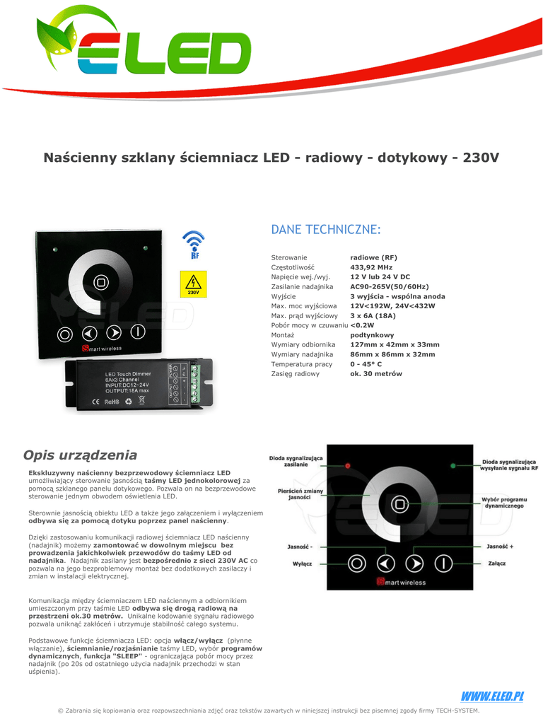 Naścienny szklany ściemniacz LED - radiowy - dotykowy - 230V DANE TECHNICZNE: Sterowanie radiowe (RF) Częstotliwość 433,92 MHz Napięcie wej./wyj. 12 V lub 24 V DC Zasilanie nadajnika AC90-265V(50/60Hz) Wyjście 3 wyjścia - wspólna anoda Max. moc wyjściowa 12V<192W, 24V<432W Max. prąd wyjściowy 3 x 6A (18A) Pobór mocy w czuwaniu <0.2W Montaż podtynkowy Wymiary odbiornika 127mm x 42mm x 33mm Wymiary nadajnika 86mm x 86mm x 32mm Temperatura pracy 0 - 45° C Zasięg radiowy ok. 30 metrów Opis urządzenia Ekskluzywny naścienny bezprzewodowy ściemniacz LED umożliwiający sterowanie jasnością taśmy LED jednokolorowej za pomocą szklanego panelu dotykowego. Pozwala on na bezprzewodowe sterowanie jednym obwodem oświetlenia LED. Sterownie jasnością obiektu LED a także jego załączeniem i wyłączeniem odbywa się za pomocą dotyku poprzez panel naścienny. Dzięki zastosowaniu komunikacji radiowej ściemniacz LED naścienny (nadajnik) możemy zamontować w dowolnym miejscu bez prowadzenia jakichkolwiek przewodów do taśmy LED od nadajnika. Nadajnik zasilany jest bezpośrednio z sieci 230V AC co pozwala na jego bezproblemowy montaż bez dodatkowych zasilaczy i zmian w instalacji elektrycznej. Komunikacja między ściemniaczem LED naściennym a odbiornikiem umieszczonym przy taśmie LED odbywa się drogą radiową na przestrzeni ok.30 metrów. Unikalne kodowanie sygnału radiowego pozwala uniknąć zakłóceń i utrzymuje stabilność całego systemu. Podstawowe funkcje ściemniacza LED: opcja włącz/wyłącz (płynne włączanie), ściemnianie/rozjaśnianie taśmy LED, wybór programów dynamicznych, funkcja "SLEEP" - ograniczająca pobór mocy przez nadajnik (po 20s od ostatniego użycia nadajnik przechodzi w stan uśpienia). WWW.ELED.PL © Zabrania się kopiowania oraz rozpowszechniania zdjęć oraz tekstów zawartych w niniejszej instrukcji bez pisemnej zgody firmy TECH-SYSTEM. Rysunek Techniczny Instalacja nadajnika i odbiornika WWW.ELED.PL © Zabrania się kopiowania oraz rozpowszechniania zdjęć oraz tekstów zawartych w niniejszej instrukcji bez pisemnej zgody firmy TECH-SYSTEM. PROGRAMOWANIE URZĄDZEŃ Każdy nowo dostarczony zestaw wymaga zaprogramowania nadajnika do odbiornika. Aby zaprogramować nadajnik do odbiornika należy postępować zgodnie z poniższymi instrukcjami: - Podłącz zasilanie nadajnika. - Wyłącz zasilanie odbiornika który ma zostać zaprogramowany. - Po kilkunastu sekundach załącz ponownie zasilanie odbiornika i w ciągu 3 sekund naciśnij raz przycisk . Podłączona do odbiornika np. taśma LED powinna przygasnąć do 50% swojej jasności. W wypadku gdy oświetlenie nie przygaśnie do 50% należy rozpocząć ponownie powyższą procedurę ponownie. - Następnie przyciśnij przycisk – oświetlenie przygaśnie do 25%. - Przyciśnij kolejny raz przycisk – oświetlenie przygaśnie do 5%. - Przyciśnij ponownie przycisk – oświetlenie osiągnie 100% swojej jasności. Procedura programowania została zakończona. UWAGI Przed przystąpieniem do montażu należy zapoznać się z powyższą instrukcją. Panel wykonany jest ze szkła, dlatego też zalecana jest duża ostrożność przy instalacji. Montaż powinna wykonać osoba posiadająca odpowiednie kwalifikacje i uprawnienia. Urządzenia nie należy instalować w miejscach narażonych na działanie silnych fal elektromagnetycznych, które mogą zakłócić działanie urządzenia. Należy przestrzegać napięcia wejściowego urządzenia. Podanie wyższego napięcia niż w parametrach może doprowadzić do zniszczenia urządzenia. Gwarancja obejmuje usterki niewynikające z winy użytkownika. Nie obejmuje ona uszkodzeń mechanicznych, nieprawidłowego doboru napięcia wejściowego, zalania wodą oraz uszkodzeń spowodowanych przepięciami elektrycznymi. WWW.ELED.PL © Zabrania się kopiowania oraz rozpowszechniania zdjęć oraz tekstów zawartych w niniejszej instrukcji bez pisemnej zgody firmy TECH-SYSTEM.