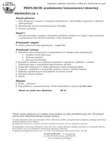 URODZINY, IMIENINY, ROCZNICA, CHRZCINY, SPOTKANIE do 6 godz. PRZYJĘCIE urodzinowe/imieninowe/chrzciny PROPOZYCJA 1 Danie główne: Filet drobiowy w sosie z suszonych pomidorów lub Zraziki wieprzowe z farszem staropolskim - Ziemniaczki puree z karmelizowaną cebulką - Zestaw surówek - Deser*: - Kruche pierożki z makiem skropione miodem, podane na ciepło z bitą śmietaną i cynamonem lub Torcik wiśniowy z bitą śmietaną Przekąski ciepłe: - Lekko pikantna zupa gulaszowa - węgierska Przekąski zimne: - Półmisek mięs pieczystych z marynatami (3 rodzaje mięs pieczonych): swojski schab pieczony, domowy pasztet, pieczona karkówka - Roladki ze śledzia na wiejskiej śmietanie z ogórkiem, jabłkiem i cebulą Tradycyjne jaja z majonezem garnirowane szynką - Pulpeciki wieprzowe w lekko pikantnej salsie meksykańskiej - Caprese – pomidory z mozarellą podane z pesto i świeżą bazylią - Sałatka z grillowanym kurczakiem w duecie sosów - Pieczywo jasne/ciemne - Masło Napoje: - Kawa / Herbata - Sok jabłkowy, pomarańczowy, Woda mineralna z cytryną (1 lit./os.) Koszt na osobę bez alkoholu: 99 zł *Deser można zamienić na 2 rodzaje ciasta podane na stole szwedzkim przy min. 20 osobach lub na torta okolicznościowego (naszego wypieku). W cenie przyjęcia ujęte jest wynajęcie Sali, dekoracja stołów, przygotowanie przyjęcia, obsługa kelnerska, obsługa przyjęcia do 6 godzin. Kompozycje kwiatowe z żywych kwiatów dodatkowo płatne lub we własnym zakresie. W przypadku wniesienia własnych ciast lub tortu należy doliczyć usługę serwisową w wysokości 2zł/os. W tej ofercie nie ma możliwości wniesienia własnego alkoholu. Propozycja przygotowana dla min. 15 osób. Przy mniejszej ilości gości koszt +(2-6)zł STARA KARCZMA ul. Traugutta 48 tel. (55) 235-05-05 lub kom. 668-504-999 www.starakarczma.elblag.pl URODZINY, IMIENINY, ROCZNICA, CHRZCINY, SPOTKANIE do 6 godz. PROPOZYCJA 2 Zupa: - Krem z pomidorów z lanymi kluseczkami lub Żur staropolski z jajkiem Danie główne: - Roladka drobiowa faszerowana warzywami podana na sosie porowym z opiekanymi ziemniakami i zestawem surówek lub - Karczek wieprzowy na aromatycznym sosem kminkowym z puree marchewkowym i sałatką Colesław Deser*: - Włoskie Tiramisu na bazie naturalnego biszkoptu, mascarpone i odrobiny alkoholu Przekąska ciepła: - Barszcz czerwony z kołdunami lub Grillowane szaszłyki drobiowe z bekonem i warzywami Przekąski zimne: - Półmisek swojskich wędlin z marynatami: swojski schab lub szynka karkówka wędzona swojskie kiełbasy i boczek - Łosoś marynowany w ginie z orientalnymi sosami - Rolada z boczku świeżego z grzybami leśnymi - Schab opiekany w kminku z nadzieniem śliwkowym lub Śledzie po cygańsku - Sałatka z rucolą, szynką parmeńską i brzoskwiniami lub Sałatka z polędwiczką na kompozycji sałat - Sałatka grecka z fetą i oliwkami na lodowej sałacie - Pieczywo jasne/ciemne - Masło Napoje: - Kawa / Herbata - Sok jabłkowy, pomarańczowy, Coca-Cola, Woda mineralna z cytryną (1,2 lit./os.) Koszt na osobę bez alkoholu: 107 zł *Deser można zamienić na 2 rodzaje ciasta podane na stole szwedzkim przy min. 20 osobach lub na torta okolicznościowego (naszego wypieku). W cenie przyjęcia ujęte jest wynajęcie Sali, dekoracja stołów, przygotowanie przyjęcia, obsługa kelnerska, obsługa przyjęcia do 6 godzin. Kompozycje kwiatowe z żywych kwiatów dodatkowo płatne lub we własnym zakresie. W przypadku wniesienia własnych ciast lub tortu należy doliczyć usługę serwisową w wysokości 2zł/os. W przypadku wniesienia własnego alkoholu należy doliczyć usługę serwisową w wysokości: 6zł/os. - 1 rodz. alkoholu, 8zł/os. – whisky, 10zł/os. – kilka rodz. alkoholu. Propozycja przygotowana dla min. 15 osób. Przy mniejszej ilości gości koszt +(2-6)zł STARA KARCZMA ul. Traugutta 48 tel. (55) 235-05-05 lub kom. 668-504-999 www.starakarczma.elblag.pl URODZINY, IMIENINY, ROCZNICA, CHRZCINY, SPOTKANIE do 6 godz. PROPOZYCJA 3 Zupa: - Rosół z wiejskiej kury z domowym makaronem Danie główne: - Kotlet drobiowy Cordon nadziewany serem i szynką z ziemniakami opiekanymi oraz bukietem sałat lub - Kieszeń ze schabu z pieczarkowym nadzieniem aromatyzowana białym winem z sosem leśnym z puree ziemniaczanym i duetem surówek Deser*: - Domowa szarlotka na ciepło podana z lodami waniliowymi i bitą śmietaną Przekąski ciepłe: - Smażone wiejskie pierogi z ziemniakami i boczkiem okraszone cebulką lub Żur staropolski podany z jajkiem i białą kiełbasą – proszę wybrać Przekąski zimne: - Półmisek mięs pieczystych z marynatami (3 rodzaje mięs pieczonych): roladka z kurczaka nadziewana czerwoną papryką i omletem z Rusollion swojski boczek pieczony lub schab ze śliwką pieczeń rzymska - Tymbaliki drobiowe ze złocistą kukurydzą lub Domowy smalec z ogórkiem kiszonym - Tradycyjny śledź w oleju z cebulką - Mini tartinki z tatara wołowego z ogórkiem, cebulką i marynowaną pieczarką - Caprese – pomidory z mozarellą podane z pesto i świeżą bazylią - Sałatka jarzynowa garnirowana szynką lub tradycyjnie po polsku - Sałatka Cezar z boczkiem, kurczakiem i grzankami - Sos czosnkowy - Pieczywo ciemne/jasne - Masło Napoje i ciasta: - Kawa / Herbata - Sok jabłkowy, pomarańczowy, Coca-Cola, Woda mineralna z cytryną (1,2 lit./os.) - Cista domowego wypieku (na stole szwedzkim): ciasto z karmelowym słonecznikiem lub wiśniowe z bitą śmietana domowa szarlotka oprószona cukrem Koszt na osobę: 115 zł *Deser można zamienić na tort okolicznościowy (naszego wypieku). W cenie przyjęcia ujęte jest wynajęcie Sali, dekoracja stołów, przygotowanie przyjęcia, obsługa kelnerska, obsługa przyjęcia do 6 godzin. Kompozycje kwiatowe z żywych kwiatów dodatkowo płatne lub we własnym zakresie. W przypadku wniesienia własnego alkoholu należy doliczyć usługę serwisową w wysokości: 6zł/os. - 1 rodz. alkoholu (wódka czysta lub wino), 8zł/os. – 1