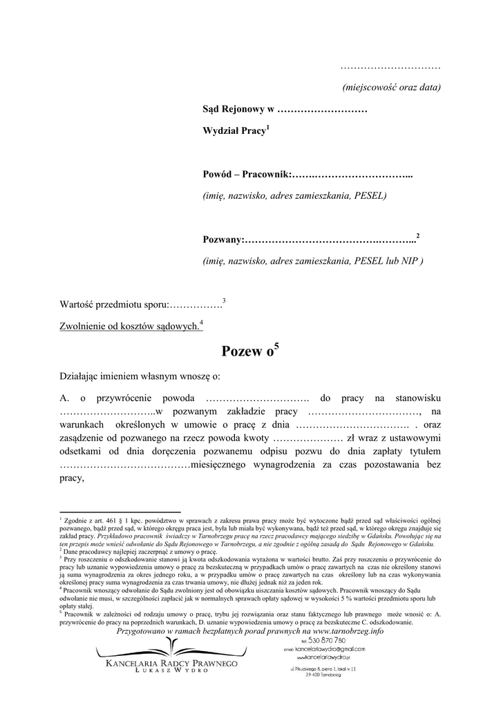………………………… (miejscowość oraz data) Sąd Rejonowy w ……………………… Wydział Pracy1 Powód – Pracownik:…….………………………... (imię, nazwisko, adres zamieszkania, PESEL) Pozwany:………………………………….………...2 (imię, nazwisko, adres zamieszkania, PESEL lub NIP ) Wartość przedmiotu sporu:…………….3 Zwolnienie od kosztów sądowych.4 Pozew o5 Działając imieniem własnym wnoszę o: A. o przywrócenie powoda …………………………. do pracy na stanowisku ………………………..w pozwanym zakładzie pracy ……………………………, na warunkach określonych w umowie o pracę z dnia ……………………………. . oraz zasądzenie od pozwanego na rzecz powoda kwoty ………………… zł wraz z ustawowymi odsetkami od dnia doręczenia pozwanemu odpisu pozwu do dnia zapłaty tytułem …………………………………miesięcznego wynagrodzenia za czas pozostawania bez pracy, Zgodnie z art. 461 § 1 kpc. powództwo w sprawach z zakresu prawa pracy może być wytoczone bądź przed sąd właściwości ogólnej pozwanego, bądź przed sąd, w którego okręgu praca jest, była lub miała być wykonywana, bądź też przed sąd, w którego okręgu znajduje się zakład pracy. Przykładowo pracownik świadczy w Tarnobrzegu pracę na rzecz pracodawcy mającego siedzibę w Gdańsku. Powołując się na ten przepis może wnieść odwołanie do Sądu Rejonowego w Tarnobrzegu, a nie zgodnie z ogólną zasadą do Sądu Rejonowego w Gdańsku. 2 Dane pracodawcy najlepiej zaczerpnąć z umowy o pracę. 3 Przy roszczeniu o odszkodowanie stanowi ją kwota odszkodowania wyrażona w wartości brutto. Zaś przy roszczeniu o przywrócenie do pracy lub uznanie wypowiedzenia umowy o pracę za bezskuteczną w przypadkach umów o pracę zawartych na czas nie określony stanowi ją suma wynagrodzenia za okres jednego roku, a w przypadku umów o pracę zawartych na czas określony lub na czas wykonywania określonej pracy suma wynagrodzenia za czas trwania umowy, nie dłużej jednak niż za jeden rok. 4 Pracownik wnoszący odwołanie do Sądu zwolniony jest od obowiązku uiszczania kosztów sądowych. Pracownik wnoszący do Sądu odwołanie nie musi, w szczególności zapłacić jak w normalnych sprawach opłaty sądowej w wysokości 5 % wartości przedmiotu sporu lub opłaty stałej. 5 Pracownik w zależności od rodzaju umowy o pracę, trybu jej rozwiązania oraz stanu faktycznego lub prawnego może wnosić o: A. przywrócenie do pracy na poprzednich warunkach, D. uznanie wypowiedzenia umowy o pracę za bezskuteczne C. odszkodowanie. 1 Przygotowano w ramach bezpłatnych porad prawnych na www.tarnobrzeg.info B. o uznanie za bezskuteczne oświadczenia pracodawcy …………………………….. z dnia …………………………………………. o rozwiązaniu umowy o pracę za wypowiedzeniem, C. zasądzenie od pozwanego na rzecz powoda kwoty …………… zł tytułem odszkodowania za ……………………… Ponadto wnoszę o przeprowadzenie rozprawy także pod nieobecność powoda oraz zasądzenie od pozwanego na rzecz powoda kosztów procesu, według norm przepisanych. Jednocześnie wnoszę o polecenie pozwanemu dostarczenia na rozprawę akt osobowych powoda będących w jego posiadaniu, niezbędnych do przeprowadzenia dowodu z dokumentów pracowniczych znajdujących się w aktach osobowych powoda - na okoliczność ich treści. Nadto wnoszę o ……………………………………………….6 dopuszczenie dowodu z UZASADNIENIE7 Z tych powodów pozew jest uzasadniony. ……………………….. (czytelny podpis pracownika) Załączniki: 1. dowody wskazane w treści pozwu, 2. odpis pozwu wraz z załącznikami dla pozwanego,8 6 W tym miejscu należy wymienić wszystkie dowodu jakie mają być dopuszczone i przeprowadzone przez Sąd. Świadkowie powinni być tak opisani, aby było możliwe ich wezwanie na rozprawę tj. imię, nazwisko, adres zamieszkania, ewentualnie telefon. 7 W uzasadnieniu pozwu pracownik musi opisać dlaczego odwołuję się do Sądu i opisać zawnioskowane dowody. 8 Pozew wraz załącznikami należy przygotować w 3 egzemplarzach. Dwa egzemplarze wnosi się do Sądu. Przygotowano w ramach bezpłatnych porad prawnych na www.tarnobrzeg.info