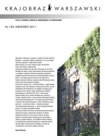 CZYLI O DAWNEJ GORZELNI DROŻDŻOWEJ W HENRYKOWIE Nr 120 WRZESIEŃ 2011 Mieszkaniec Warszawy, zapytany o zabytki na terenie dzielnicy Białołęka – najczęściej odpowie zdziwieniem, że w tej młodej dzielnicy mogą być w ogóle jakieś zabytki. Nawet spytany o to samo historyk sztuki, konserwator, może mieć kłopot z odpowiedzią. Zaskoczenie pojawia się, gdy pada informacja, że na terenie Białołęki jest jeden z pięciu warszawskich kościołów gotyckich i w dodatku z najlepiej zachowaną oryginalną substancją. Niedaleko kościoła stoi drewniany dwór Mostowskich z końca XVIII w. oraz klasycystyczna oficyna z początku XIX w. Nadto w obszarze dzielnicy są jeszcze dwa XIX-wieczne dwory i kilka innych interesujących zabytków. Pośród nich wyróżnia się – nie tylko kubaturą – zespół dawnej drożdżowni przy ulicy Klasyków. Ukryty pośród drzew, jest też niedostępny dla mieszkańców ze względu na trwającą tam produkcję. Jest to jeden z lepiej zachowanych zakładów przemysłowych z przełomu XIX i XX w. w Warszawie. Odegrał istotną rolę w dziejach Białołęki jako czynnik jej rozwoju. Zabytki techniki, z racji przemian technologii produkcji, często były przebudowywane. Ten zespół natomiast dotrwał w bardzo mało zmienionej postaci, a dom mieszkalny na jego terenie to – w granicach stolicy – unikatowy przykład willi fabrykanckiej zachowanej w prawie nieprzekształconej postaci. To ważny dla Białołęki zabytek. W ostatnich latach obserwuje się ciekawą tendencję szukania tożsamości poprzez społeczności skupione na jakimś konkretnym obszarze. Czy to wioski, miasta, ale także dzielnicy. Powstają lokalne stowarzyszenia, poszukujące wiedzy o dziejach dzielnicy, ich zabytkach. Mamy nadzieję, że przedstawiona publikacja spotka się z zainteresowaniem nie tylko takich stowarzyszeń w Białołęce, ale także jej mieszkańców i oczywiście włodarzy dzielnicy. Karol Guttmejer HENRYKÓW – DAWNA GORZELNIA DROŻDŻOWA W DZIELNICY BIAŁOŁĘKA. UNIKATOWY ZABYTEK PRZEMYSŁU W WARSZAWIE Lokalizacja ul. Klasyków 10, Warszawa-Białołęka Funkcja i właściciel terenu Teren przemysłowy należący do firmy Pollena-Aroma sp. z o.o. Folwark Dąbrówka w 1890 r.; źródło: APW w Warszawie Mapa topograficzna Warszawy i okolic z 1939 r.; źródło: AAN w Warszawie Fotoplan Warszawy z 1945 r. [dla czytelności fabrykę oznaczono białą strzałką]; źródło: APW w Warszawie Zabudowa Na działce o pow. ok. 3 ha zachowanych jest 8 budynków z lat 1902-1904, z których 4 przetrwały w stanie niemal niezmienionym i charakteryzują się wartościami zabytkowymi. Zabudowa dawnej gorzelni drożdżowej, położona w pobliżu ulicy Modlińskiej, głównej arterii komunikacyjnej dzielnicy Białołęka, zaskoczy warszawiaka po raz pierwszy odwiedzającego to miejsce. Harmonijnie zaprojektowany zespół fabryczny, który zachował się w niemal niezmienionej formie od 1904 r., pozostaje właściwie niewidoczny od strony ulicy Klasyków. Poszczególne budynki ukazują się stopniowo w miarę wędrówki w głąb działki fabrycznej. Dominantę gorzelni drożdżowej stanowi pięciokondygnacyjna bryła głównego budynku produkcyjnego, o surowych w wyrazie, ale dopracowanych pod względem detalu elewacjach z mocno wypalonej cegły. Nigdzie indziej w Warszawie nie zachował się tego typu zakład przemysłowy – konkurencyjna drożdżownia przy ulicy Przyokopowej na Woli uległa zniszczeniu podczas Powstaniu Warszawskiego. Sama nazwa obszaru dzielnicy Białołęka, w którym położona jest fabryka – Henryków – wywodzi się od imienia pierwszego właściciela gorzelni drożdżowej. Również przekształcenie okolicznych pól uprawnych w teren o charakterze miejskim rozpoczęło się dzięki jej gospodarczemu wpływowi. Dawna gorzelnia drożdżowa „Henryków” jest świadectwem, że Białołęka posiada własną historię rozwoju, niezależną od Warszawy, do której została w latach 50. XX w. przyłączona, a jej lokalna tożsamość wiąże się nierozerwalnie z przemysłem. Plan miejscowy Henrykowa, obecnie w opracowaniu, powinien uwzględnić rewitalizację unikatowego zespołu pofabrycznego. Rozwój przemysłu na Białołęce Lokalizację henrykowskiej fabryki, pierwszej i jedynej zachowanej do dziś gorzelni drożdżowej w okolicach Warszawy, wybrano nieprzypadkowo. Białołęka, zanim stała się dzielnicą Warszawy, była obszarem folwarcznym o bogatej tradycji rozwoju gospodarczego i przemysłowego, który zawdzięczała lokalnym przedsiębiorcom. Symboliczny początek tej tradycji wyznacza założenie w 1826 r. fabryki octu Ludwika Hirschmanna. Zakład przejęty przez Ludwika Spiessa i jego spadkobierców rozwijał się na tyle dynamicznie, że w 1897 r. produkował m.in. 2/3 octu wytwarzanego w całym Królestwie Polskim, i przetrwał do dzisiaj jako fabryka Polfa przy ulicy Płochocińskiej. Białołęka była rozwiniętym obszarem rolniczym, z licznymi gospodarstwami wielkoobszarowymi produkującymi na potrzeby Warszawy. Pod koniec XIX w. w północnej części Białołęki, na obszarze zwanym Winnicą, powstała fabryka produkująca przetwory chemiczne, natomiast przed 1904 r. założono niewielką fabrykę stolarską w Choszczówce. Plan sytuacyjny oraz przekrój urbanistyczny terenu fabryki, z rozwarstwieniem chronologicznym wg legendy Pierwotne budynki gorzelni drożdżowej wzniesione w latach 1902-1904 Rozbudowy budynków fabrycznych przed I Wojną Światową Rozbudowy budynków fabrycznych przed II Wojną Światową Okres 1952-1959 Okres 1959-1974 po 1974 r. Obiekty charakteryzujące się wartościami zabytkowymi Obiekty pozbawione wartości zabytkowych z powodu przebudowy elewacji i wnętrz Numeracja budynków oraz oznaczenie ich użytkowania Użytkowanie budynków: Funkcja produkcyjna/ techniczna Funkcja biurowa Funkcja magazynowa Funkcja pomocnicza/ gospodarcza Nieużytkowane Obiekty kubaturowe zamknięte Obiekty w konstrukcji