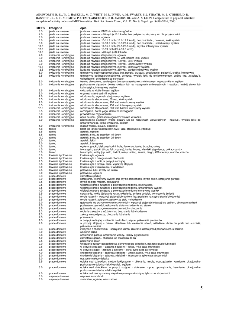 AINSWORTH, B. E,., W. L. HASKELL, M. C. WHITT, M. L. IRWIN, A. M. SWARTZ, S .J. STRATH, W. L. O’BRIEN, D. R. BASSETT, JR., K. H. SCHMITZ, P. O EMPLAINCOURT, D. R. JACOBS, JR., and A. S. LEON. Compendium of physical activities: an update of activity codes and MET intensities. Med. Sci. Sports Exerc., Vol. 32, No. 9, Suppl., pp. S498–S516, 2000. METS kategoria opis 8.5 4.0 8.0 6.0 8.0 10.0 12.0 16.0 7.0 3.0 5.5 7.0 10.5 12.5 8.0 3.5 jazda na rowerze jazda na rowerze jazda na rowerze jazda na rowerze jazda na rowerze jazda na rowerze jazda na rowerze jazda na rowerze ćwiczenia kondycyjne ćwiczenia kondycyjne ćwiczenia kondycyjne ćwiczenia kondycyjne ćwiczenia kondycyjne ćwiczenia kondycyjne ćwiczenia kondycyjne ćwiczenia kondycyjne 8.0 6.0 ćwiczenia kondycyjne ćwiczenia kondycyjne 5.5 9.0 7.0 3.5 7.0 8.5 12.0 2.5 6.0 4.0 3.0 ćwiczenia kondycyjne ćwiczenia kondycyjne ćwiczenia kondycyjne ćwiczenia kondycyjne ćwiczenia kondycyjne ćwiczenia kondycyjne ćwiczenia kondycyjne ćwiczenia kondycyjne ćwiczenia kondycyjne ćwiczenia kondycyjne ćwiczenia kondycyjne 1.0 4.8 6.5 8.5 10.0 5.0 7.0 4.5 4.5 3.0 3.0 4.0 2.5 3.5 6.0 2.5 5.0 3.3 3.0 3.5 2.5 3.5 4.0 2.5 2.3 2.5 2.0 2.5 2.5 2.3 2.3 2.3 1.5 2.0 ćwiczenia kondycyjne taniec taniec taniec taniec taniec taniec taniec taniec taniec łowienie i polowanie łowienie i polowanie łowienie i polowanie łowienie i polowanie łowienie i polowanie łowienie i polowanie łowienie i polowanie prace domowe prace domowe prace domowe prace domowe prace domowe prace domowe prace domowe prace domowe prace domowe prace domowe prace domowe prace domowe prace domowe prace domowe prace domowe prace domowe prace domowe 2.3 2.0 3.8 4.0 2.5 9.0 2.5 2.8 4.0 5.0 3.0 2.5 prace prace prace prace prace prace prace prace prace prace prace prace 3.0 prace domowe 4.0 3.0 3.0 prace domowe naprawy domowe naprawy domowe jazda na rowerze, BMX lub kolarstwo górskie jazda na rowerze, <10 mph (<16.1 km/h), bez pośpiechu, do pracy lub dla przyjemności jazda na rowerze, ogółem jazda na rowerze, 10-11.9 mph (16.1-19.2 km/h), bez pośpiechu, powolna, lekki wysiłek jazda na rowerze, 12-13.9 mph (19.3-22.4 km/h), bez pośpiechu, umiarkowany wysiłek jazda na rowerze, 14-15.9 mph (22.5-25.6 km/h), szybka, intensywny wysiłek jazda na rowerze, 16-19 mph (25.7-10.6 km/h), jazda na rowerze, >20 mph (>32.2 km/h), jazda na rowerze stacjonarnym, ogółem jazda na rowerze stacjonarnym, 50 wat, bardzo lekki wysiłek jazda na rowerze stacjonarnym, 100 wat, lekki wysiłek jazda na rowerze stacjonarnym, 150 wat, umiarkowany wysiłek jazda na rowerze stacjonarnym, 200 wat, intensywny wysiłek jazda na rowerze stacjonarnym, 250 wat, bardzo intensywny wysiłek gimnastyka ogólnosprawnościowa (np. pompki, brzuszki, podciąganie, pajacyki), cięŜka, intensywna gimnastyka ogólnosprawnościowa, domowa, wysiłek lekki do umiarkowanego, ogólna (np. „grzbiety”), wchodzenie i schodzenie po schodach trening obwodowy, zawierający ćwiczenia aerobowe z minimalnym wypoczynkiem, ogółem podnoszenie cięŜarów (wolne cięŜary lub na maszynach uniwersalnych i nautilus), trójbój siłowy lub kulturystyka, intensywny wysiłek ćwiczenia w klubie fitness, ogółem ergometr stair-treadmill, ogółem wiosłowanie, ergometr stacjonarny, ogółem wiosłowanie stacjonarne, 50 wat, lekki wysiłek wiosłowanie stacjonarne, 100 wat, umiarkowany wysiłek wiosłowanie stacjonarne, 150 wat, intensywny wysiłek wiosłowanie stacjonarne, 200 wat, bardzo intensywny wysiłek rozciąganie, hatha yoga, delikatne rozciąganie prowadzenie zajęć aerobiku aqua aerobik, gimnastyka ogólnorozwojowa w wodzie podnoszenie cięŜarów (wolne cięŜary lub na maszynach uniwersalnych i nautilus), wysiłek lekki do umiarkowanego, lekkie ćwiczenia, ogółem masaŜ wodny, jacuzzi, siedzenie balet lub taniec współczesny, twist, jazz, stepowanie, jitterbug aerobik, ogółem aerobik, step, ze stopniem 15-20cm aerobik, step, ze stopniem 25-30cm aerobik, lekki aerobik, intensywny ogółem, grecki, bliskowschodni, hula, flamenco, taniec brzucha, swing towarzyski, szybki (disco, folk, square), taniec linowy, irlandzki step dance, polka, country towarzyski, wolny (np. walc, foxtrot, wolny taniec), samba, tango, XIX-wieczny, mambo, chacha łowienie ryb, ogółem łowienie ryb z brzegu rzeki i chodzenie łowienie ryb z łódki, w pozycji siedzącej łowienie ryb z brzegu rzeki, w pozycji stojącej łowienie ryb w strumieniu, w woderach polowanie, łuk i strzały lub kusza polowanie, ogółem zamiatanie podług sprzątanie, intensywny wysiłek (np. mycie samochodu, mycie okien, sprzątanie garaŜu), mycie podłogi mopem, odkurzanie wielorakie prace związane z prowadzeniem domu, lekki wysiłek wielorakie prace związane z prowadzeniem domu, umiarkowany wysiłek wielorakie prace związane z prowadzeniem domu intensywny wysiłek sprzątanie, lekkie (ścieranie kurzy, układanie, zmiana pościeli, wynoszenie śmieci) mycie naczyń – w pozycji stojącej lub ogółem (bez podziału na części stania/chodzenia) mycie naczyń, zbieranie zastawy ze stołu – chodzenie gotowanie lub przygotowywanie Ŝywności – w pozycji stojącej/siedzącej lub ogółem, obsługa urządzeń podawanie Ŝywności, nakrywanie stołu – chodzenie lub stanie gotowanie lub przygotowywanie Ŝywności – chodzenie robienie zakupów z wózkiem lub bez, stanie lub chodzenie zakupy niespoŜywcze, chodzenie lub stanie prasowanie w pozycji siedzącej – robienie na drutach, szycie, pakowanie prezentów w pozycji stojącej – pranie, składanie lub wieszanie ubrań, wkładanie ubrań do pralki lub suszarki, pakowanie walizki związane z chodzeniem – sprzątanie ubrań, zbieranie ubrań przed pakowaniem, układanie ścielenie łóŜka szorowanie podług, szorowanie wanny, kabiny prysznicowej zamiatanie garaŜu, chodnika lub otoczenia domu podlewanie roślin wnoszenie rzeczy gospodarstwa domowego po schodach, noszenie pudeł lub mebli w pozycji siedz