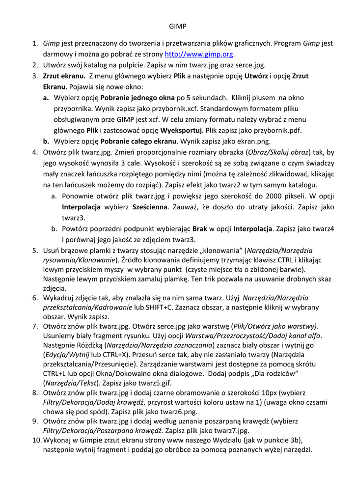 GIMP 1. Gimp jest przeznaczony do tworzenia i przetwarzania plików graficznych. Program Gimp jest darmowy i można go pobrać ze strony http://www.gimp.org. 2. Utwórz swój katalog na pulpicie. Zapisz w nim twarz.jpg oraz serce.jpg. 3. Zrzut ekranu. Z menu głównego wybierz Plik a następnie opcję Utwórz i opcję Zrzut Ekranu. Pojawia się nowe okno: a. Wybierz opcję Pobranie jednego okna po 5 sekundach. Kliknij plusem na okno przybornika. Wynik zapisz jako przybornik.xcf. Standardowym formatem pliku obsługiwanym prze GIMP jest xcf. W celu zmiany formatu należy wybrać z menu głównego Plik i zastosować opcję Wyeksportuj. Plik zapisz jako przybornik.pdf. b. Wybierz opcję Pobranie całego ekranu. Wynik zapisz jako ekran.png. 4. Otwórz plik twarz.jpg. Zmień proporcjonalnie rozmiary obrazka (Obraz/Skaluj obraz) tak, by jego wysokość wynosiła 3 cale. Wysokość i szerokość są ze sobą związane o czym świadczy mały znaczek łańcuszka rozpiętego pomiędzy nimi (można tę zależność zlikwidować, klikając na ten łańcuszek możemy do rozpiąć). Zapisz efekt jako twarz2 w tym samym katalogu. a. Ponownie otwórz plik twarz.jpg i powiększ jego szerokość do 2000 pikseli. W opcji Interpolacja wybierz Sześcienna. Zauważ, że doszło do utraty jakości. Zapisz jako twarz3. b. Powtórz poprzedni podpunkt wybierając Brak w opcji Interpolacja. Zapisz jako twarz4 i porównaj jego jakość ze zdjęciem twarz3. 5. Usuń brązowe plamki z twarzy stosując narzędzie „klonowania” (Narzędzia/Narzędzia rysowania/Klonowanie). Źródło klonowania definiujemy trzymając klawisz CTRL i klikając lewym przyciskiem myszy w wybrany punkt (czyste miejsce tła o zbliżonej barwie). Następnie lewym przyciskiem zamaluj plamkę. Ten trik pozwala na usuwanie drobnych skaz zdjęcia. 6. Wykadruj zdjęcie tak, aby znalazła się na nim sama twarz. Użyj Narzędzia/Narzędzia przekształcania/Kadrowanie lub SHIFT+C. Zaznacz obszar, a następnie kliknij w wybrany obszar. Wynik zapisz. 7. Otwórz znów plik twarz.jpg. Otwórz serce.jpg jako warstwę (Plik/Otwórz jako warstwy). Usuniemy biały fragment rysunku. Użyj opcji Warstwa/Przezroczystość/Dodaj kanał alfa. Następnie Różdżką (Narzędzia/Narzędzia zaznaczania) zaznacz biały obszar i wytnij go (Edycja/Wytnij lub CTRL+X). Przesuń serce tak, aby nie zasłaniało twarzy (Narzędzia przekształcania/Przesunięcie). Zarządzanie warstwami jest dostępne za pomocą skrótu CTRL+L lub opcji Okna/Dokowalne okna dialogowe. Dodaj podpis „Dla rodziców” (Narzędzia/Tekst). Zapisz jako twarz5.gif. 8. Otwórz znów plik twarz.jpg i dodaj czarne obramowanie o szerokości 10px (wybierz Filtry/Dekoracja/Dodaj krawędź, przyrost wartości koloru ustaw na 1) (uwaga okno czsami chowa się pod spód). Zapisz plik jako twarz6.png. 9. Otwórz znów plik twarz.jpg i dodaj według uznania poszarpaną krawędź (wybierz Filtry/Dekoracja/Poszarpana krawędź. Zapisz plik jako twarz7.jpg. 10. Wykonaj w Gimpie zrzut ekranu strony www naszego Wydziału (jak w punkcie 3b), następnie wytnij fragment i poddaj go obróbce za pomocą poznanych wyżej narzędzi.
