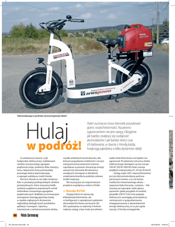 Taka hulajnoga w podróży caravaningowej? Ideał! Hulaj w podróż! O unikatowym duecie, czyli hulajnodze elektrycznej i walizkowym modelu turystycznego agregatu prądotwórczego, pisaliśmy kilka miesięcy temu. Najnowsze testy potwierdziły przewagę Hulera doposażonego w agregat walizkowy marki Honda. Koncern Honda to nie tylko światowy lider w produkcji profesjonalnych silników przemysłowych, które stanowią źródło zasilania wyjątkowo popularnych wśród miłośników caravaningu agregatów prądotwórczych. Nakłady na innowacyjne rozwiązania stawiają japońską markę w rzędzie najlepszych dostawców najbardziej ekologicznych produktów, aplikacji i rozwiązań. Japońscy inżynierowie z zainteresowaniem śledzą Huler wyznacza nowy kierunek poszukiwań granic wszechstronności. Na pewno ograniczeniem nie jest zasięg. Obojętnie jak bardzo zwiększy się wydajność akumulatorów i jak bardzo skróci czas ich ładowania, w duecie z Hondą każdą hulajnogą zajedziesz o kilka dystansów dalej! wysiłki ambitnych konstruktorów, dla których pogodzenie mobilności i niczym nieograniczonej autonomii stanowi największe wyzwanie. Konwersja energii zawsze też stanowiła dla dostawcy wiodących rozwiązań w dziedzinie zwiększenia komfortu podróży ciekawe źródło inspiracji. Nie inaczej jest we wspomnianym projekcie współpracy rodem z Polski. + Honda EU10i Zasięg Hulera to zazwyczaj kilkadziesiąt kilometrów, ale w konfiguracji z największym pakietem akumulatorów litowo-jonowych (20 Ah) uzyskujemy co najmniej 3-krotnie większy zasięg, a być może już wkrótce żaden limit kilometrów nie będzie nas ograniczał. W zależności od mocy silnika elektrycznego (dostępne są trzy wersje: 250 W, 550 W i 850 W) Huler rozwija prędkość maksymalną 25, 35 lub 45 km/h. - Zasięg rzędu 250 i więcej kilometrów jest już dziś potwierdzony podczas pierwszych testów, a to nie koniec możliwości niesamowitego duetu – zapewnia Kuba Karwata, creatoria. – Nie musimy już zaprzątać sobie głowy pytaniem: gdzie przyjdzie mi znaleźć gniazdko 230 V? O ile inne pojazdy elektryczne wymagają od posiadaczy roztropności w gospodarowaniu zmagazynowanej w akumulatorach energii elektrycznej, to tu jest zgoła inaczej. Z Hondą na bagażniku 44 PC_59-nowe linki.indd 44 2013-08-23 14:06:12 wieści z warsztatu użytkownik takiego Hulera nie musi też oczywiście na czas ładowania sprzętu rezygnować z dalszej jazdy, co jest przecież największą chyba barierą dla popularyzacji mobilności w wydaniu tylko elektrycznym. W chwili rozładowania akumulatorów, w Hulerze wystarczy uruchomić agregat marki Honda, a ten nie tylko naładuje akumulator hulajnogi, ale w tym samym czasie będzie stanowił dla nas źródło napędu! Jak to możliwe? Walizkowy model EU 10i umocowany jest na bagażniku, skąd w każdej chwili można go oczywiście zdjąć, ale nie tu tkwi tajemnica konwersji hulajnogi elektrycznej w pojazd hybrydowy. Wyprofilowany bagażnik pełni jednocześnie rolę stacji dokującej dla agregatu marki Honda; skrywa ładowarkę i zasilacz marki EMERSON – lidera na rynku zasilania bezprzerwowego. - Największe wrażenie robi fakt, że agregat prądotwórczy marki Honda zachowuje się w trybie pracy „ładowania akumulatorów i jednocześnie jazdy” jak rasowy silnik! – dzieli się wrażeniami z jazdy Kuba Karwata. - Odkręcenie manetki skutkuje żywą reakcją hulajnogi, PC_59-nowe linki.indd 45 Z Hondą na pokładzie zajedziesz dalej i to ekologicznie! która znakomicie przyspiesza, co daje się odczuć po zwiększonym obciążeniu agregatu. Wszystko do czasu uzyskania pożądanej prędkości, by po chwili Honda EU 10i powróciła do trybu pracy „jałowego biegu”, czyli jest tak cicha, jak chciał tego producent, co potwierdzi każdy fan caravaningu! Huler w wersji hybrydowej, czyli doposażony w specjalnej konstrukcji bagażnik, do którego mocujemy ściągaczami agregat marki Honda, wzbudził już spore zainteresowanie fanów rekrutujących się nie tylko ze środowiska caravaningowego. Prezentowany był w kraju na kilku 2013-08-23 14:06:18 wieści z warsztatu Huler w pięknym towarzystwie... imprezach branżowych, m.in. w Kielcach na Międzynarodowej Wystawie Ratownictwa i Techniki Przeciwpożarowej EDURA 2013, jak również podczas Mistrzostw Świata w Siatkówce Plażowej Mazury 2013 w Starych Jabłonkach. Dobry zestaw W przeciwieństwie do wielu jednośladów elektrycznych, nisko położony środek ciężkości gwarantuje hulajnodze o niebo lepszą dzielność w terenie nieutwardzonym. Hulerowi niestraszny jest kopny śnieg czy piaszczyste podłoże. Dowieźć butlę gazową na kemping czy skrzynkę... bezalkoholowego? Dla hulajnogi żaden problem! W porównaniu z rowerem klasycznym, wyeliminowany został nie tylko dyskomfort związany ze zmęczeniem czy uczuciem nieświeżości po wysiłku fizycznym. Wygrywa też ze skuterem (także elektrycznym) niższą masą, co pozostaje nie bez znaczenia dla nas. Najlżejszy Huler waży niecałe 38 kg, a w wersji przygotowanej do dokowania agregatu raptem kilka kg więcej. - Przewaga naszej hybrydy tkwi w niczym niemal nieograniczonej autonomii – mówi Kuba Karwata. – O ile bowiem zasięg elektrycznych jednośladów ograniczony będzie zawsze momentem od jednego do kolejnego ładowania, to nasz sprzęt z Hondą na bagażniku będzie zawsze gotów przynajmniej potroić ten dystans! Mnie osobiście cieszy fakt, że mogłem dzięki współpracy z firmą Aries Power Equipment – Generalnym Przedstawicielem koncernu Honda Co. Ltd. w Polsce, zrealizować tak śmiały zamysł. Walizkowy model EU 10i jak żaden inny nadaje się do współpracy z hulajnogą elektryczną. Jego niska masa i wystarczająca moc gwarantuje optymalne wykorzystanie energii elektrycznej. Unikalna ekonomika agregatu to przecież aż pięć godzin nieprzerwanej pracy. Skoro więc ładowanie akumulatorów trwa równo dwie i pół godziny, to