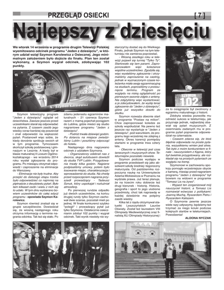PRZEGLĄD OSIECKI [7] Najlepszy z dziesięciu We wtorek 14 września w programie drugim Telewizji Polskiej wyemitowano odcinek programu "Jeden z dziesięciu", w którym udział wziął Szymon Karolewicz z Osiecznej. Jego minimalnym założeniem było dojście do finału. Plan ten został wykonany, a Szymon wygrał odcinek, zdobywając 102 punkty. Szymon telewizyjny program "Jeden z dziesięciu" oglądał od dzieciństwa. Zawsze jeszcze przed uczestnikami starał się odpowiadać na pytania. Z czasem zasób jego wiedzy coraz bardziej się poszerzał i znał odpowiedzi na większość pytań. Postanowił więc sobie, że kiedy dorośnie spróbuje swoich sił w tym programie. Tymczasem skończył szkołę podstawową i gimnazjum w Lesznie. A kiedy był w klasie maturalnej II Liceum Ogólnokształcącego - we wrześniu 2014 roku wysłał zgłoszenie do programu. Po miesiącu otrzymał odpowiedź i zaproszenie na eliminacje do Warszawy. - Eliminacje nie były trudne. Aby przejść do dalszego etapu trzeba było odpowiedzieć co najmniej na piętnaście z dwudziestu pytań. Było tam kilkaset osób i wielu z nich się to udało. W tym dniu wybierano bowiem uczestników do całej edycji programu - opowiada Szymon Karolewicz. Szymon również znalazł się w grupie szczęśliwców. Dowiedział się, że wiosną następnego roku otrzyma informację o terminie nagrania odcinka. Tak też się stało. Po zdaniu jedenastu egzaminów maturalnych - 21 czerwca Szymon razem z mamą pojechał pociągiem do Lublina, gdzie mieści się studio nagraniowe programu "Jeden z dziesięciu". - Podróż trwała dziewięć godzin. Po dotarciu na miejsce zwiedziliśmy Lublin i poszliśmy odpocząć do hotelu. Następnego dnia nagrywano odcinek z udziałem Szymona. - Organizatorzy odebrali nas z dworca, skąd autobusem dowieźli do studia TVP Lublin. Przygotowania trwały kilka godzin. Najpierw podpisaliśmy umowy, potem było losowanie miejsc, charakteryzacja i wprowadzenie do studia. Na chwilę przed rozpoczęciem nagrania przyszedł prowadzący - Tadeusz Sznuk, który uspokajał i rozluźniał atmosferę. Po pierwszej rundzie odpadło już dwóch uczestników, na końcu drugiej rundy tylko Szymon zachował dwie szanse, pozostali mieli po jednej. W finale konkurenci szybko "polegli" i prowadzący pytał już tylko Szymona. Ostatecznie osiecznianin zdobył 102 punkty i wygrał odcinek. Taki wynik niestety nie wy- starczył by dostać się do Wielkiego Finału, jednak Szymon na tym teleturnieju nie zamierza poprzestać. - Wiosną zeszłego roku w telewizji pojawił się turniej "Tylko Ty". Startowało się tam parami. Zaproponowałem więc koleżance wspólne uczestnictwo. Zgodziła się, więc wysłaliśmy zgłoszenie i otrzymaliśmy zaproszenie na casting, jednak w wyznaczonym czasie koleżanka miała sesję egzaminacyjną na studiach, poprosiliśmy o przesunięcie terminu. Program ze względu na niską oglądalność po pierwszym sezonie zdjęto z anteny. Nie zdążyliśmy więc wystartować, a ja zdecydowałem, że wyślę teraz zgłoszenie do "Jeden z dziesięciu", gdzie już wszystko doszło do skutku. Szymon rozważa obecnie start w programie "Postaw na milion". Chce zaproponować koledze ze szkoły współudział. Na pewno też jeszcze raz wystartuje w "Jeden z dziesięciu", pod warunkiem, że programu tego wcześniej nie zdejmą z anteny. Okres karencji pomiędzy startami w programie trwa cztery lata. - Obecnie w telewizji jest czas tanecznych i muzycznych show. Teleturniejów pozostało niewiele. Szymon podczas występu w programie przedstawił się jako absolwent szkoły średniej i tegoroczny maturzysta. Od października rozpoczyna naukę na Uniwersytecie Adama Mickiewicza w Poznaniu na wydziale prawa. Już teraz planuje, że na trzecim roku dobierze też drugi kierunek - historię. Historia, geografia i sport to jego ulubione przedmioty, choć tak naprawdę w każdej dziedzinie ma potężny zasób wiedzy. Kilka lat z rzędu otrzymywał statuetki Leszczyńskich Laurów Oświaty. Został też laureatem VIII Olimpiady Mediewistycznej oraz finalistą XLI Olimpiady Historycznej i za to osiągnięcie był zwolniony z egzaminu maturalnego z historii. Zdobyta wiedza pozwoliła mu odnieść sukces w teleturnieju, jak przyznaje jednak, najbardziej obawiał się pytań muzycznych. Z osiemnastu zadanych mu w programie pytań poprawnie odpowiedział na czternaście. - Czasem zdarza się, że ktoś błędnie odpowiada na proste pytania, wszystkiemu winien jest stres. Tak było z moim konkurentem w finale - nauczycielem z Kępna, który był świetnie przygotowany, ale rozkładał się na prostych pytaniach ze względu na tremę. Szymonowi w zachowaniu spokoju pomogło wcześniejsze obycie z kamerą, miesiąc przed nagraniem programu "Jeden z dziesięciu" był bowiem na widowni w programie "Tomasz Lis na żywo". - Wyjazd ten zorganizował mój nauczyciel historii, a Tomasz Lis rozmawiał wówczas z politykami: Joanną Muchą, Ryszardem Petru i Ryszardem Kaliszem. O Szymonie pewnie jeszcze wiele razy usłyszymy, będziemy też trzymać za niego kciuki podczas kolejnych startów w teleturniejach. Powodzenia! ALDONA NYCZAK